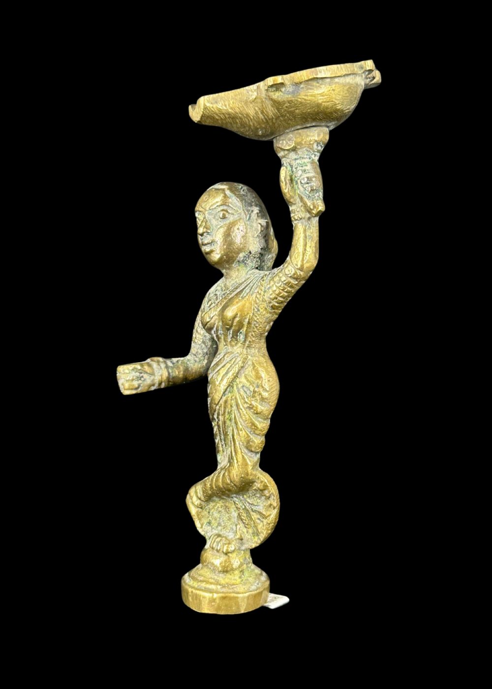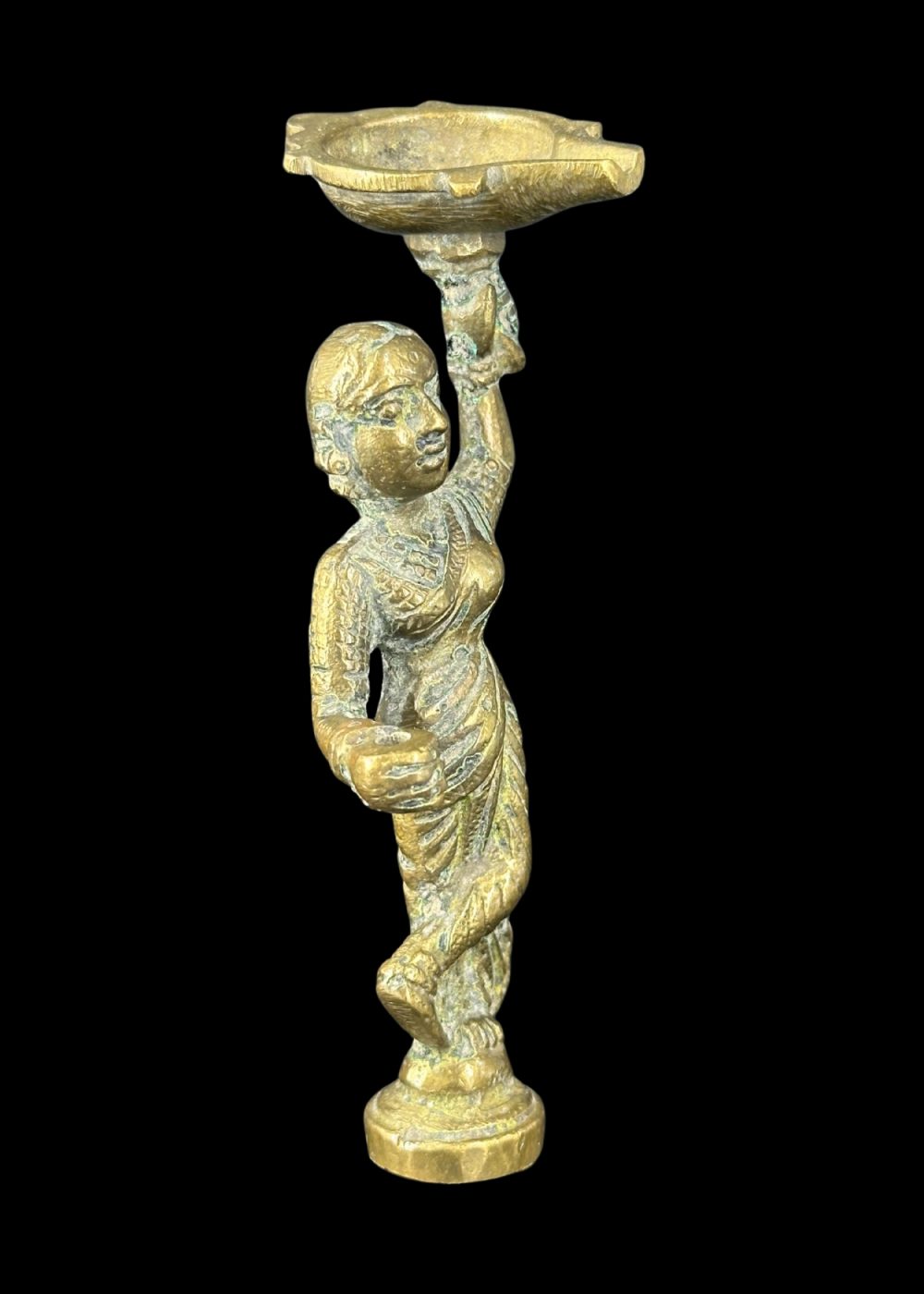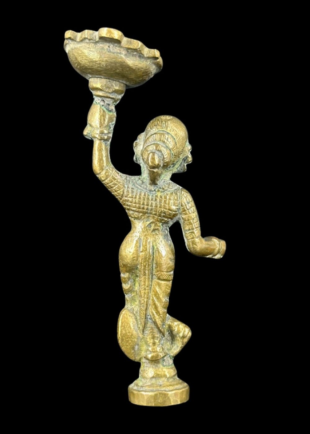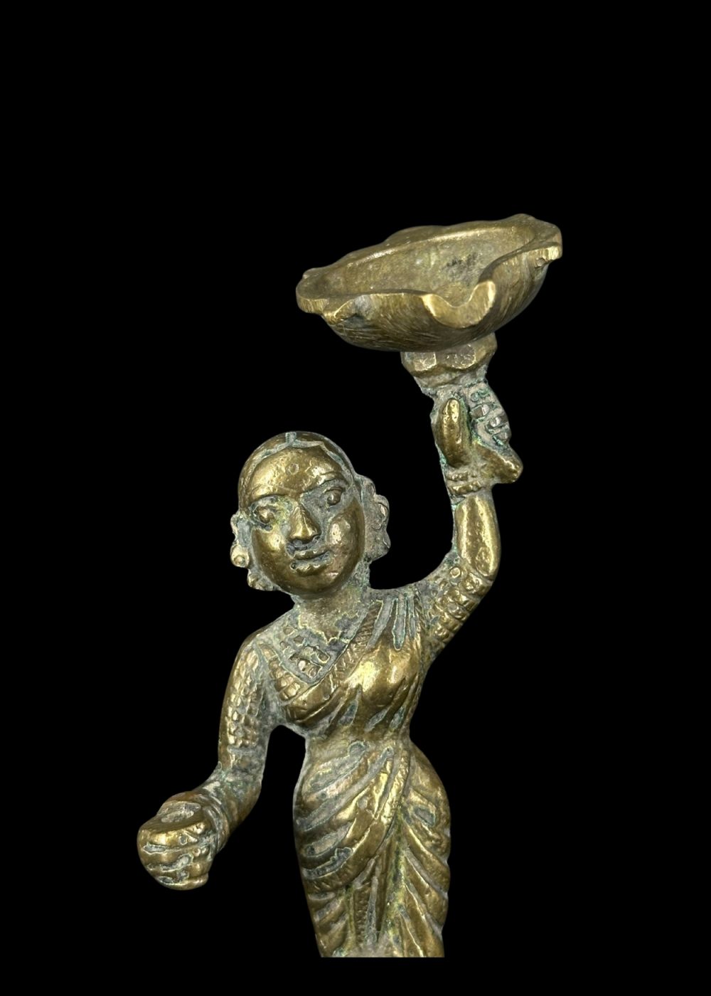This bronze sculpture portrays a standing figure gracefully presenting a diya (oil lamp) in an outstretched hand, symbolizing light and devotion. The figure is adorned with stylized drapery and stands atop a circular pedestal, suggesting ceremonial use. The diya, with its shallow bowl and flared rim, is rendered with precision, emphasizing its ritual significance. The work reflects traditional South Asian metalcasting techniques and devotional artistry.