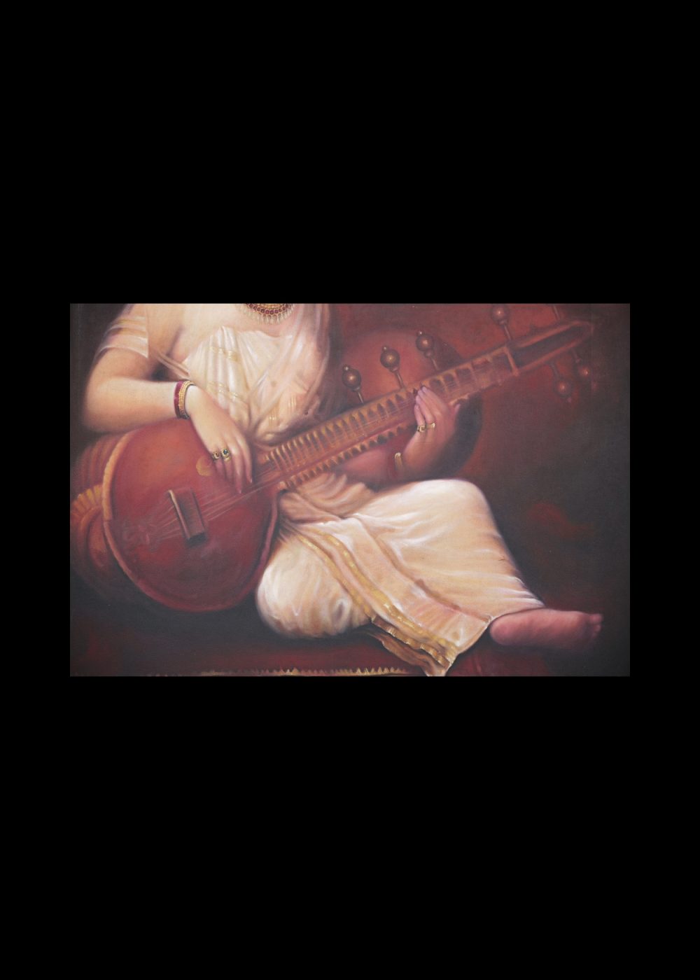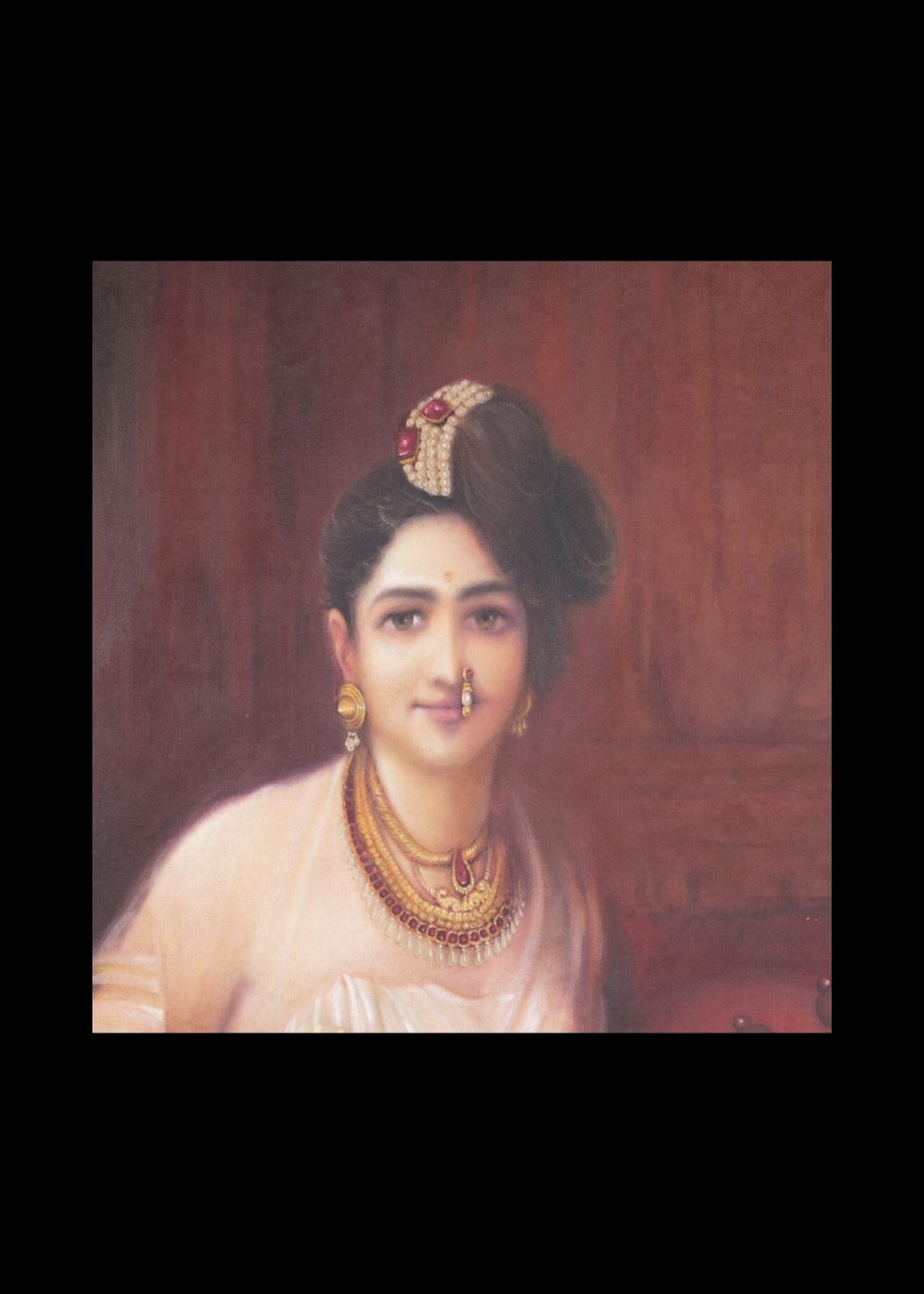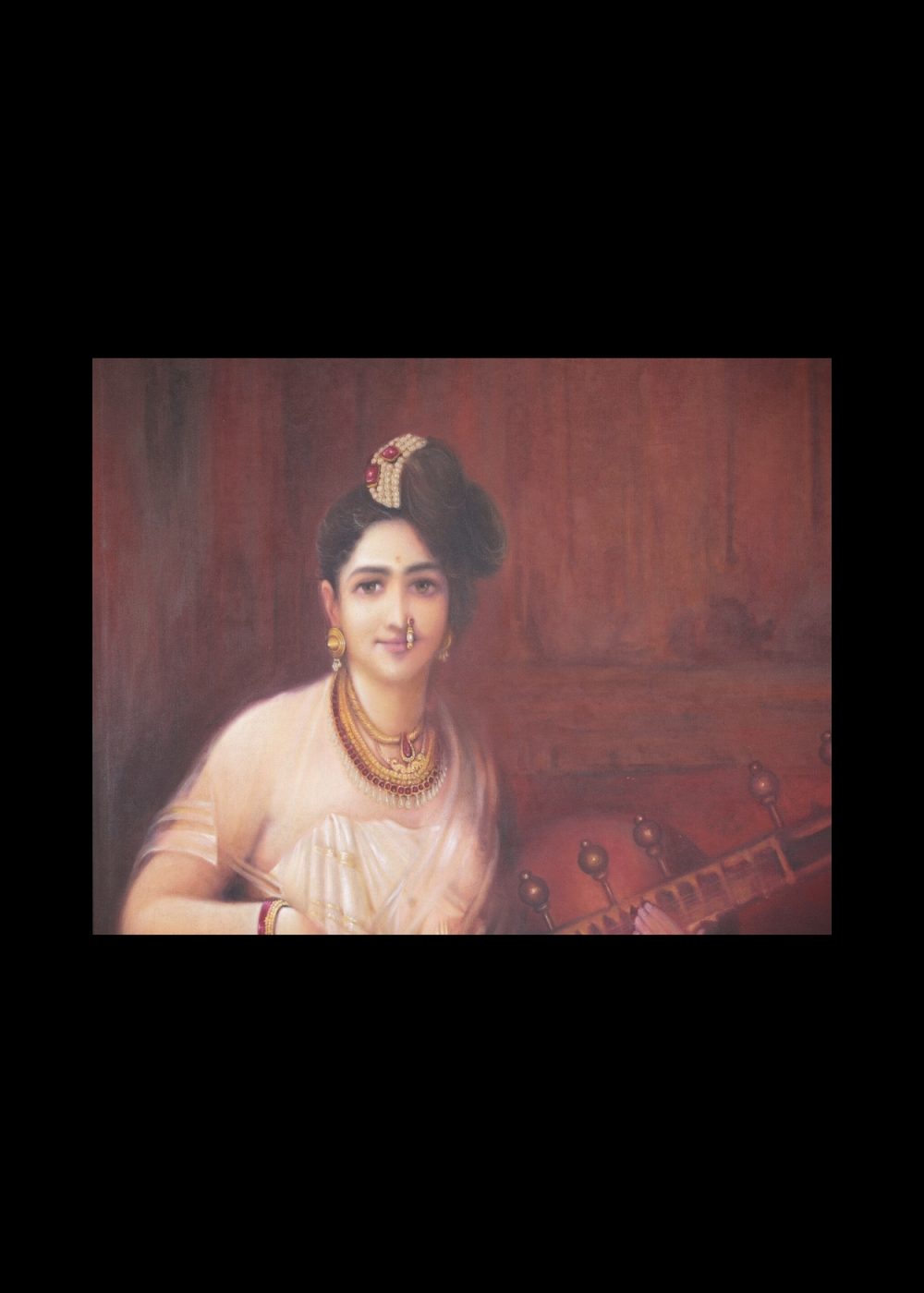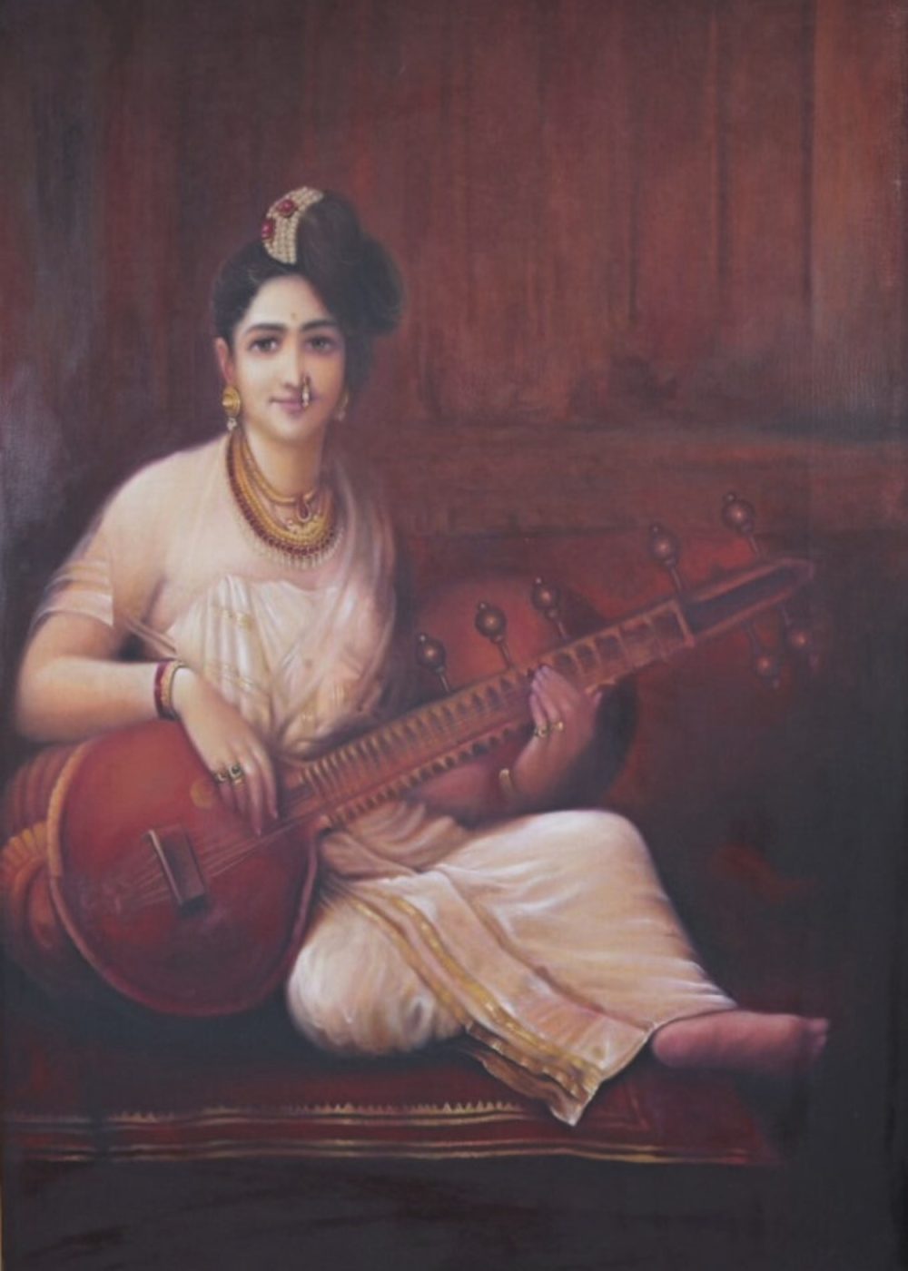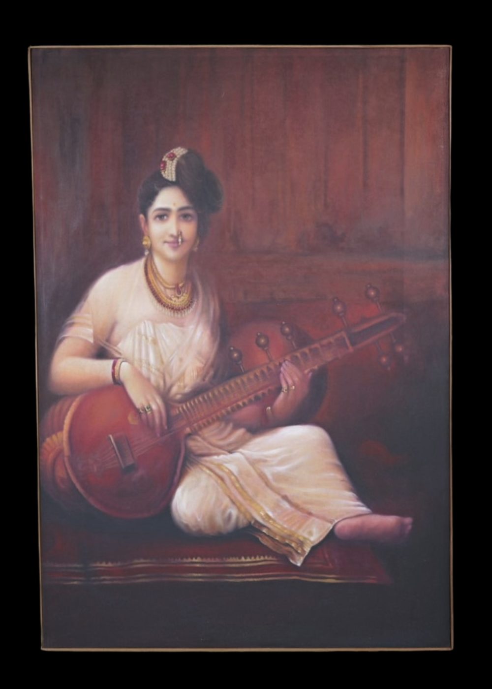 This elegant oleograph-style painting captures a graceful Indian woman seated with a veena, exuding poise and cultural refinement. Dressed in a traditional cream and gold sari, adorned with classic South Indian jewelry, and set against a warm-toned interior, the composition reflects early 20th-century Indian portraiture. The woman’s serene expression and dignified posture embody the harmony between art, music, and feminine grace. This artwork likely pays homage to the idealized image of the cultured Indian woman, commonly depicted during the Raja Ravi Varma era.