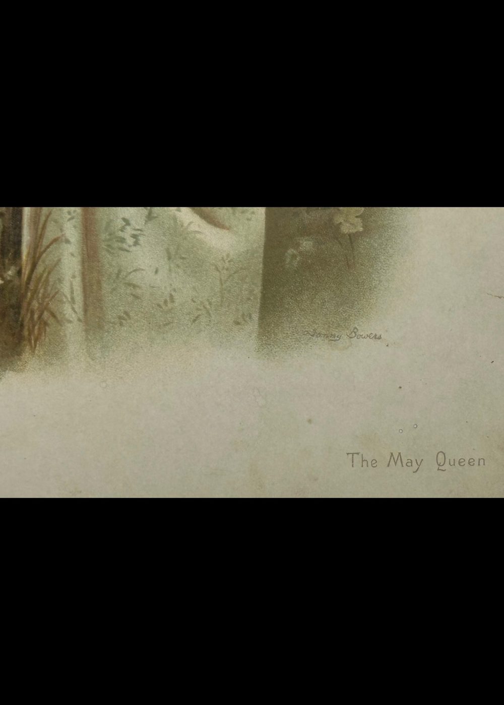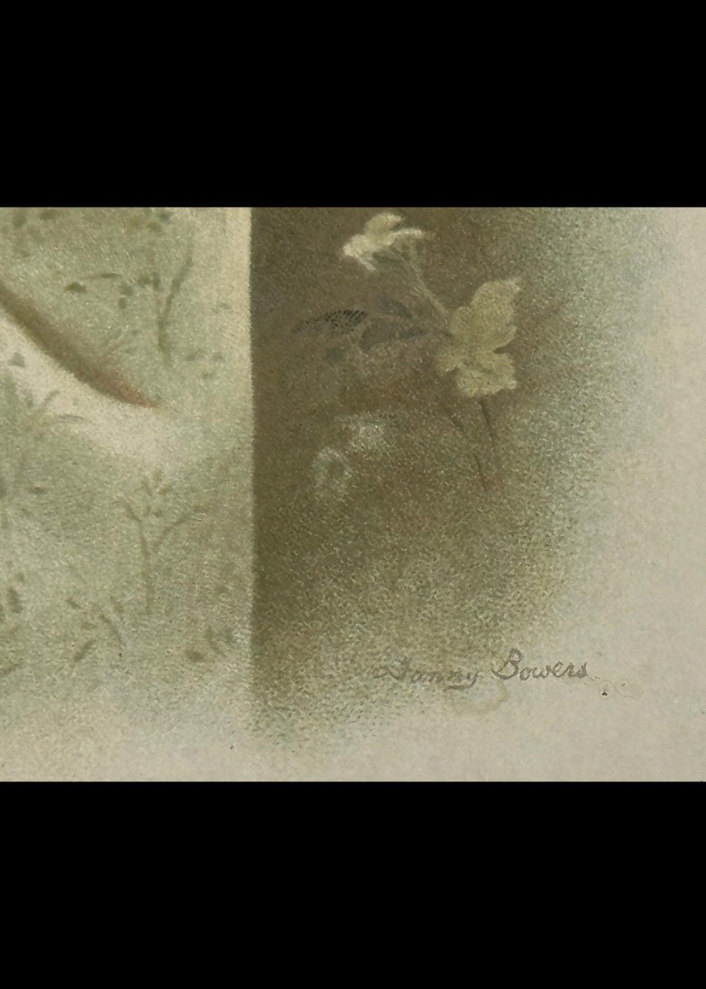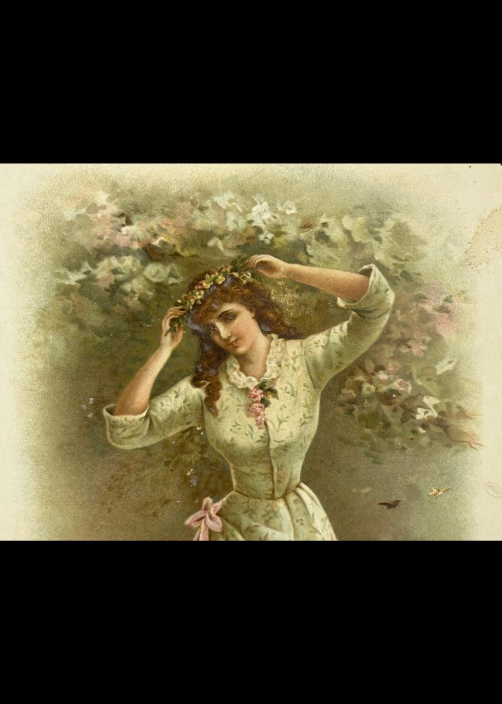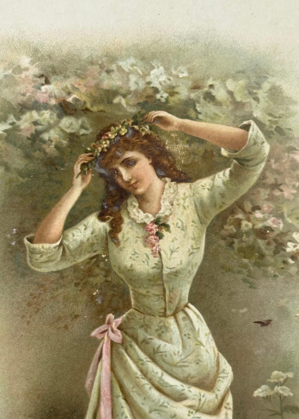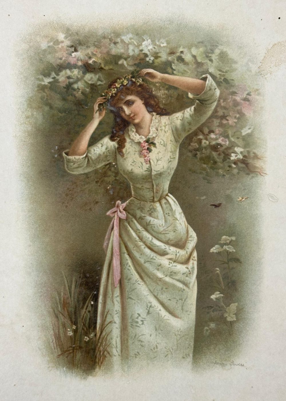 This elegant oleograph painting by Henry Bowser captures the timeless charm of a young woman gently placing a floral crown upon her head. Dressed in a delicately patterned gown with a soft pink ribbon at her waist, she stands amidst a lush, flowering garden. Her serene expression and graceful posture reflect the romantic ideal of femininity during the Victorian era. The soft, diffused tones and meticulous detail give the image a dreamlike quality. Printed using the oleograph technique—popular in the late 1800s—this artwork replicates the texture and richness of an oil painting, offering an accessible yet refined decorative piece rooted in classical aesthetics.
