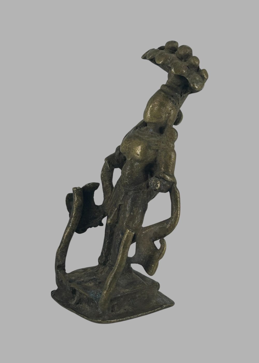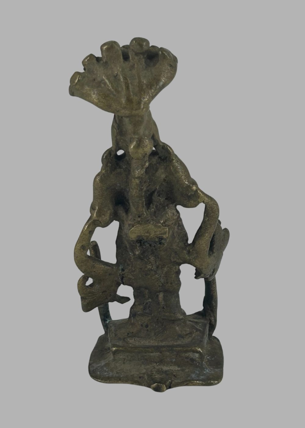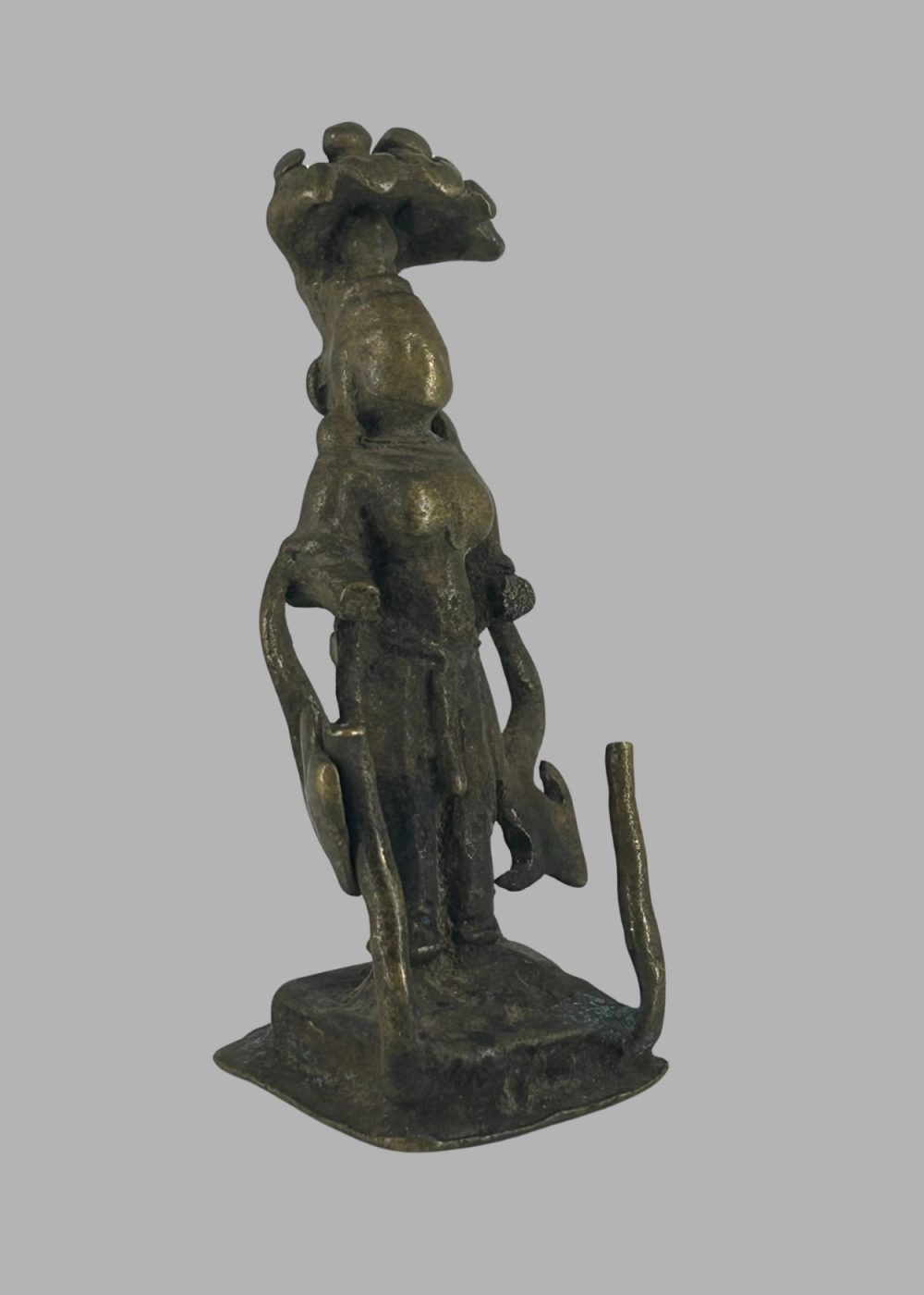 This brass figure from Gujarat depicts a lady holding a lamp, symbolizing light, knowledge, and auspiciousness. The woman stands gracefully with an elaborate headdress, possibly a canopy or decorative lamp support, enhancing her ritualistic presence. The sculpture reflects traditional Gujarati folk art, emphasizing utility and spirituality, likely used in domestic or temple settings during religious ceremonies. The simplistic form and stylized features highlight the regional craftsmanship and cultural aesthetic of the period.