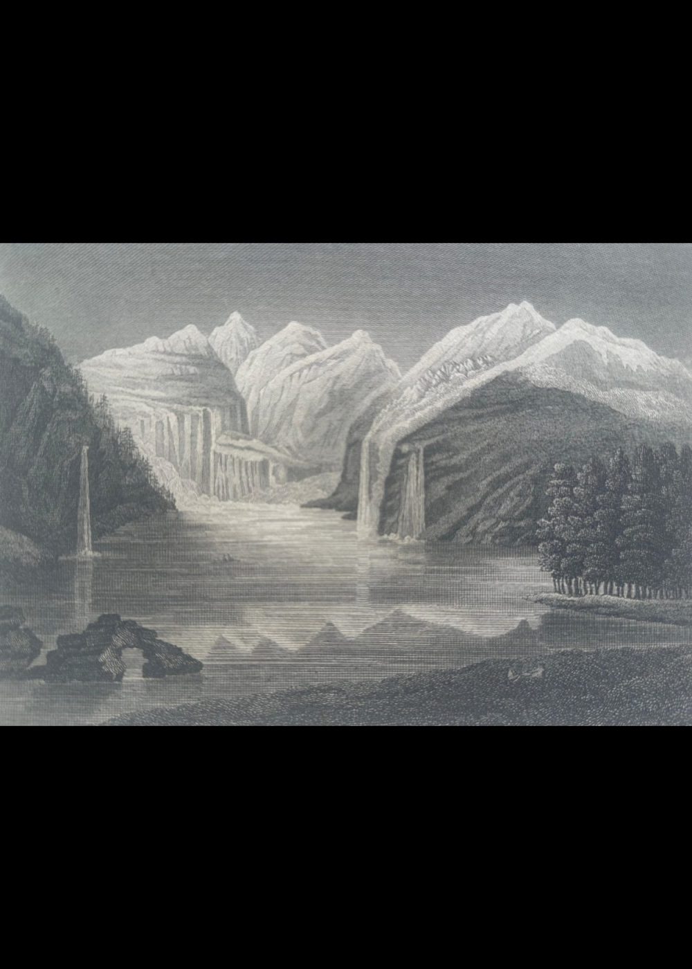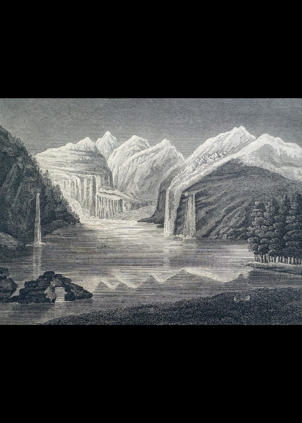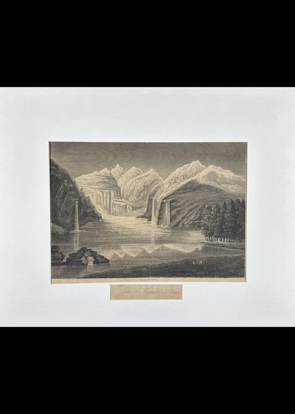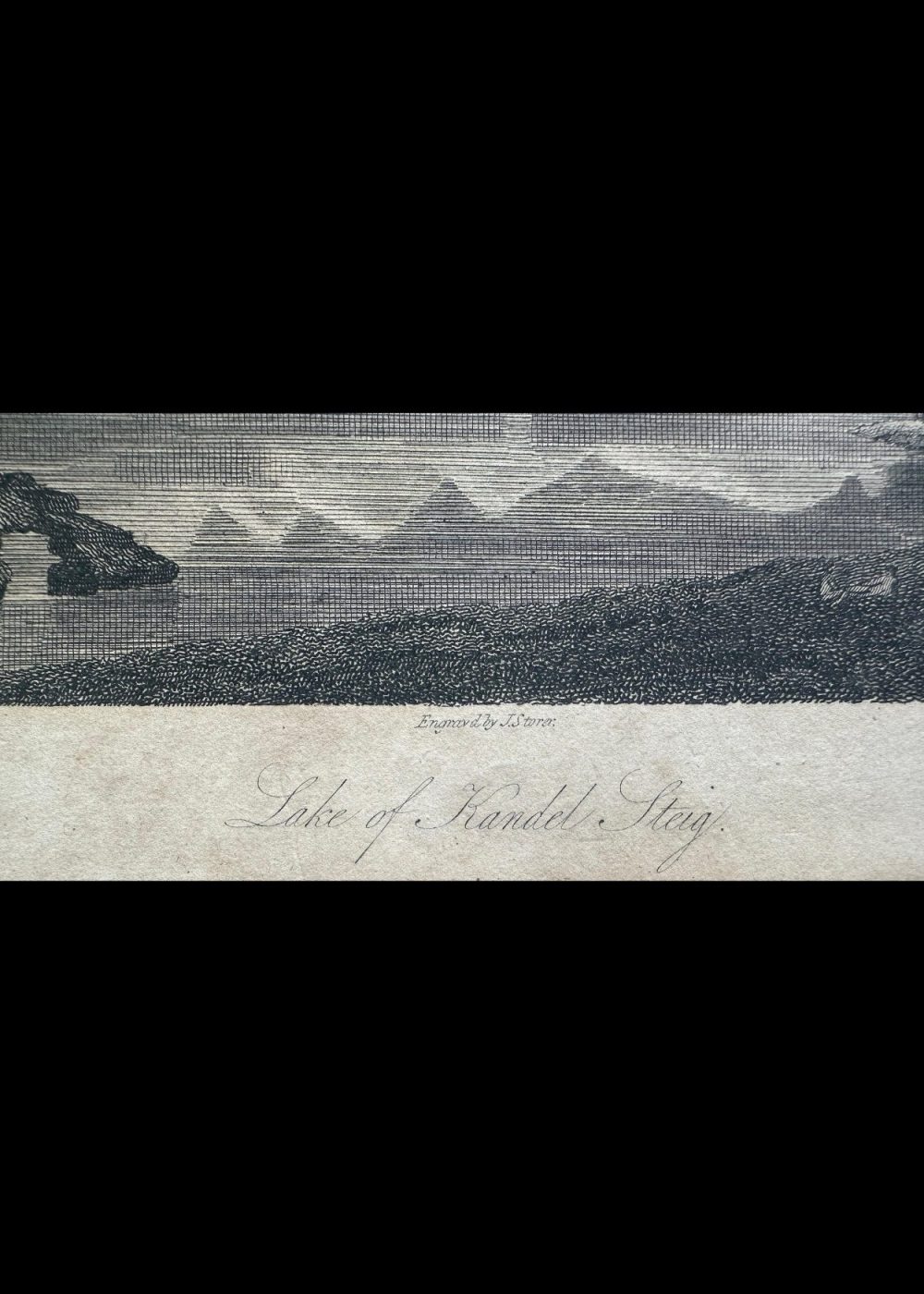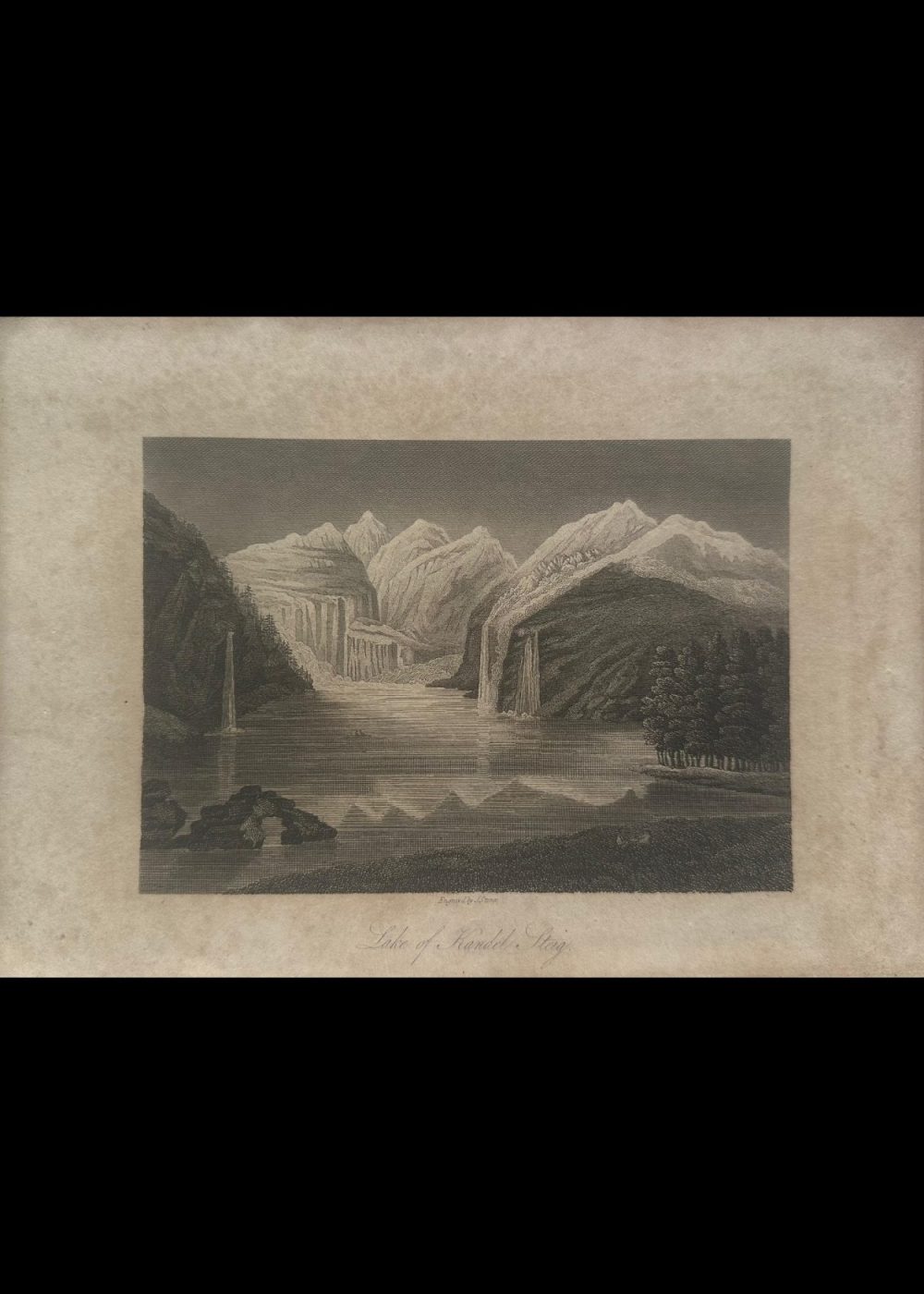 This is a vintage engraved landscape titled “Lake of Kandel, Staz”, created by an artist and engraved by someone named J. Storer. The scene depicts a serene alpine lake surrounded by dramatic mountain peaks and cascading waterfalls. The engraving captures the grandeur of nature with intricate detailing — towering cliffs, sharp ridges of snow-capped mountains, and lush forests frame the reflective waters of the lake. In the foreground, rocky formations and a small wooded area add depth to the composition. The water’s surface beautifully mirrors the surrounding landscape, enhancing the sense of tranquility and isolation. This romanticized depiction reflects 19th-century European landscape art, emphasizing sublime natural beauty and dramatic contrasts in light and texture.
