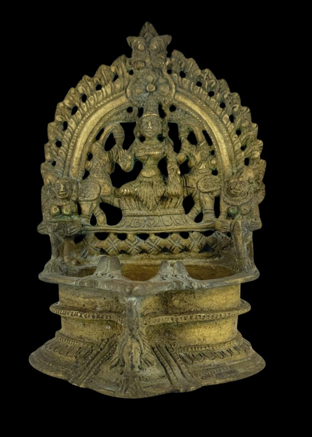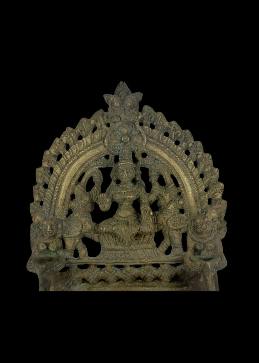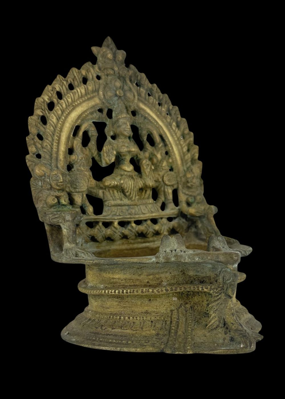 This bronze oil lamp from South India features the goddess Lakshmi, seated majestically under an ornate arch flanked by celestial attendants and mythical creatures. Crafted with detailed precision, the lamp showcases traditional South Indian iconography, with Lakshmi depicted holding lotuses—a symbol of purity and prosperity. The arched prabhavali (backplate) is adorned with intricate floral and geometric motifs, enhancing the divine aura of the figure. The base includes a shallow reservoir for oil, with multiple wick holders radiating outward, allowing the lamp to cast multiple flames. Used in domestic worship and temple rituals, such lamps were not merely utilitarian but also sacred objects that invoked divine presence. This artifact exemplifies the deep spiritual and artistic heritage of the region, where light is both a literal and symbolic offering to the divine.