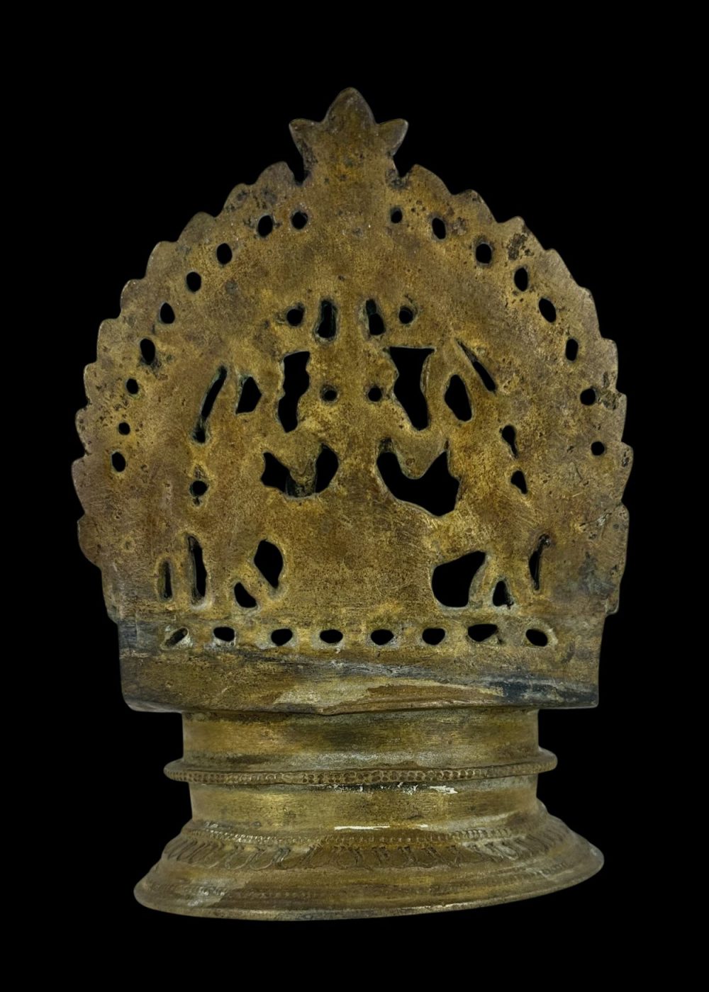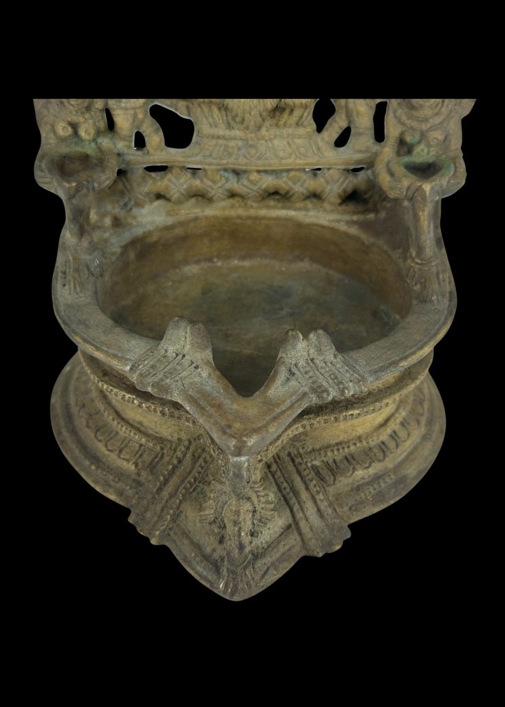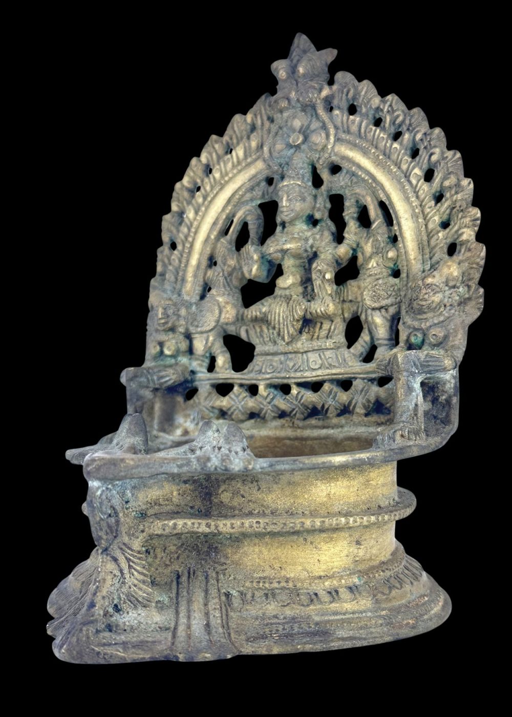 This bronze oil lamp from South India features the goddess Lakshmi, seated majestically under an ornate arch flanked by celestial attendants and mythical creatures. Crafted with detailed precision, the lamp showcases traditional South Indian iconography, with Lakshmi depicted holding lotuses—a symbol of purity and prosperity. The arched prabhavali (backplate) is adorned with intricate floral and geometric motifs, enhancing the divine aura of the figure. The base includes a shallow reservoir for oil, with multiple wick holders radiating outward, allowing the lamp to cast multiple flames. Used in domestic worship and temple rituals, such lamps were not merely utilitarian but also sacred objects that invoked divine presence. This artifact exemplifies the deep spiritual and artistic heritage of the region, where light is both a literal and symbolic offering to the divine.