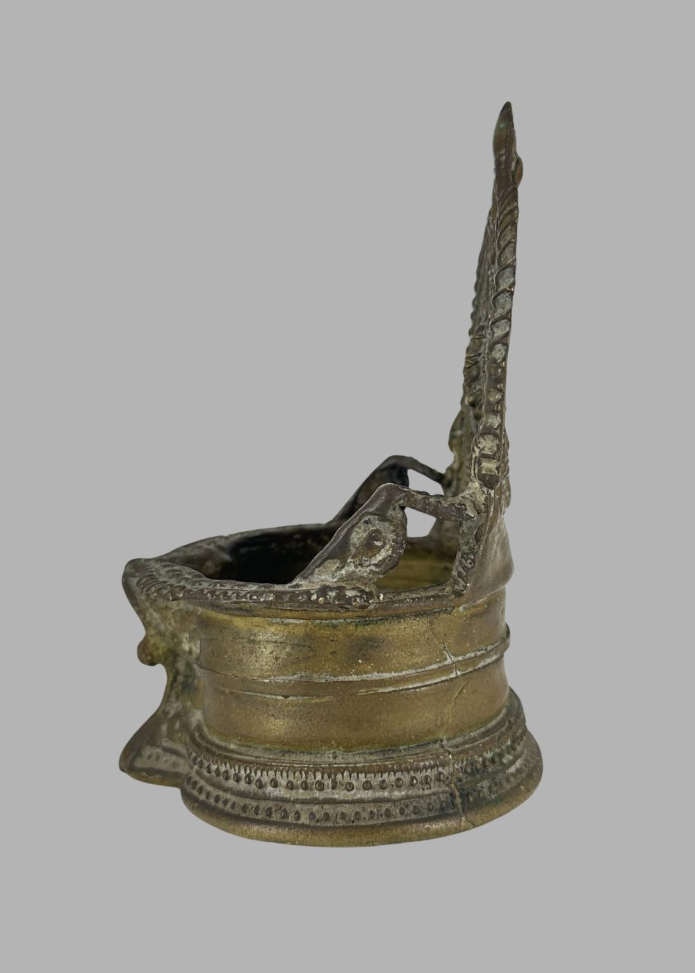 This bronze oil lamp from Karnataka is a fine example of devotional craftsmanship deeply rooted in the region’s religious and artistic traditions. The lamp features a semi-circular oil reservoir at the base and a tall, intricately carved prabhavali (backplate) rising behind it. At the center of the prabhavali is an image of Goddess Lakshmi, the deity of wealth and prosperity, flanked by stylized peacocks and elaborate ornamental detailing. The base is richly decorated with beaded and geometric patterns, enhancing its aesthetic and spiritual appeal. The spouted front edge suggests its ritual function, used during puja ceremonies to offer light to the divine. With its harmonious design and sacred symbolism, this bronze lamp embodies both the artistry and the devotional spirit characteristic of Karnataka.