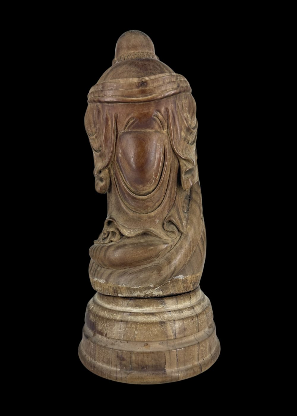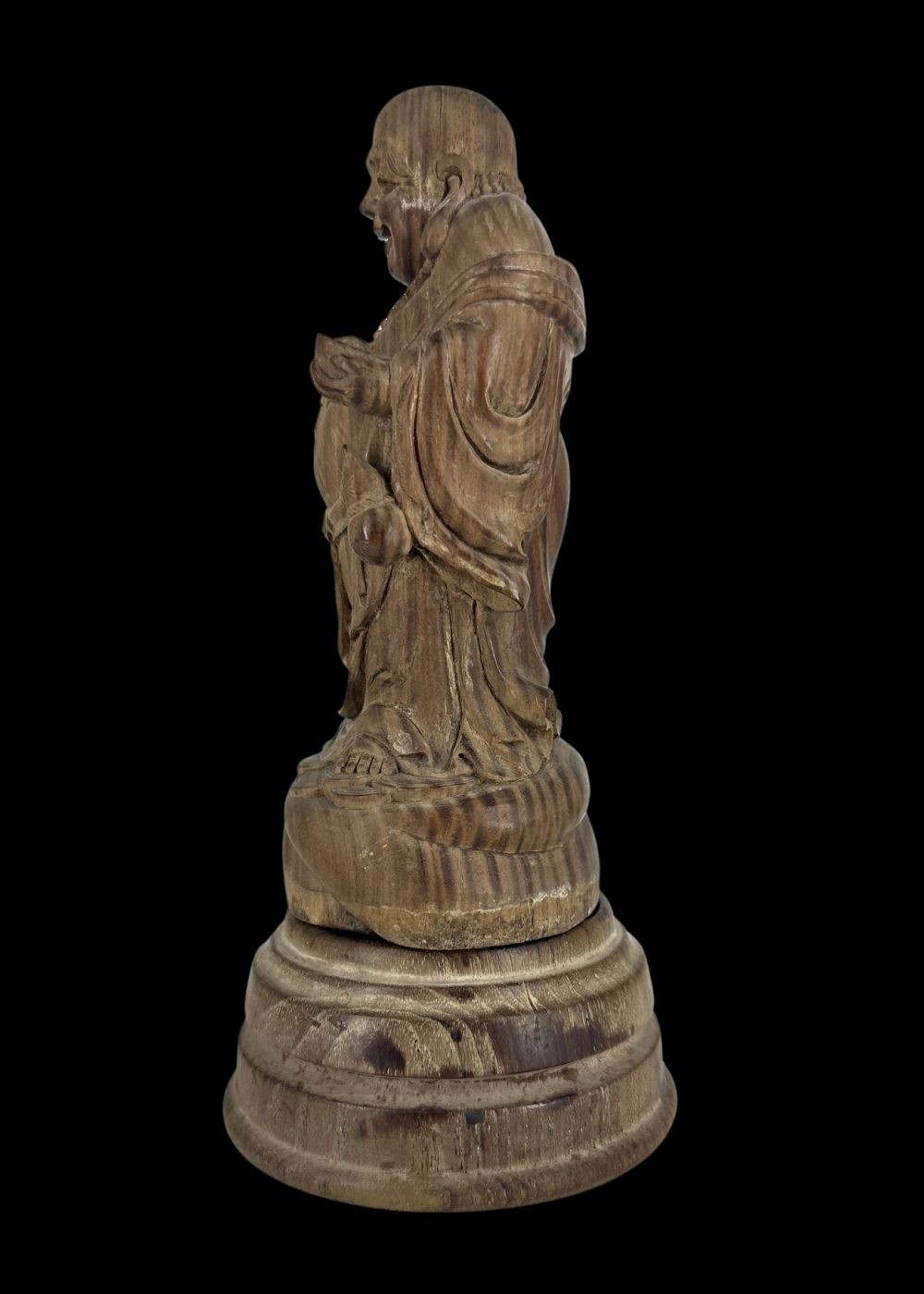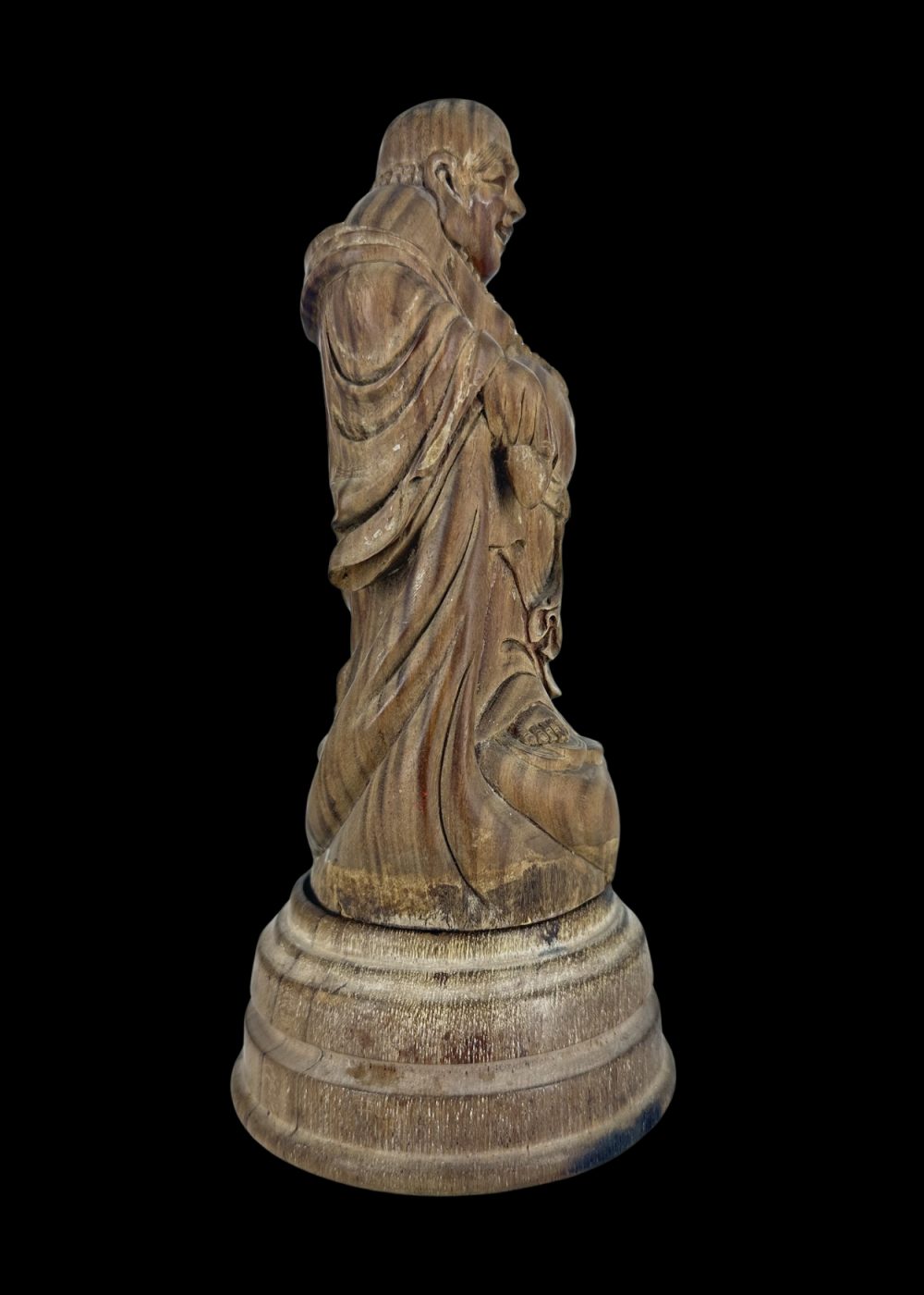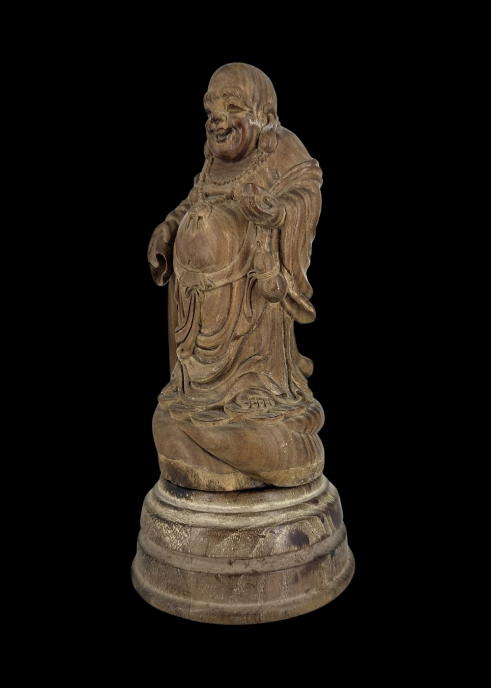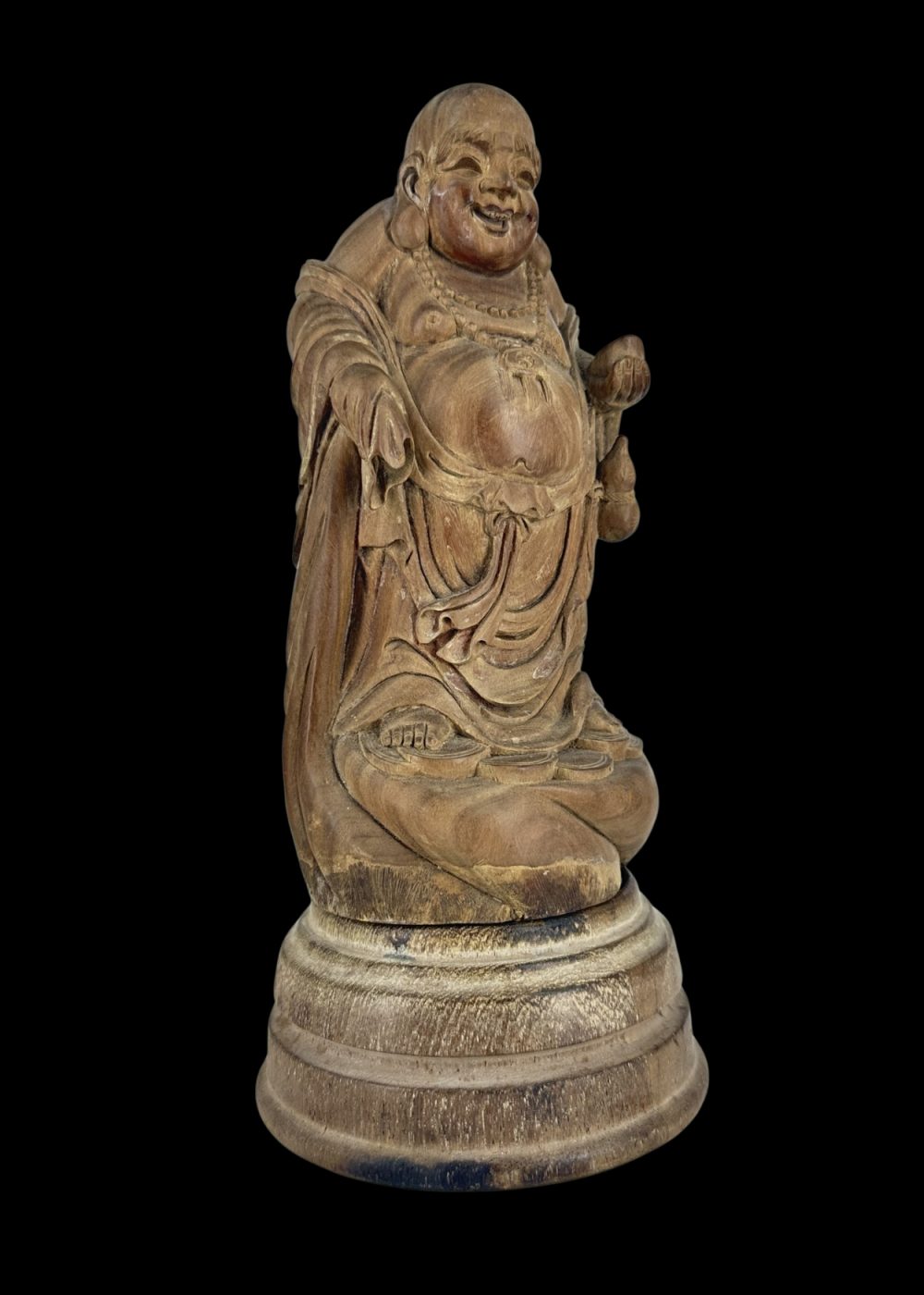 This finely carved sandalwood sculpture from China, estimated to be 50–60 years old, depicts the Laughing Buddha—an enduring symbol of joy, abundance, and contentment in Chinese culture. Rendered with a cheerful expression and rounded form, the figure embodies prosperity and good fortune. The natural fragrance of sandalwood enhances its appeal, while the intricate detailing reflects the skilled craftsmanship typical of traditional Chinese woodwork.