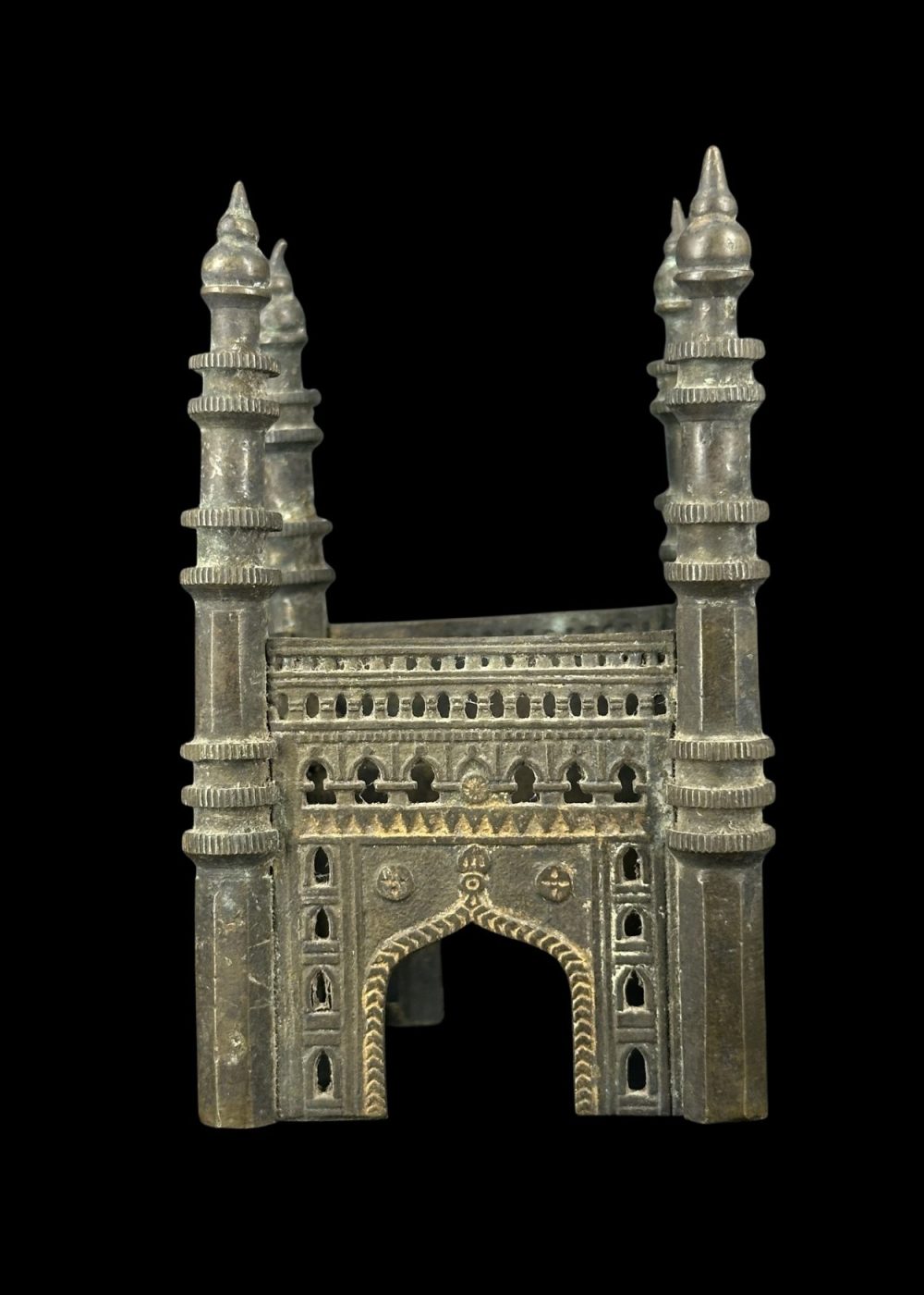 This bronze miniature represents the iconic Charminar, a historic monument located in Hyderabad, India. Likely crafted in the as a decorative or souvenir piece, the model captures the architectural essence of the original structure, including its four grand minarets and central arched gateway. The fine detailing—such as the ornate balconies, arched windows, and domed spires—reflects skilled craftsmanship and an appreciation for Indo-Islamic architecture. This piece serves not only as a symbol of regional pride but also as a tangible tribute to one of India’s most celebrated heritage landmarks.