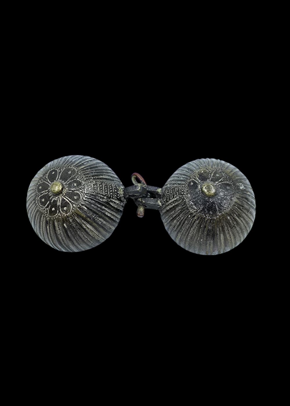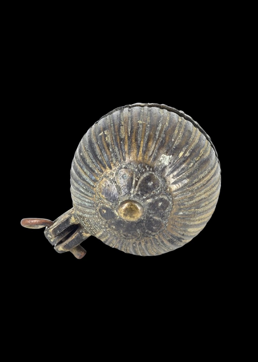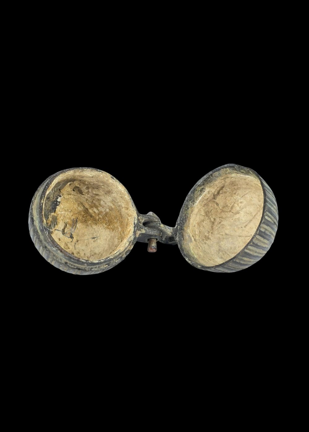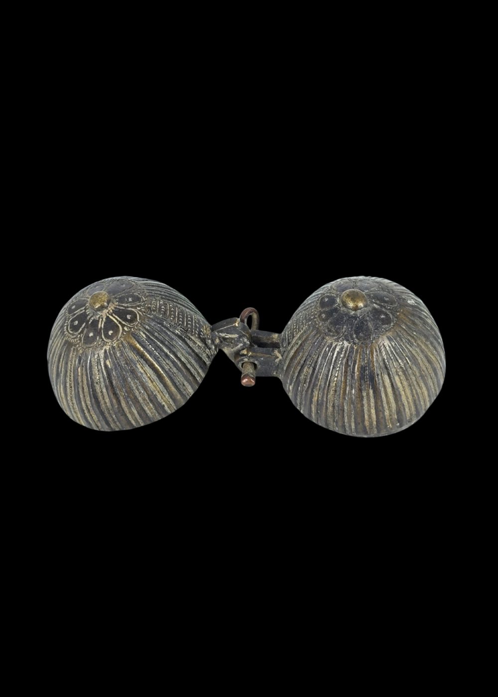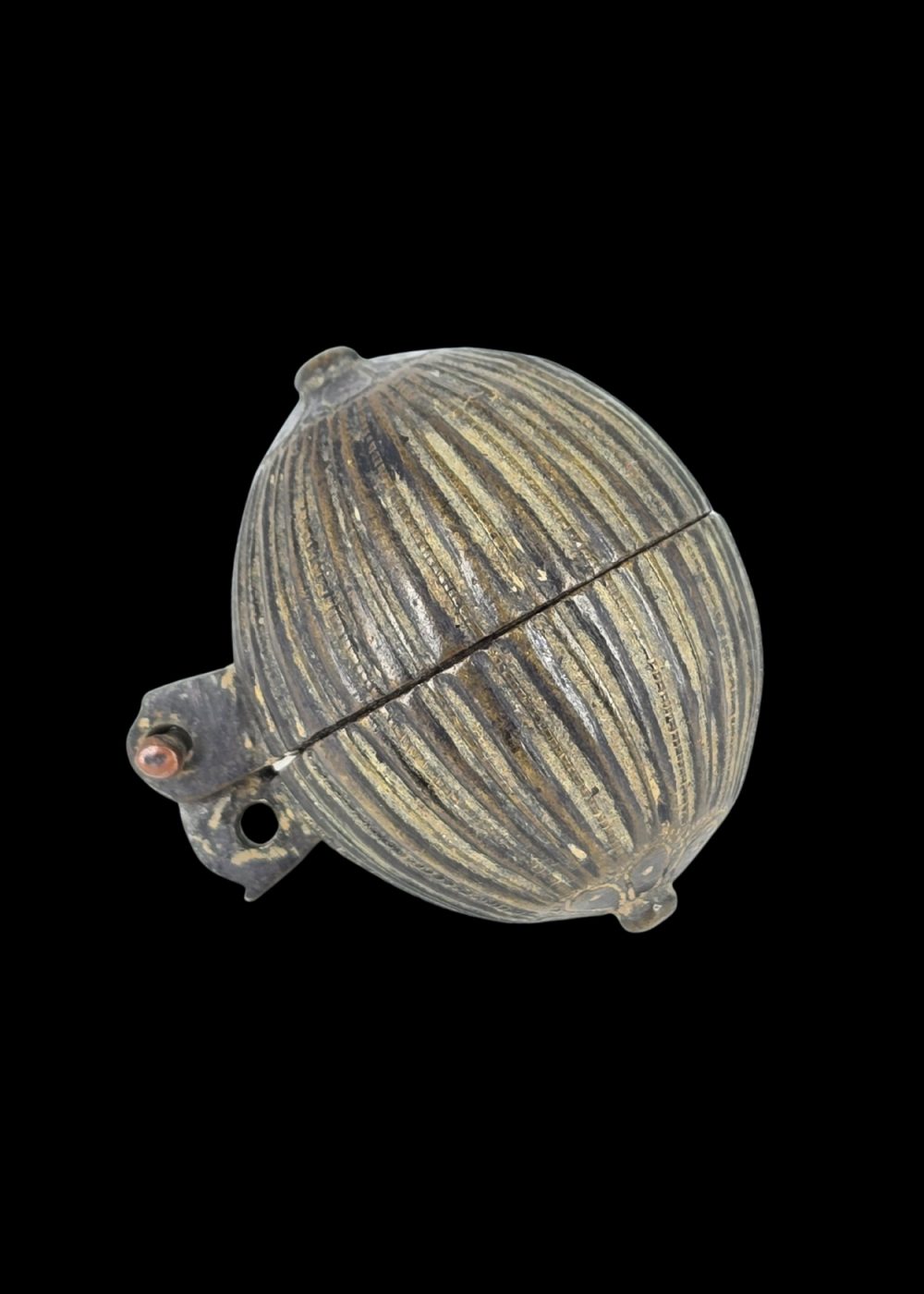 This bronze container from North India exemplifies the region’s enduring tradition of intricate metalwork. Crafted in a spherical form with vertically ribbed detailing, the object opens on a central hinge, revealing a smooth, functional interior. Likely used to store small personal or ritual items, its compact design and decorative surface reflect a harmonious blend of utility and artistic expression in everyday objects of the time.
