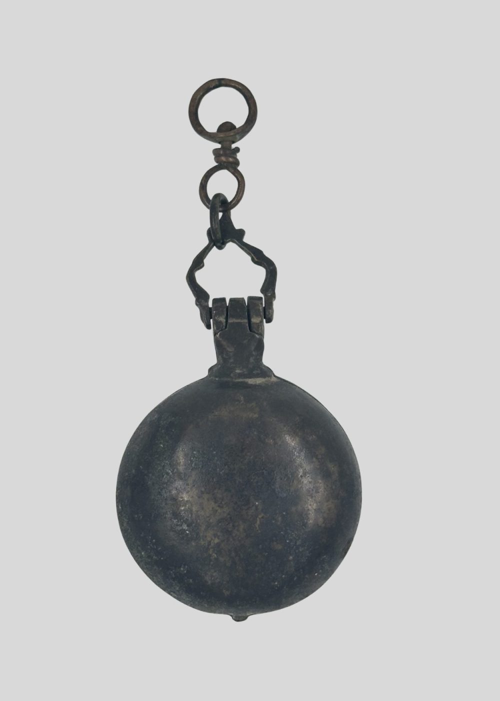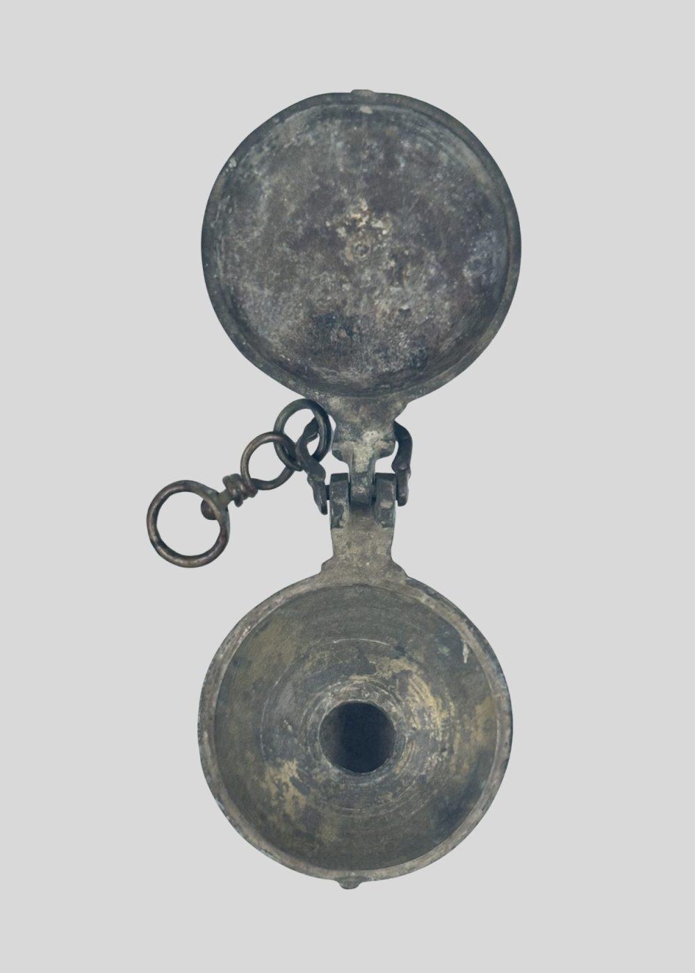 This spherical lime box, cast in bronze, exemplifies the utilitarian refinement of Maharashtrian metalwork. A hinged lid secures the container, while the sturdy arched handle facilitates portability—likely worn or carried as part of daily betel-chewing customs. The deep patina suggests prolonged use, enhancing the artifact’s tactile character. Subtle tooling around the seams and joints reflects meticulous craftsmanship, underscoring the integration of function and artistry in regional domestic wares.