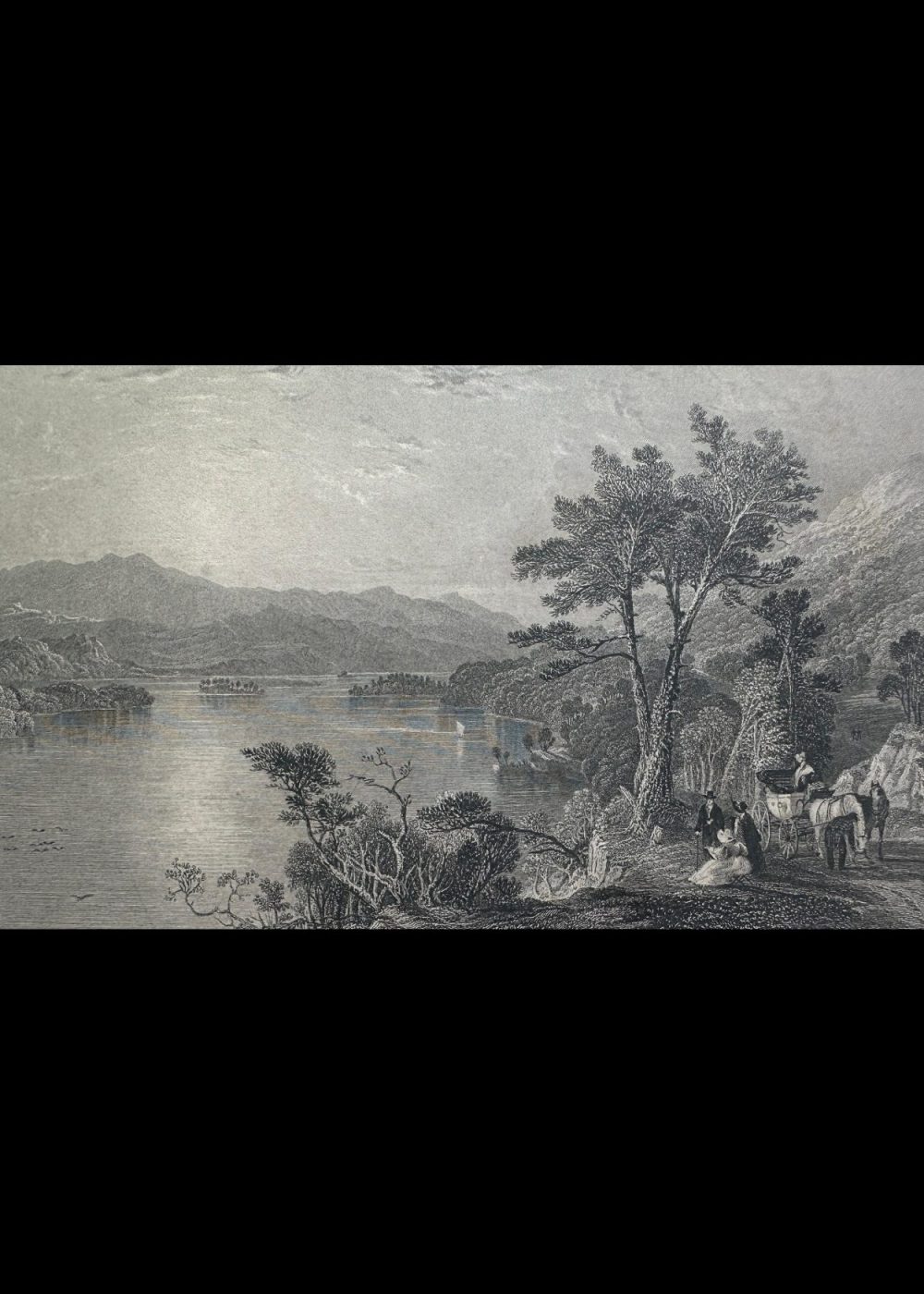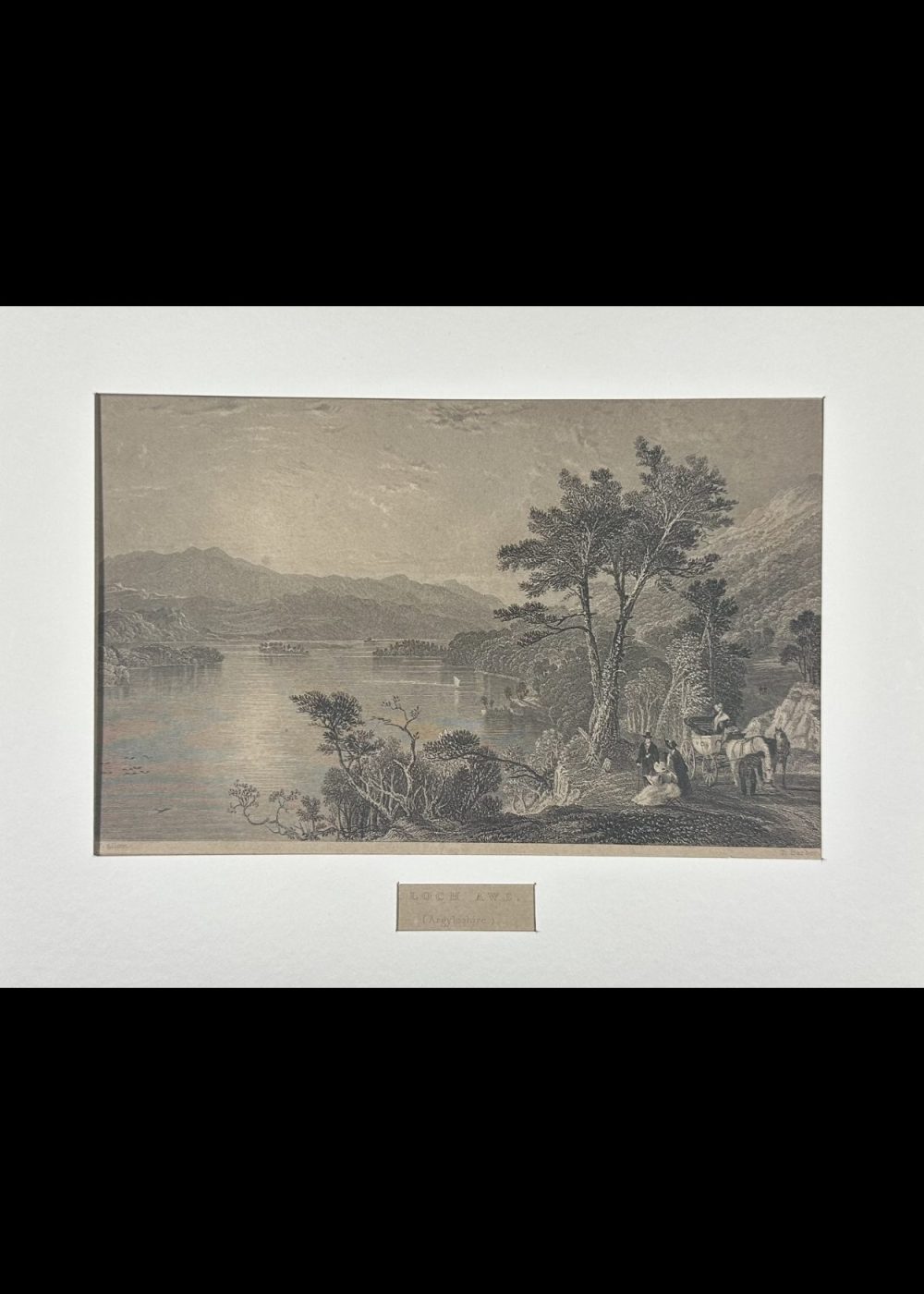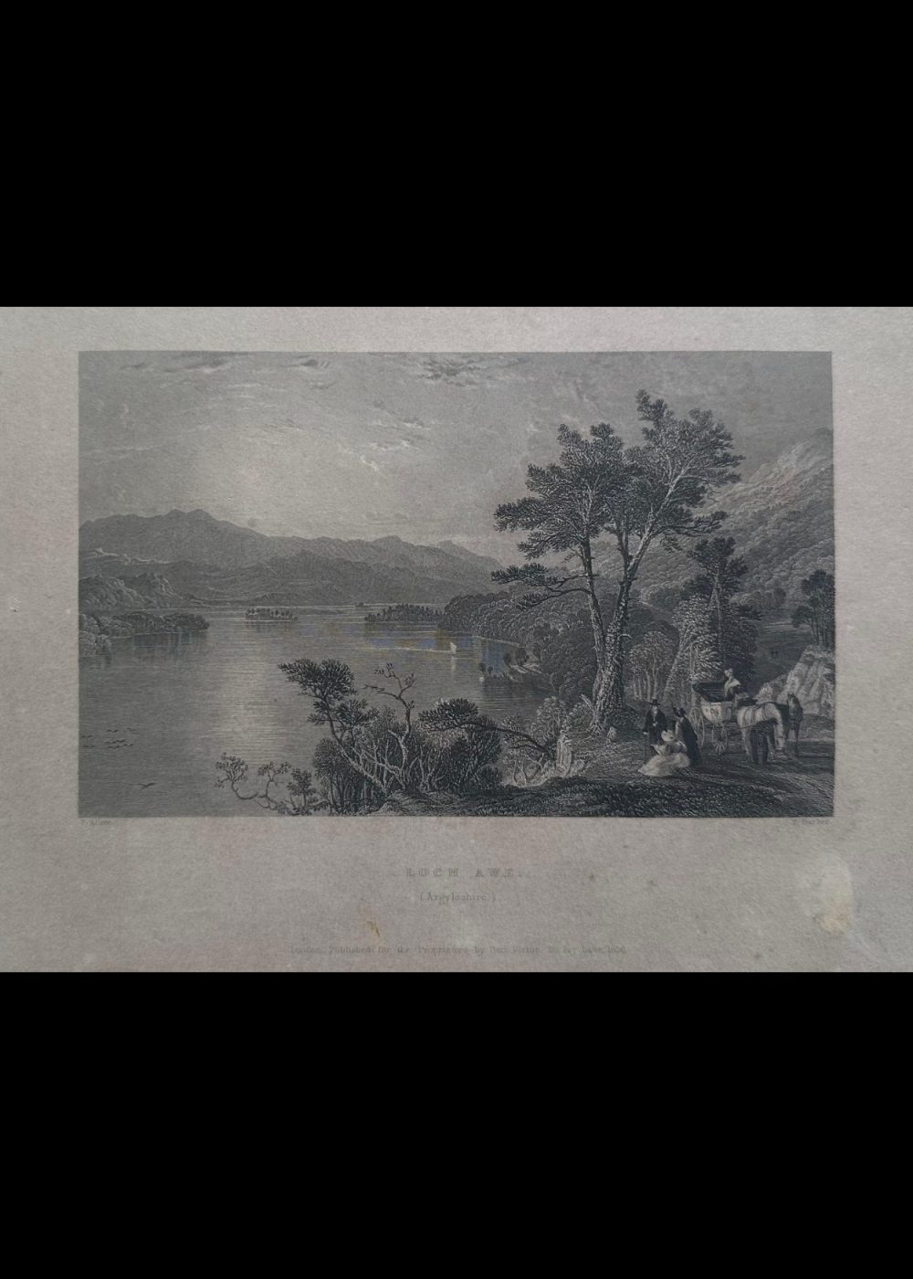 This romantic steel engraving captures the expansive beauty of Loch Awe, one of Scotland’s longest freshwater lochs, nestled in the rugged landscapes of Argyllshire. The composition reveals a wide, serene view of the loch, its placid surface reflecting the surrounding hills and distant mountain ranges. Small islands dot the waters, and tiny sailing boats glide gently across, adding life to the tranquil scene. In the foreground, finely rendered figures — including a seated woman and child, and travelers with a horse-drawn carriage — pause to admire the view, enhancing the human connection to the landscape. Majestic trees frame the right side, while the curving shoreline leads the eye toward the distant horizon. The artist, Thomas Allom, known for his topographical precision and poetic sensibility, presents Loch Awe as both sublime and picturesque. The engraving exemplifies the 19th-century British fascination with Scotland’s natural grandeur, as disseminated through illustrated travel books and prints published by George Virtue.