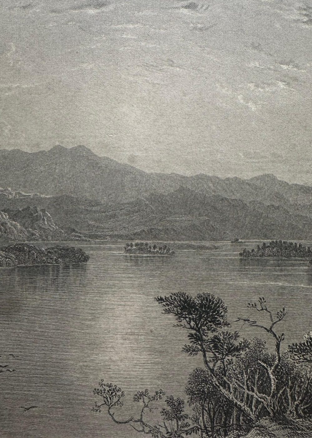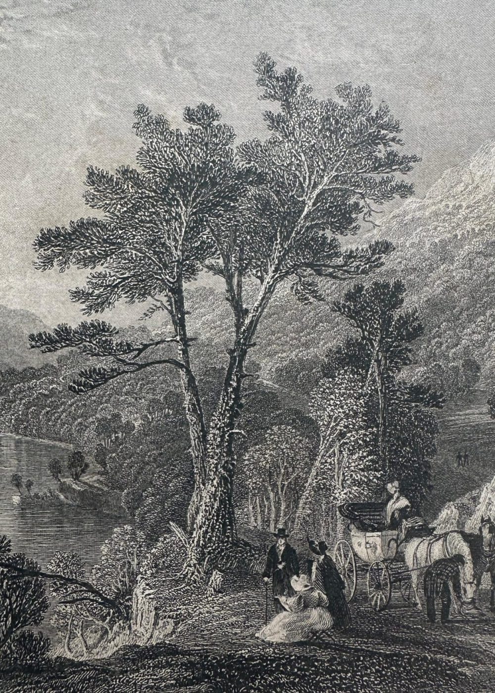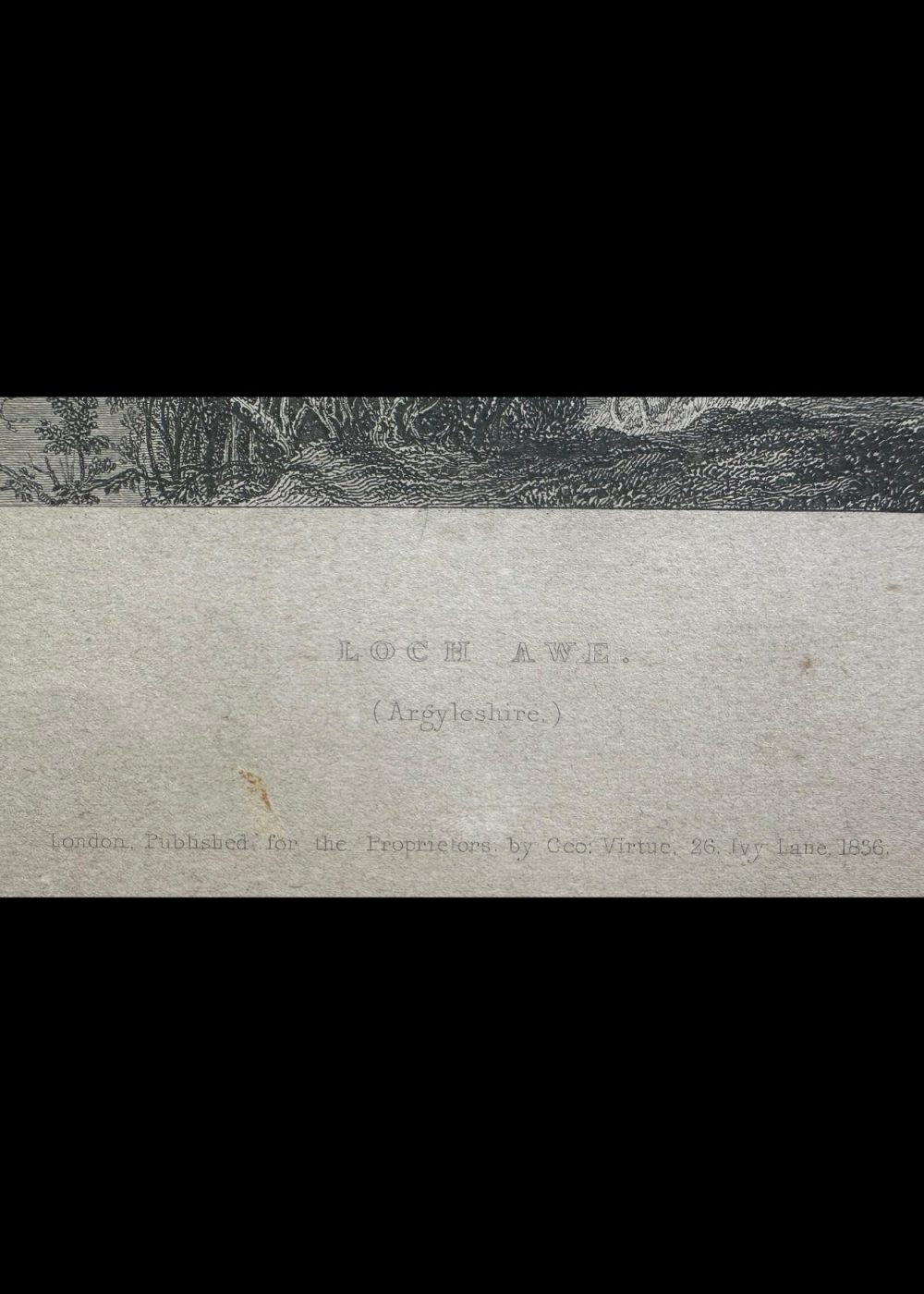 This romantic steel engraving captures the expansive beauty of Loch Awe, one of Scotland’s longest freshwater lochs, nestled in the rugged landscapes of Argyllshire. The composition reveals a wide, serene view of the loch, its placid surface reflecting the surrounding hills and distant mountain ranges. Small islands dot the waters, and tiny sailing boats glide gently across, adding life to the tranquil scene. In the foreground, finely rendered figures — including a seated woman and child, and travelers with a horse-drawn carriage — pause to admire the view, enhancing the human connection to the landscape. Majestic trees frame the right side, while the curving shoreline leads the eye toward the distant horizon. The artist, Thomas Allom, known for his topographical precision and poetic sensibility, presents Loch Awe as both sublime and picturesque. The engraving exemplifies the 19th-century British fascination with Scotland’s natural grandeur, as disseminated through illustrated travel books and prints published by George Virtue.