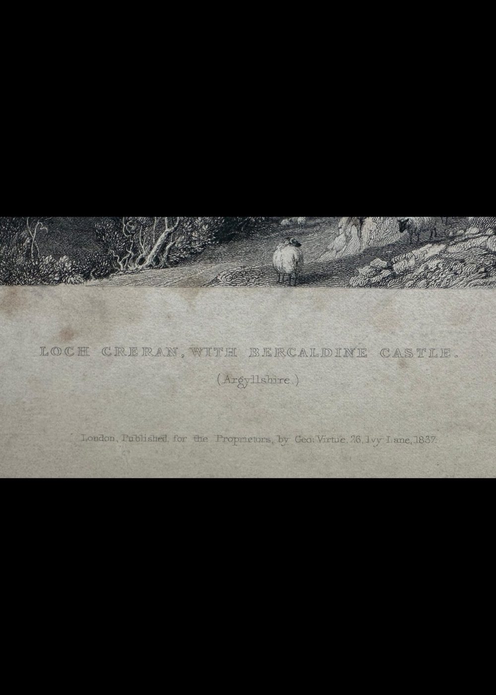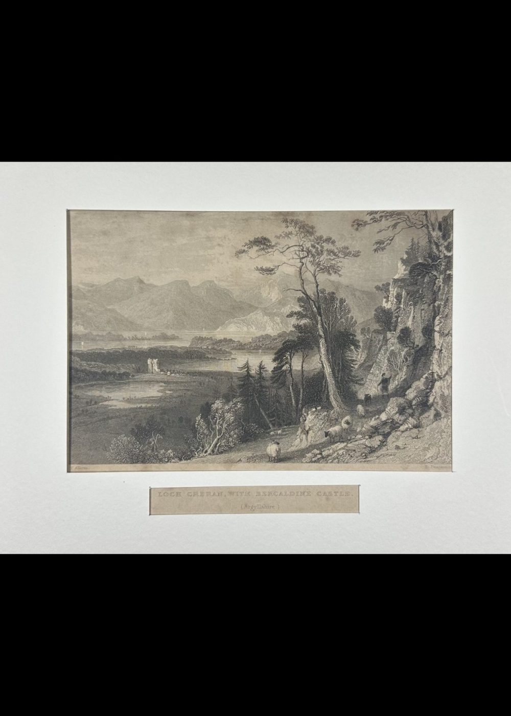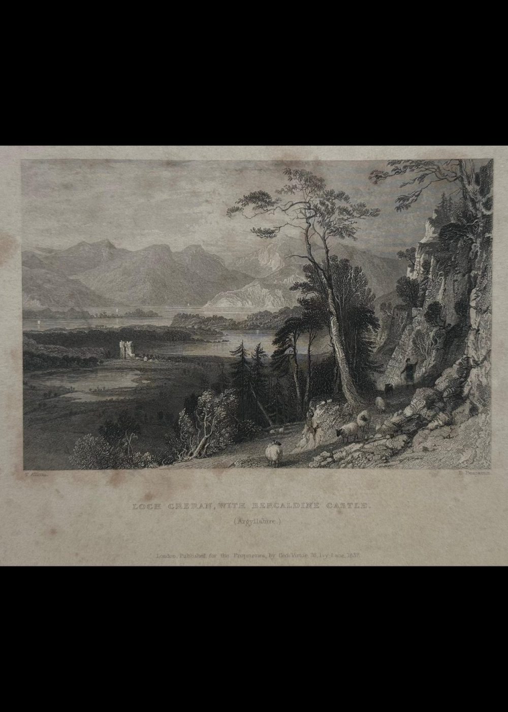 This dramatic engraving captures the scenic grandeur of Loch Creran, a sea loch in Argyllshire, Scotland, with the historic Barcaldine Castle nestled along its wooded shores. The view is framed by steep, rocky slopes in the foreground, where a shepherd and his flock make their way along a rugged mountain path, enveloped by tall trees and craggy terrain. Across the tranquil waters of the loch, Barcaldine Castle stands in serene isolation, its turreted form rising from a densely forested peninsula. Behind it, layers of majestic Highland mountains fade into the distance, their peaks catching light beneath a cloud-streaked sky. Sailboats gently glide across the loch’s reflective surface, adding subtle life and movement to the otherwise still and contemplative landscape. Artist Thomas Allom and engraver W. R. Smith have combined their talents to portray a quintessentially Romantic Scottish vista—sublime in scale, rich in historical association, and imbued with the poetic solitude of the Highlands. This engraving formed part of George Virtue’s influential 19th-century topographical collections, designed to bring the picturesque wonders of Scotland to a wide British audience.