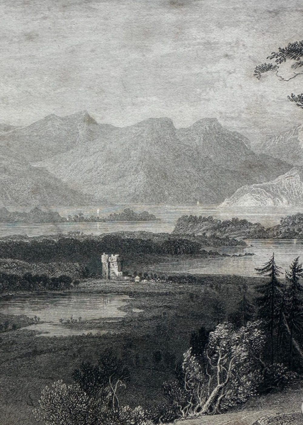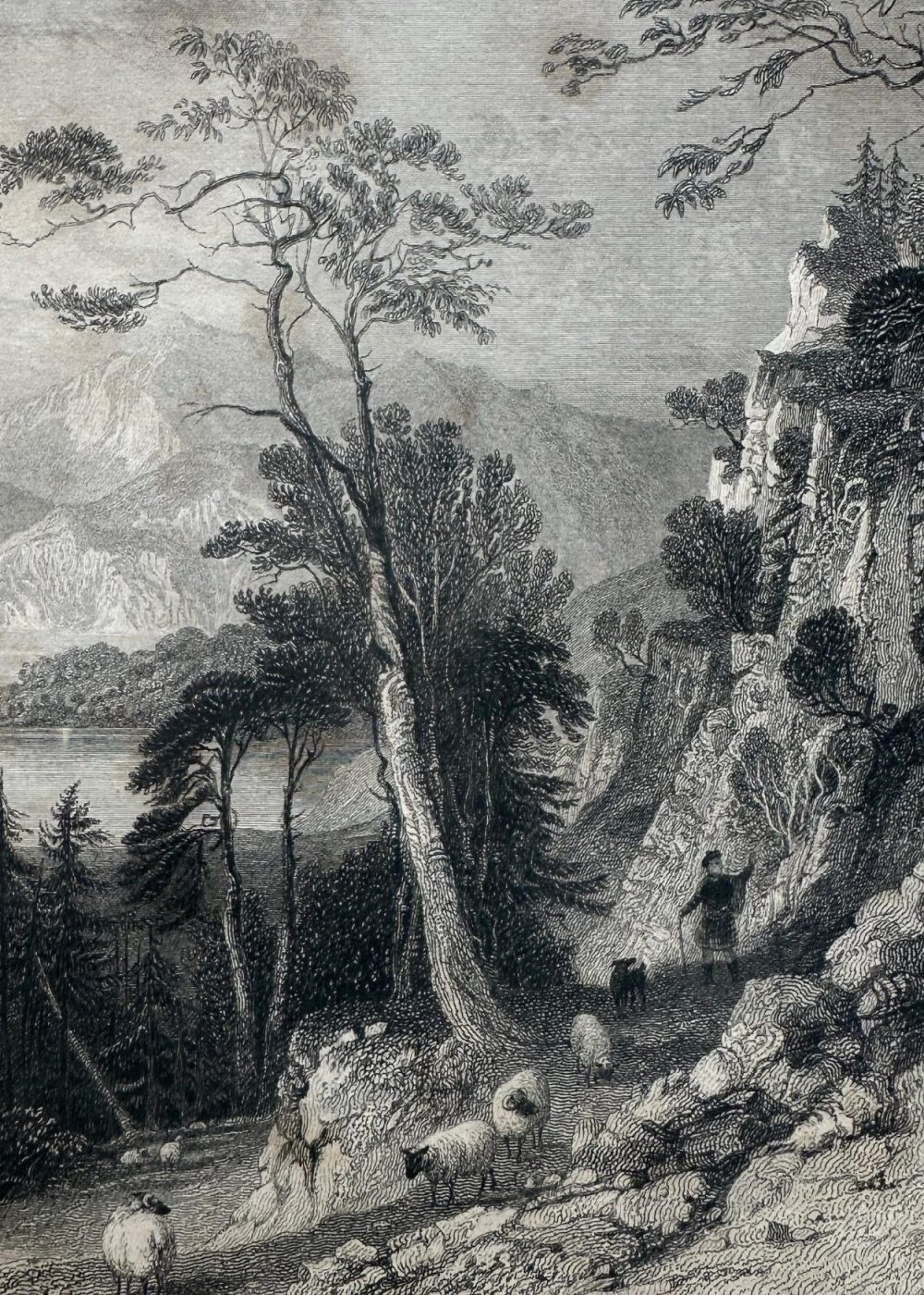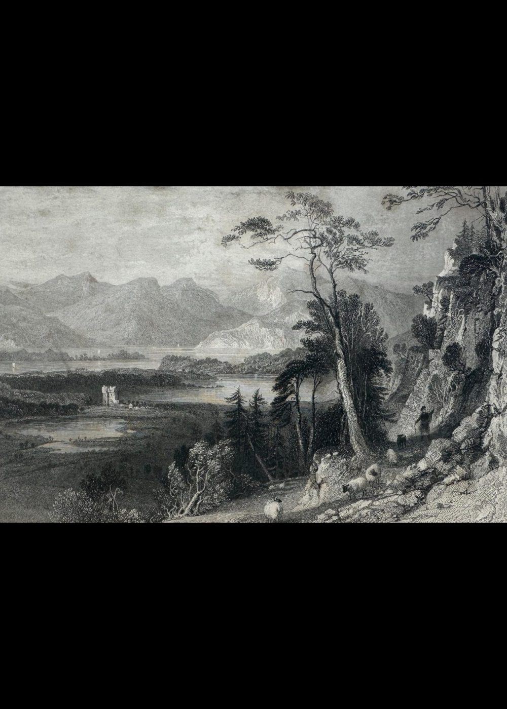 This dramatic engraving captures the scenic grandeur of Loch Creran, a sea loch in Argyllshire, Scotland, with the historic Barcaldine Castle nestled along its wooded shores. The view is framed by steep, rocky slopes in the foreground, where a shepherd and his flock make their way along a rugged mountain path, enveloped by tall trees and craggy terrain. Across the tranquil waters of the loch, Barcaldine Castle stands in serene isolation, its turreted form rising from a densely forested peninsula. Behind it, layers of majestic Highland mountains fade into the distance, their peaks catching light beneath a cloud-streaked sky. Sailboats gently glide across the loch’s reflective surface, adding subtle life and movement to the otherwise still and contemplative landscape. Artist Thomas Allom and engraver W. R. Smith have combined their talents to portray a quintessentially Romantic Scottish vista—sublime in scale, rich in historical association, and imbued with the poetic solitude of the Highlands. This engraving formed part of George Virtue’s influential 19th-century topographical collections, designed to bring the picturesque wonders of Scotland to a wide British audience.
