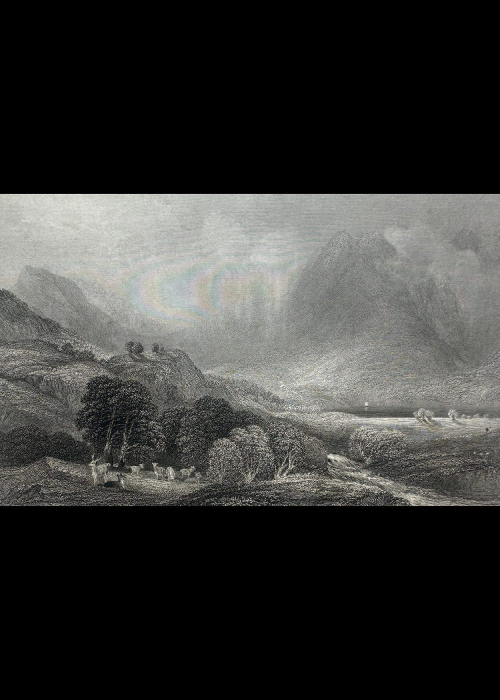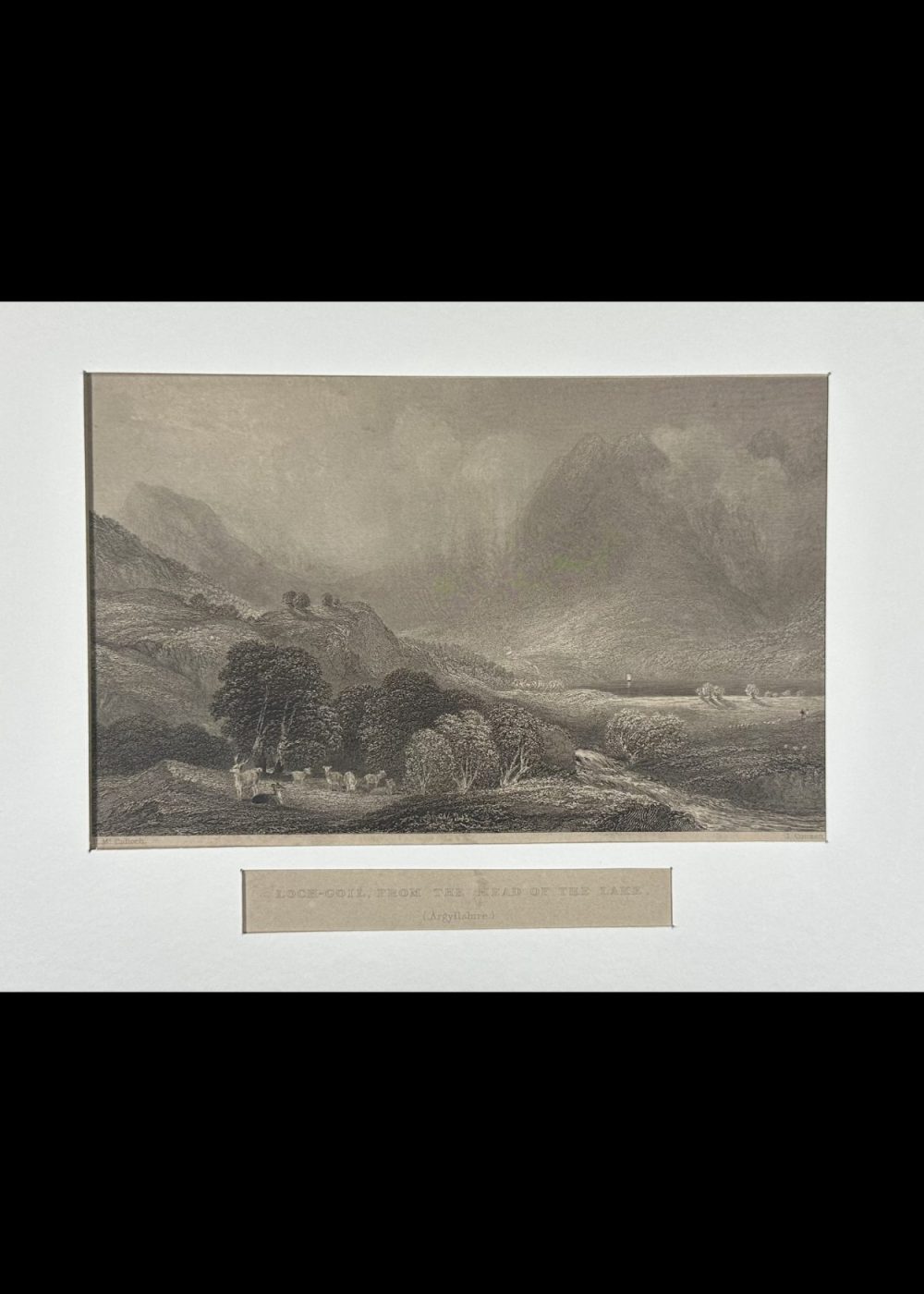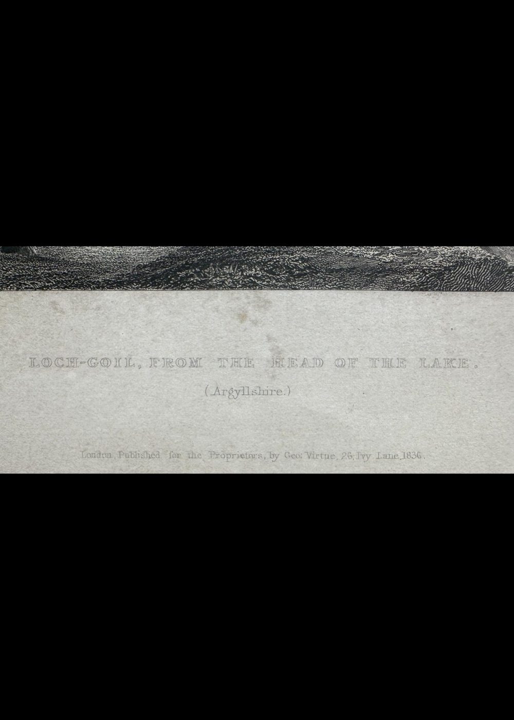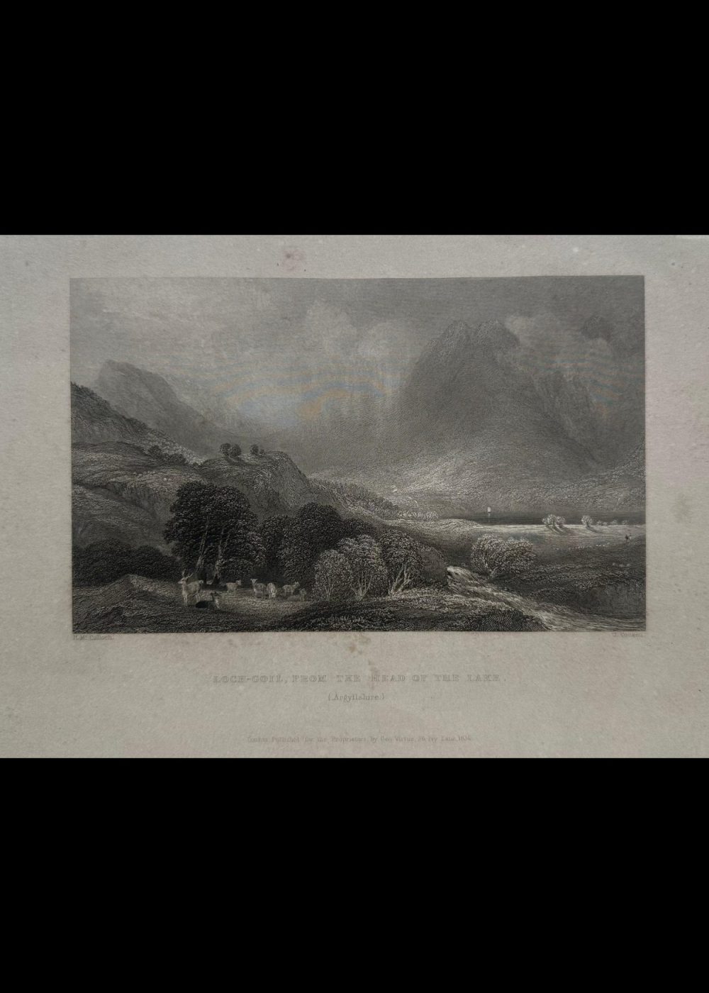 London, published for the proprietors by gen Geo. Virtue, 26, Ivy Lame, 1836. This serene engraving portrays a panoramic view of Loch Goil from its head, nestled in the dramatic Highlands of Argyllshire, Scotland. Rolling hills and towering mountains frame the tranquil waters, with cattle grazing peacefully in the foreground. A figure tends to the animals, adding a pastoral charm to the majestic natural setting. The artwork is based on a composition by H. McCulloch and engraved by J. Cousen, published by Geo. Virtue in 1836.