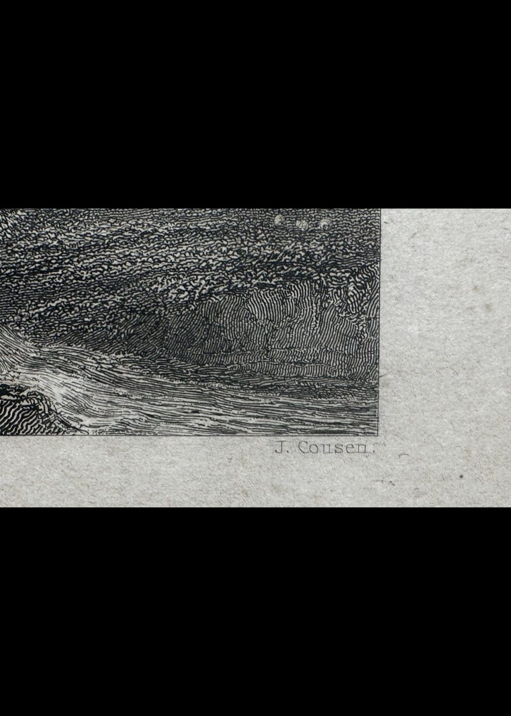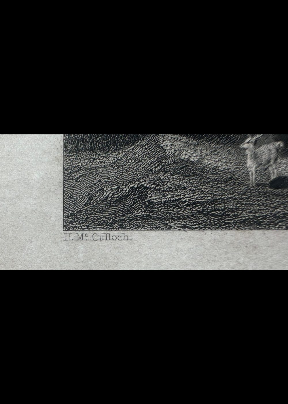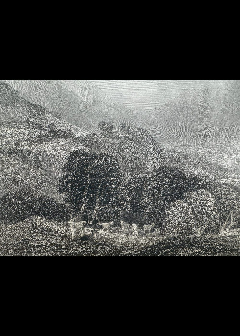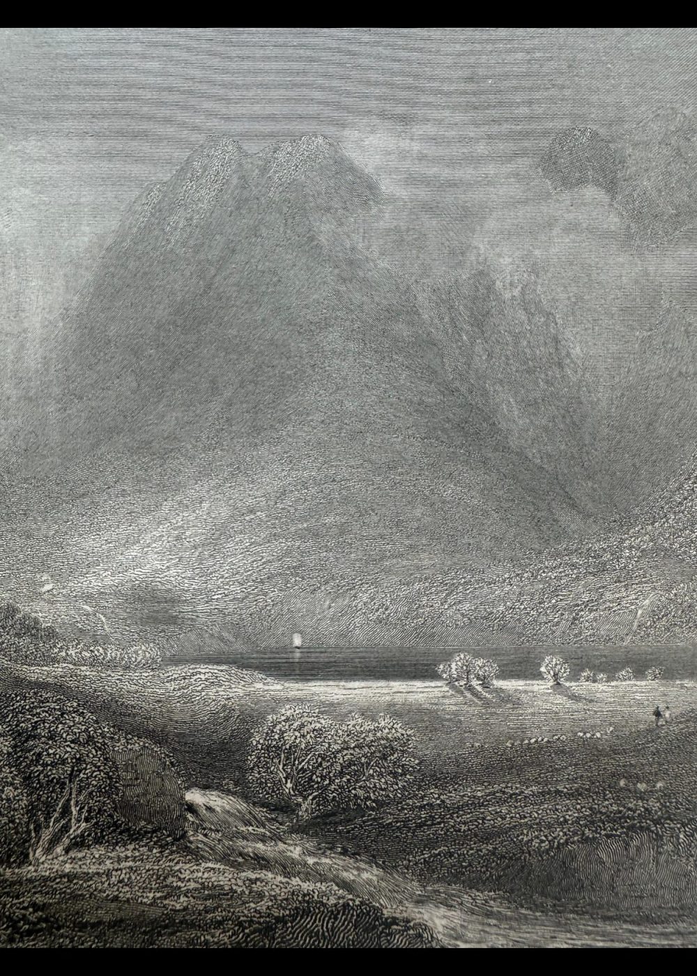 London, published for the proprietors by gen Geo. Virtue, 26, Ivy Lame, 1836. This serene engraving portrays a panoramic view of Loch Goil from its head, nestled in the dramatic Highlands of Argyllshire, Scotland. Rolling hills and towering mountains frame the tranquil waters, with cattle grazing peacefully in the foreground. A figure tends to the animals, adding a pastoral charm to the majestic natural setting. The artwork is based on a composition by H. McCulloch and engraved by J. Cousen, published by Geo. Virtue in 1836.