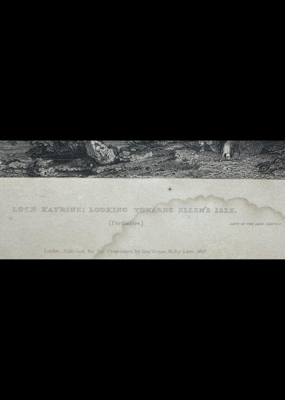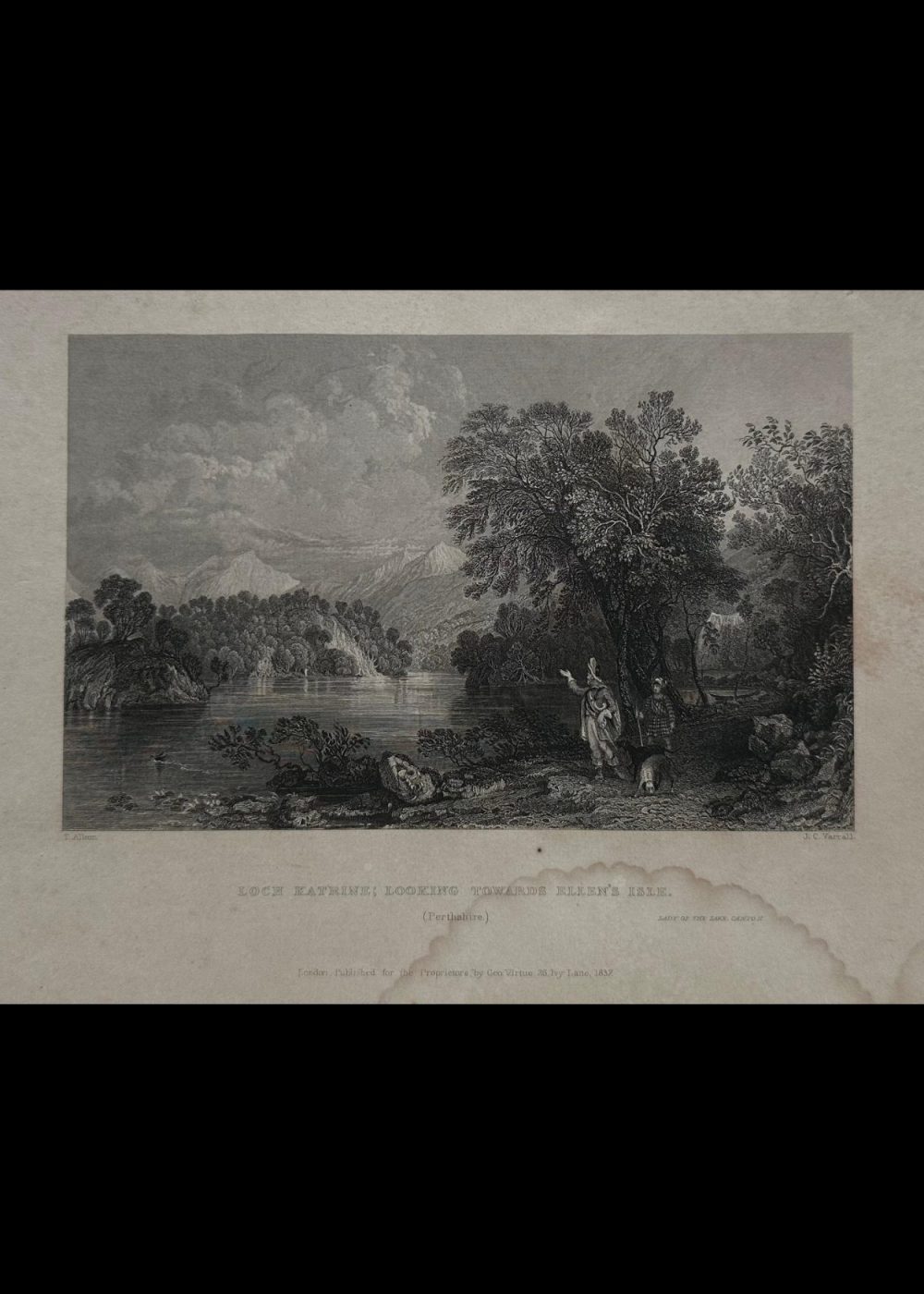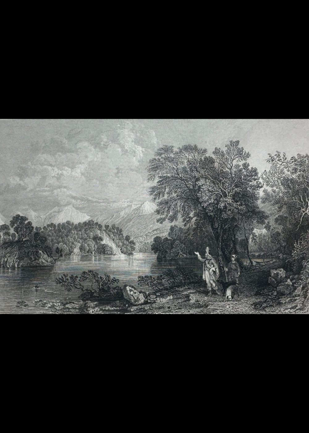 London, Published for the Proprietors, by Geo: Virtue, 26 Ivy Lane, 1837. This 19th-century steel engraving beautifully captures the tranquil scenery of Loch Katrine in Perthshire, Scotland, looking toward the fabled Ellen’s Isle. Inspired by Sir Walter Scott’s narrative poem The Lady of the Lake, the image depicts a serene lake surrounded by lush forests and majestic mountains, with figures in traditional Highland attire standing in the foreground. The detailed engraving reflects the romanticism of the Scottish landscape and literature, blending natural beauty with cultural heritage.