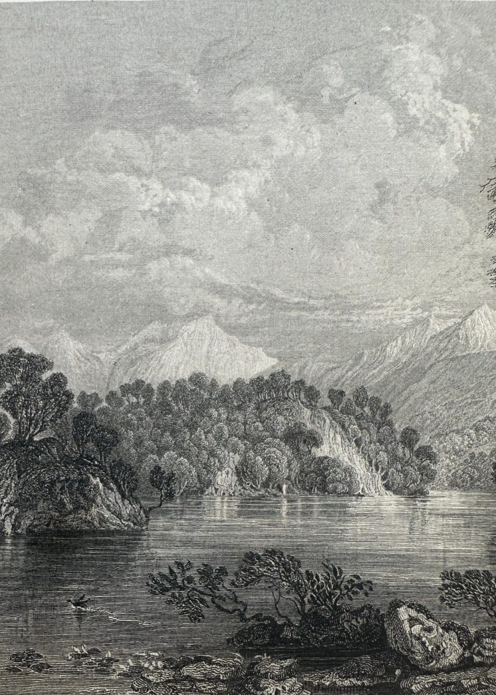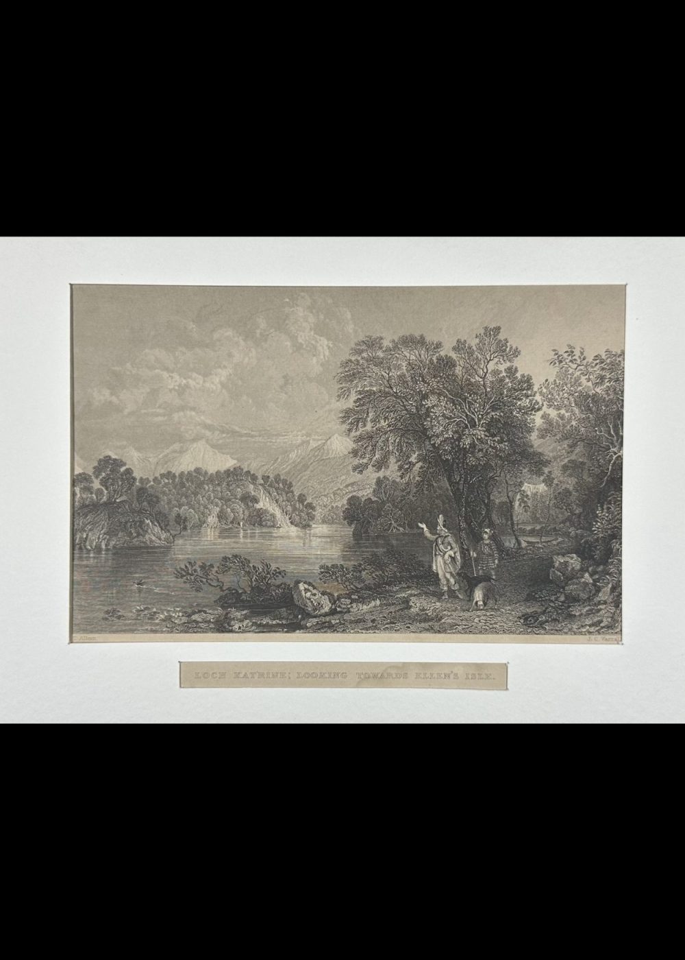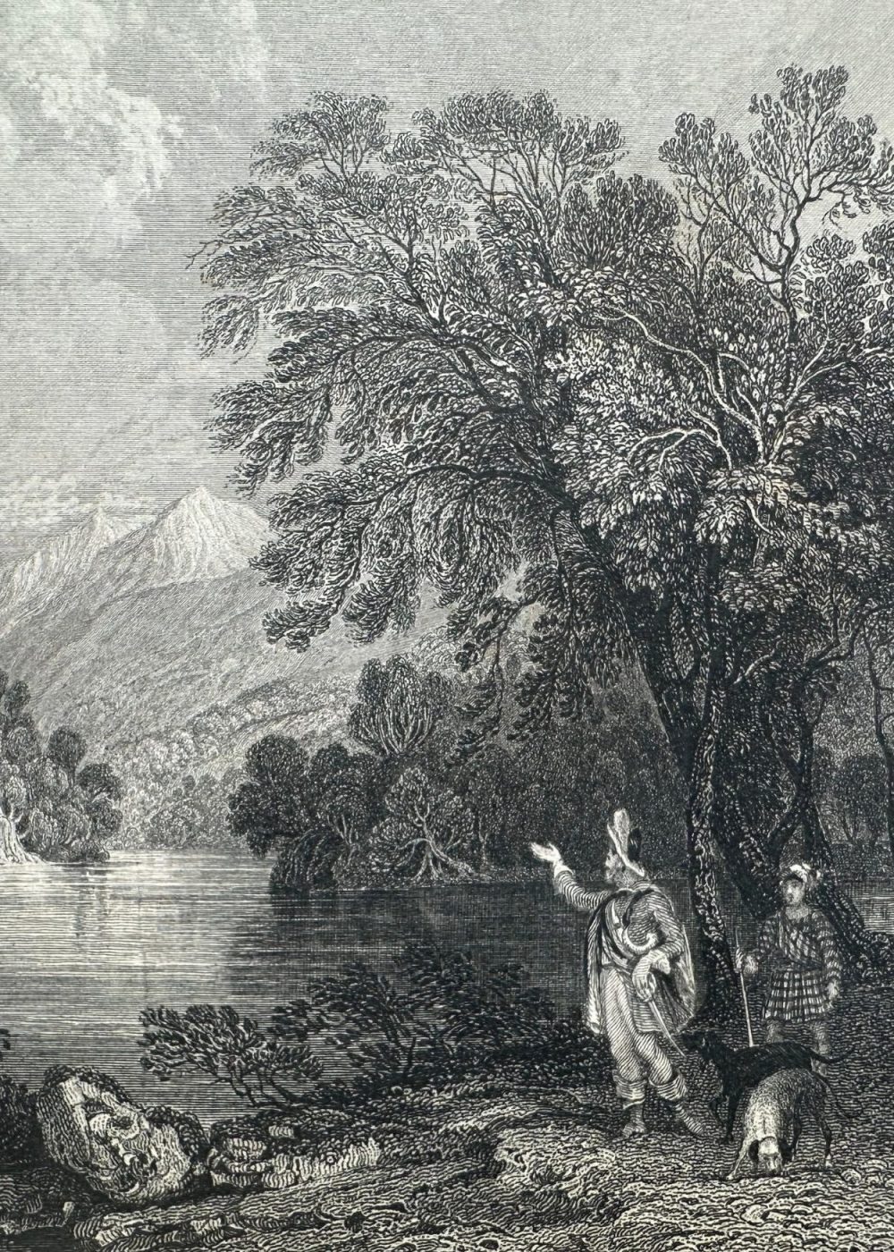 London, Published for the Proprietors, by Geo: Virtue, 26 Ivy Lane, 1837. This 19th-century steel engraving beautifully captures the tranquil scenery of Loch Katrine in Perthshire, Scotland, looking toward the fabled Ellen’s Isle. Inspired by Sir Walter Scott’s narrative poem The Lady of the Lake, the image depicts a serene lake surrounded by lush forests and majestic mountains, with figures in traditional Highland attire standing in the foreground. The detailed engraving reflects the romanticism of the Scottish landscape and literature, blending natural beauty with cultural heritage.