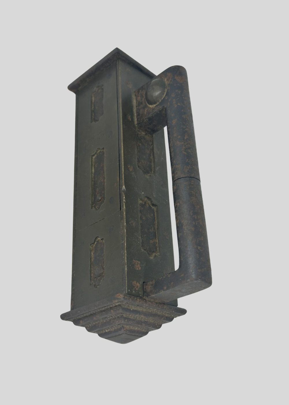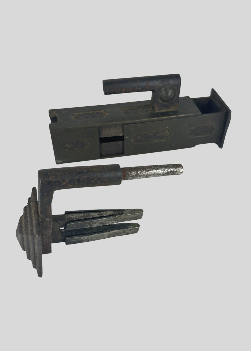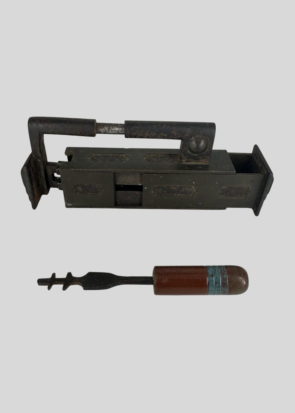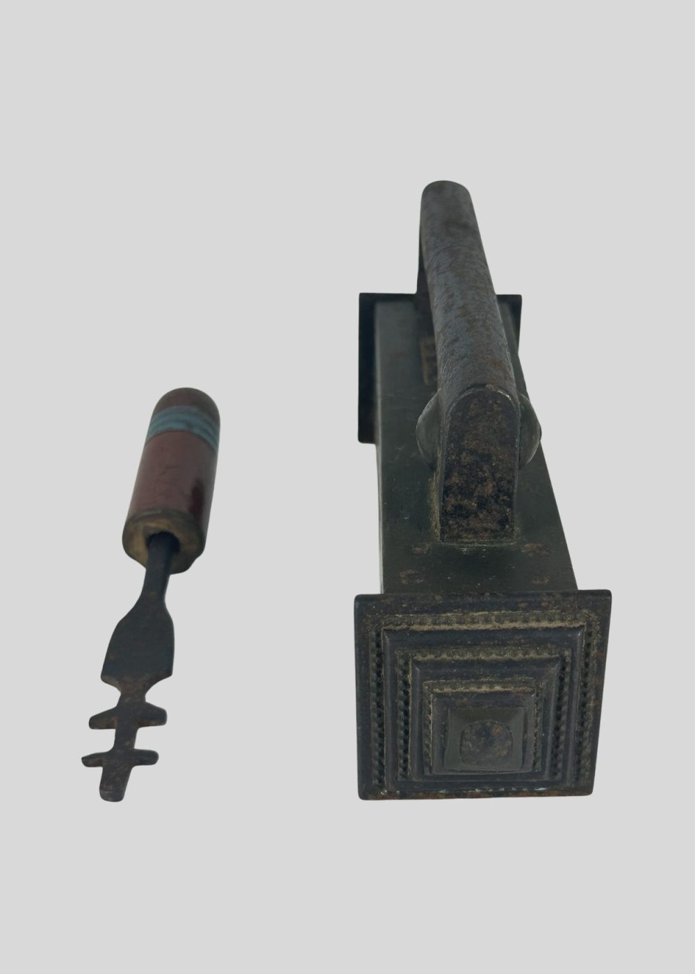 This Islamic lock from North India, crafted from iron and brass, reflects the ingenuity and artistry of traditional metalwork in the region. The rectangular lock body, featuring a robust handle and geometric embellishments, is accompanied by a distinctive key with a multicolored handle, showcasing both functional precision and decorative flair. Such locks were not only utilitarian but also symbols of security, craftsmanship, and aesthetic sensibility in historical Indian households and institutions. Key Height: 5.51 inches (14 cm)