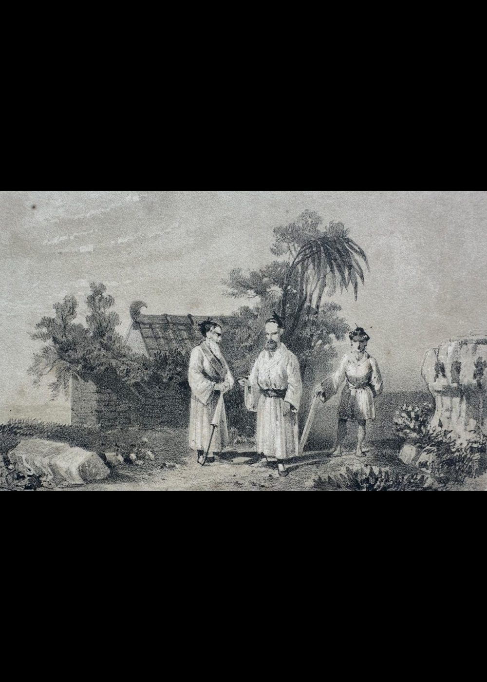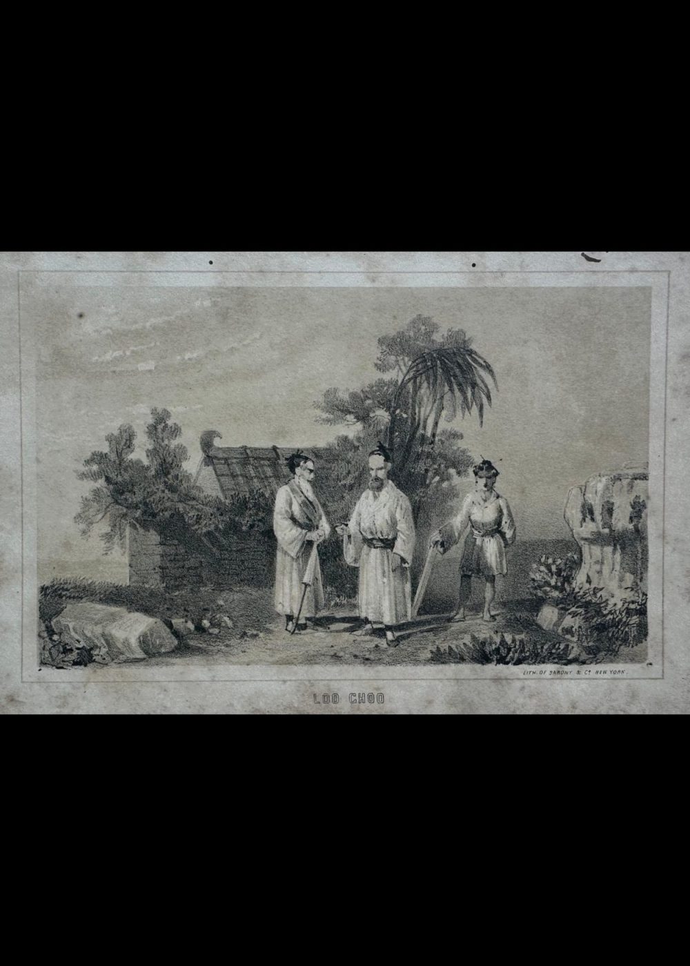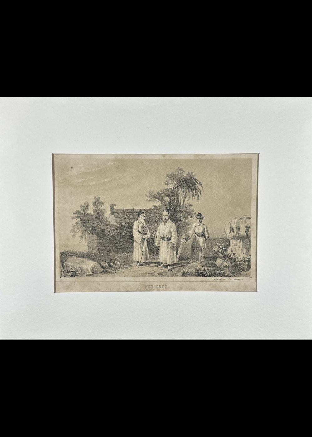 This finely rendered lithograph titled China presents a classic 19th-century Western view of the Far East, featuring a majestic Chinese junk ship with its distinctive battened sails, drifting gracefully near a tropical shoreline. The vessel is bustling with figures, capturing the maritime vitality and cultural richness of China’s coastal life during the Qing Dynasty era. Palm trees and a pagoda-style tower rise in the background, lending the composition an exotic and romanticized ambiance typical of the period. Produced by Sarony & Co., a prominent New York-based lithographic firm, the print reflects Western fascination with Asia during the age of exploration and early global trade. The soft tones and detailed linework make this lithograph both an artistic and historical artifact.