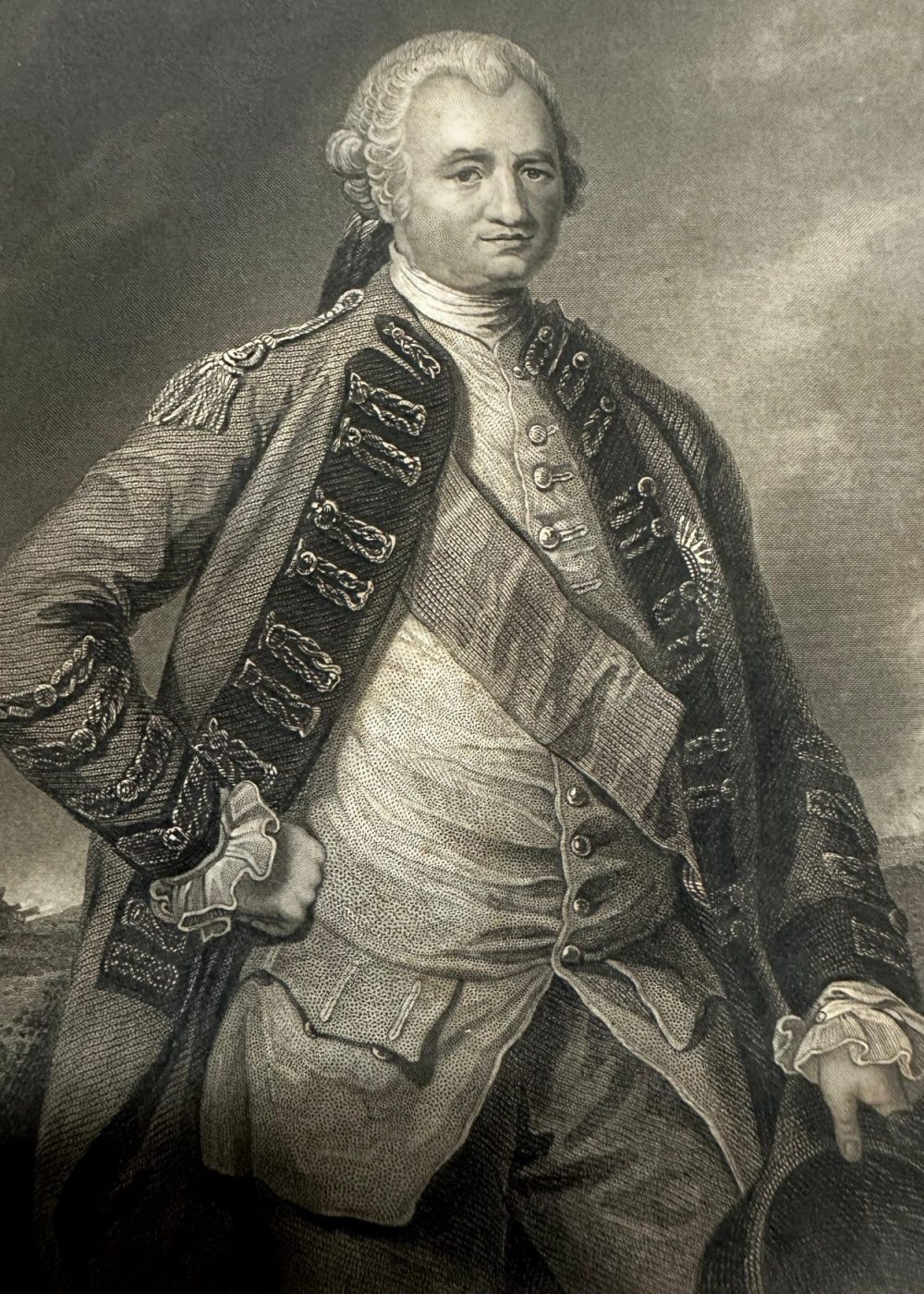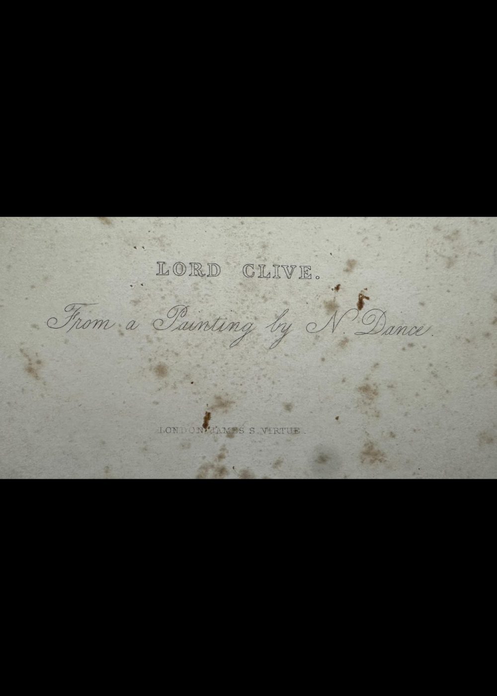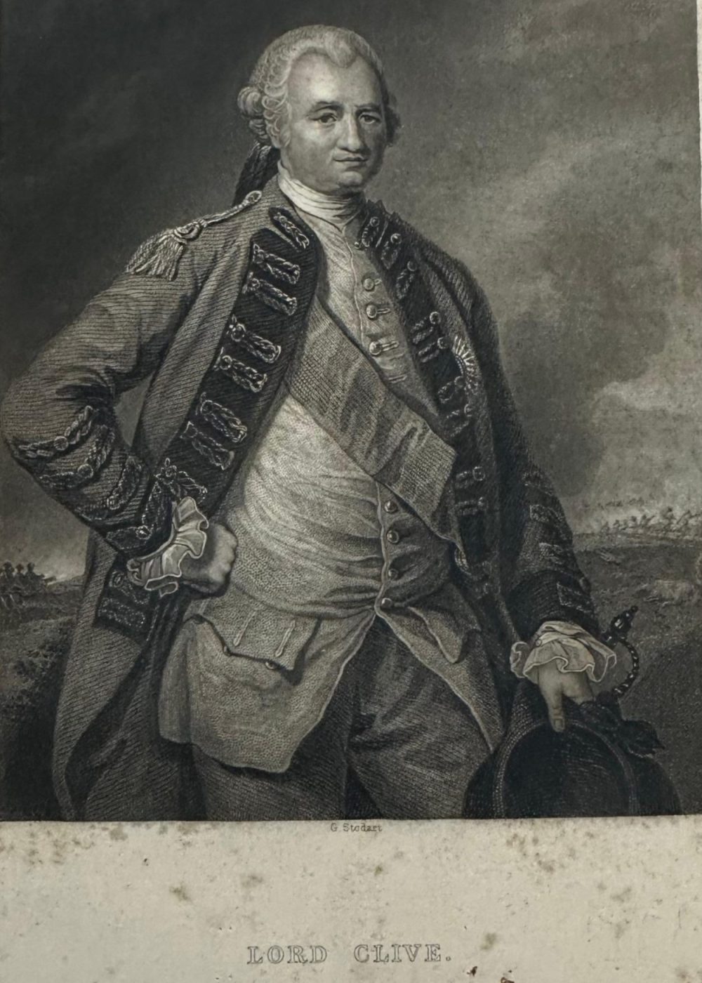This is a historical engraving of Lord Clive, also known as Robert Clive, a key figure in British colonial history. Dressed in an ornate military uniform with elaborate embroidery and epaulettes, Clive is portrayed in a confident pose, his left hand resting on a tricorne hat and his right hand on his hip. The background suggests a battlefield or a military encampment, alluding to his role in British military campaigns. Best known for his leadership in the Battle of Plassey (1757), Clive was instrumental in establishing British control over India through the East India Company. The engraving, signed by G. Stodart, reflects the 18th- to 19th-century tradition of glorifying colonial figures in formal portraiture.
