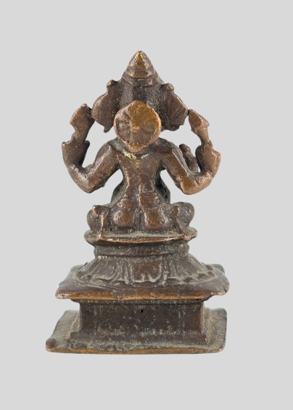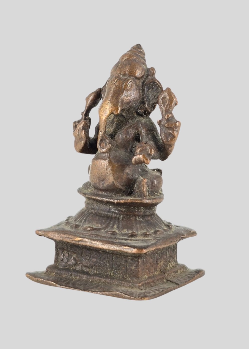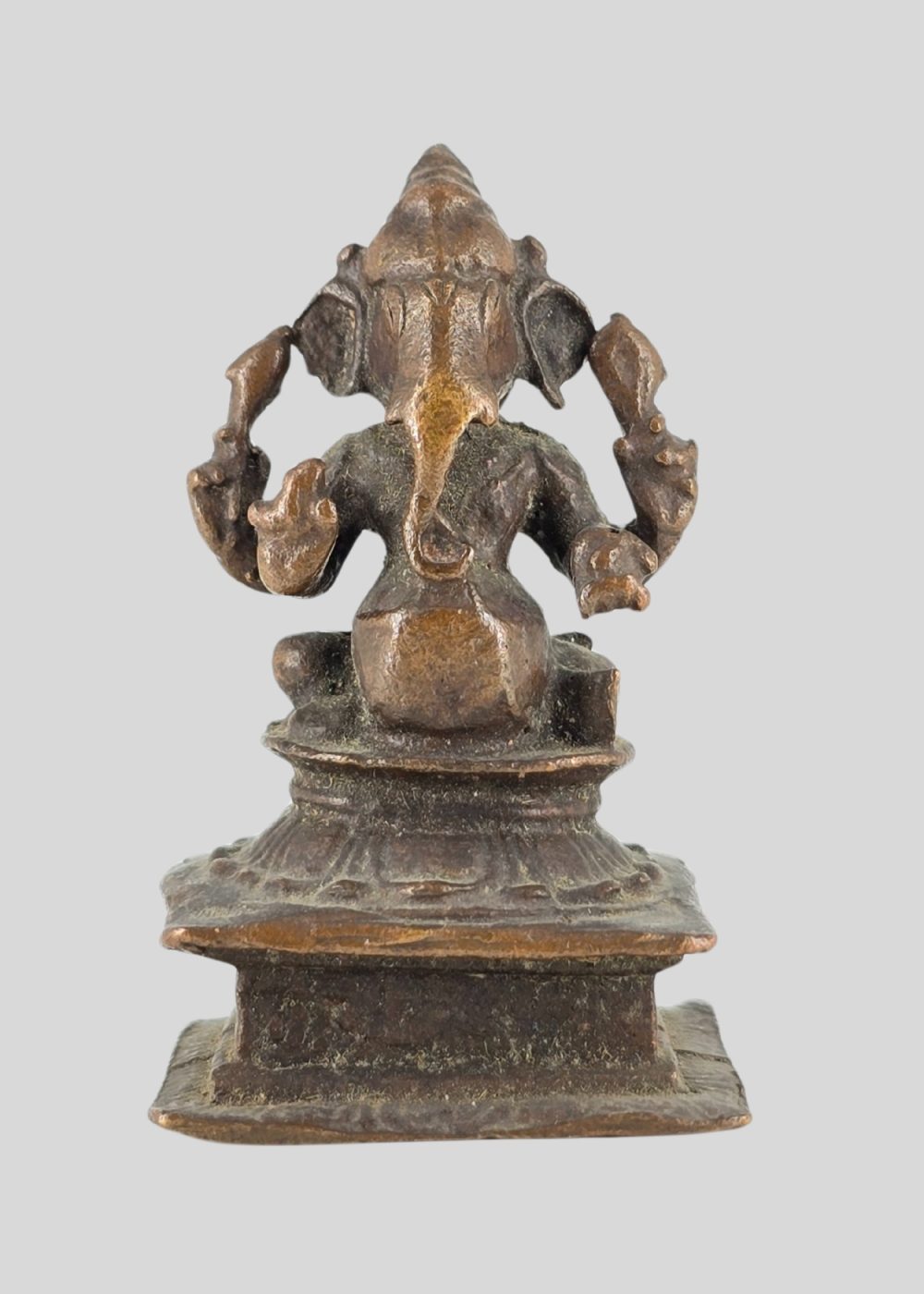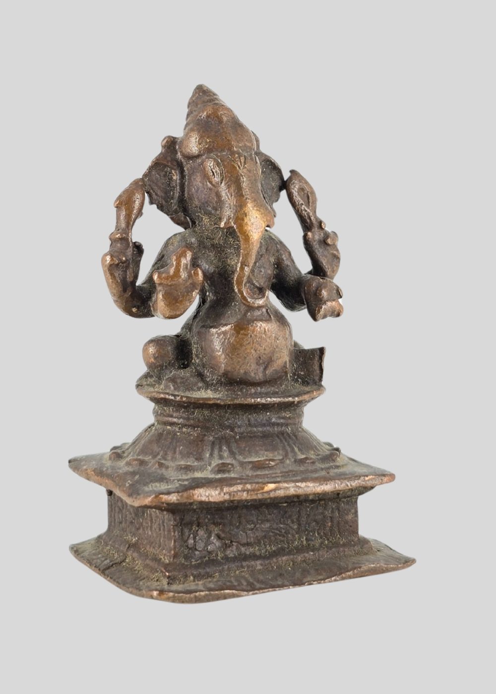 This bronze sculpture of Lord Ganesh depicts the deity seated gracefully with his characteristic elephant head and multiple arms holding symbolic attributes. Crafted with devotion and fine detailing, it embodies wisdom, prosperity, and the traditional artistry of Indian metalwork.