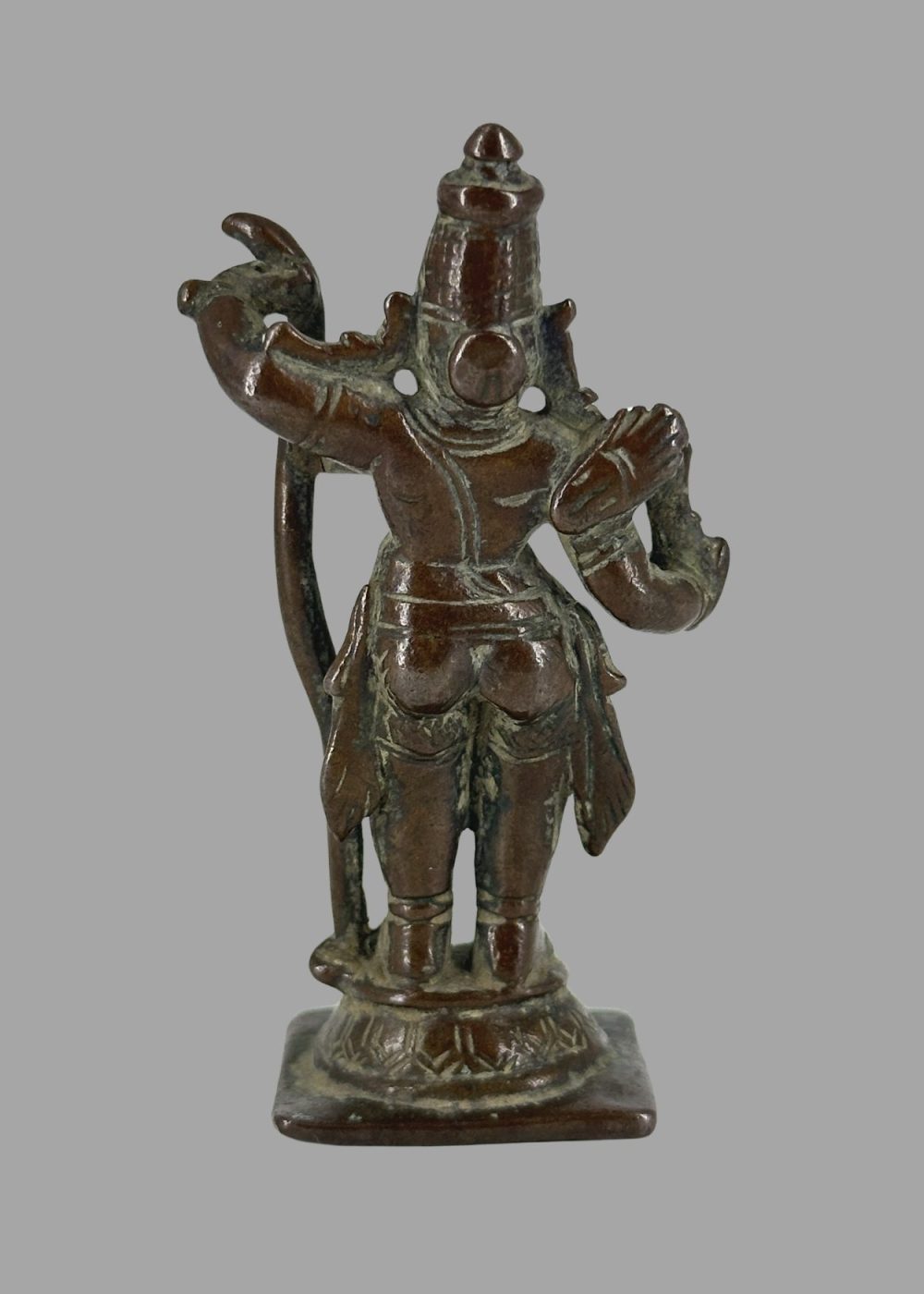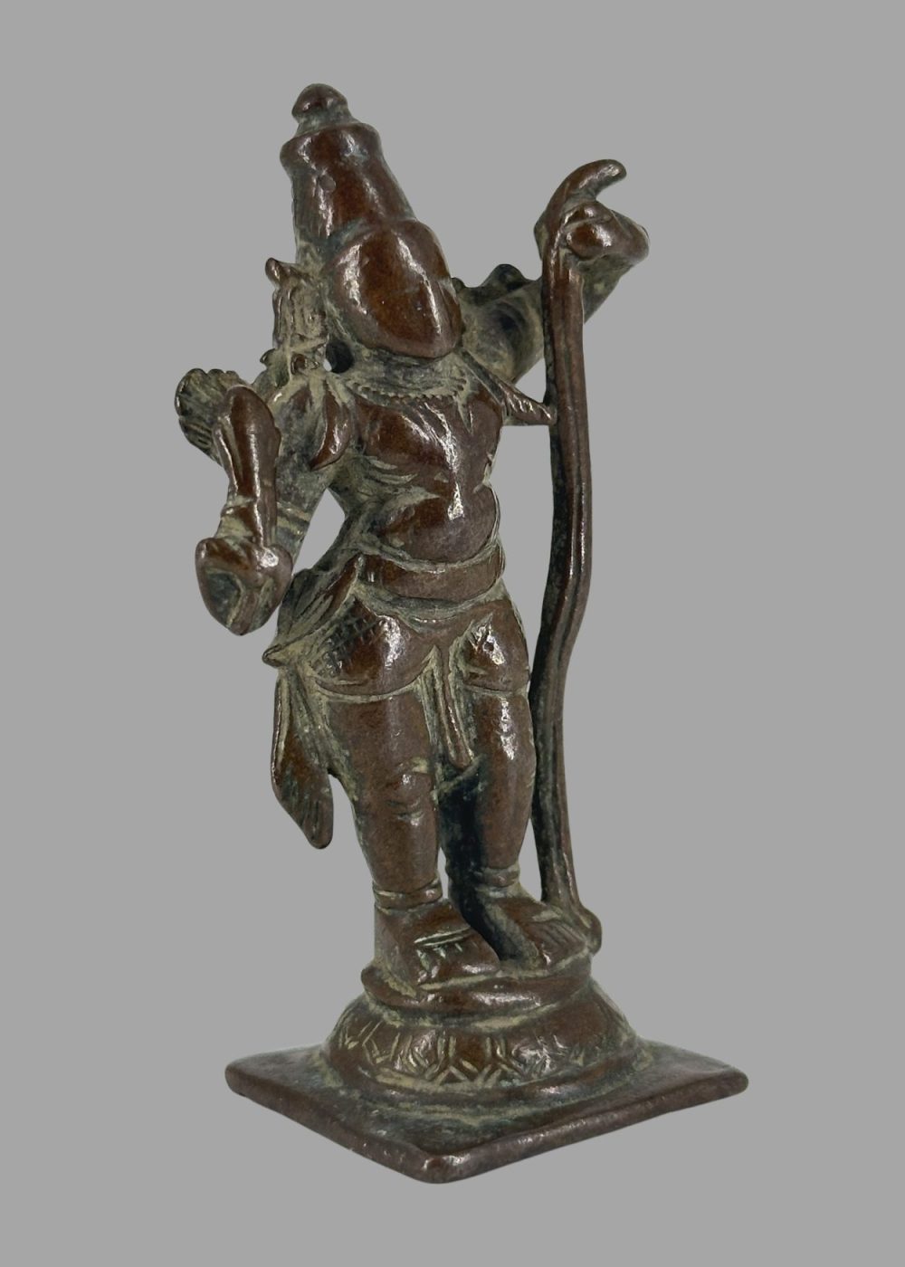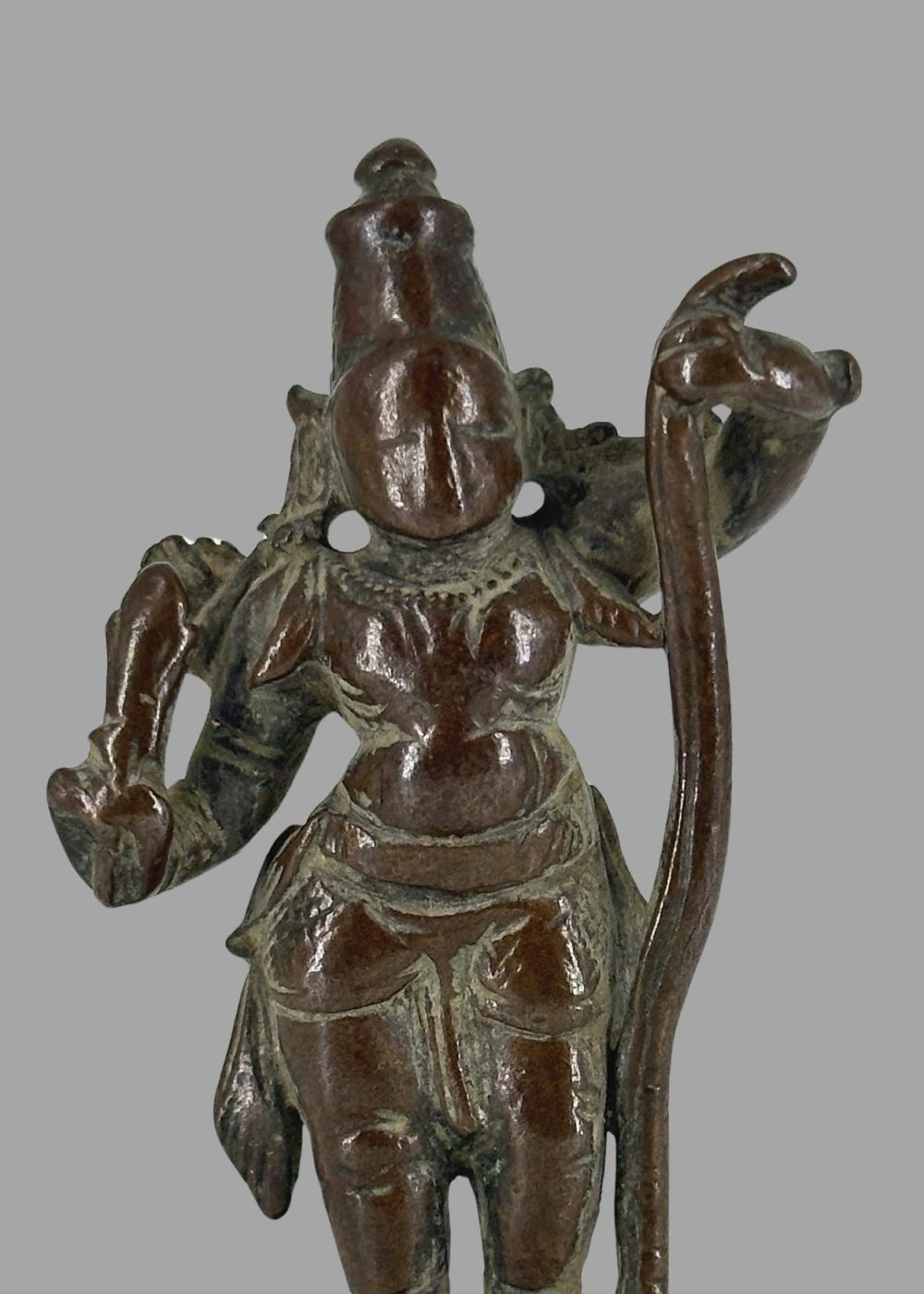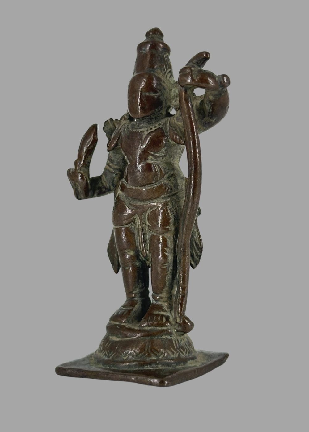 This bronze sculpture from Karnataka depicts Lord Murugan, the revered warrior deity, holding his signature spear (vel). Rendered with dynamic posture and fine detail, the piece reflects the region’s accomplished bronze-casting tradition and enduring spiritual heritage. A beautiful example of South Indian devotional artistry.