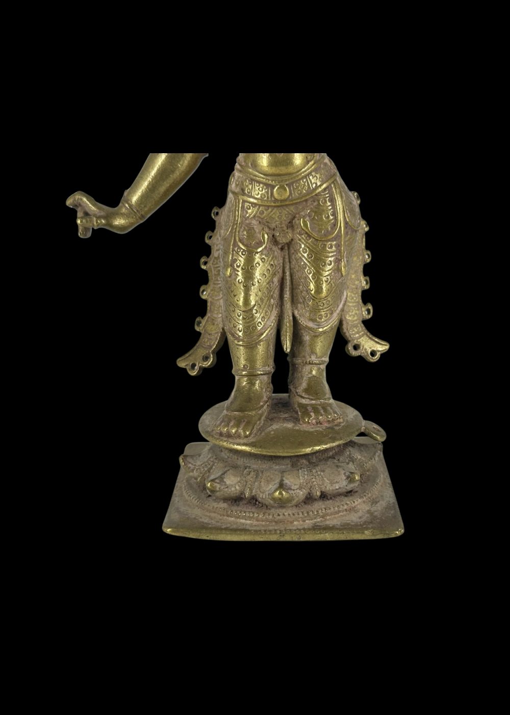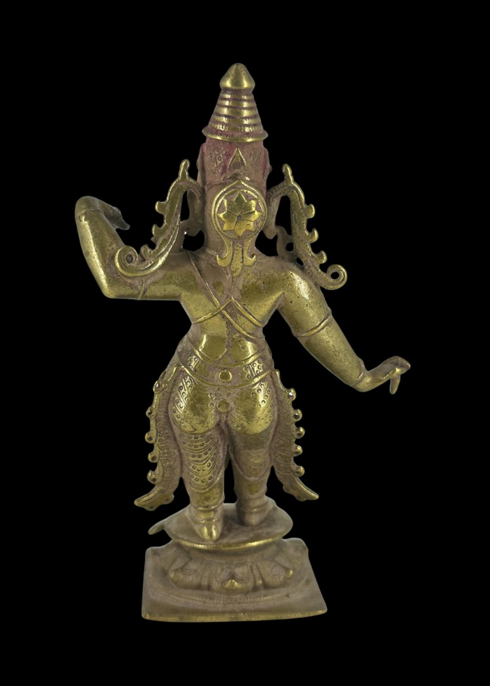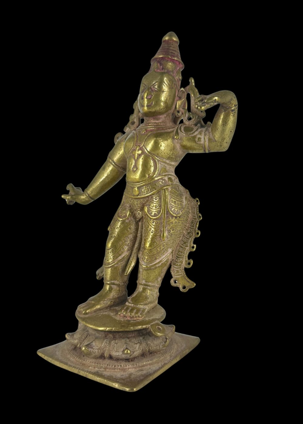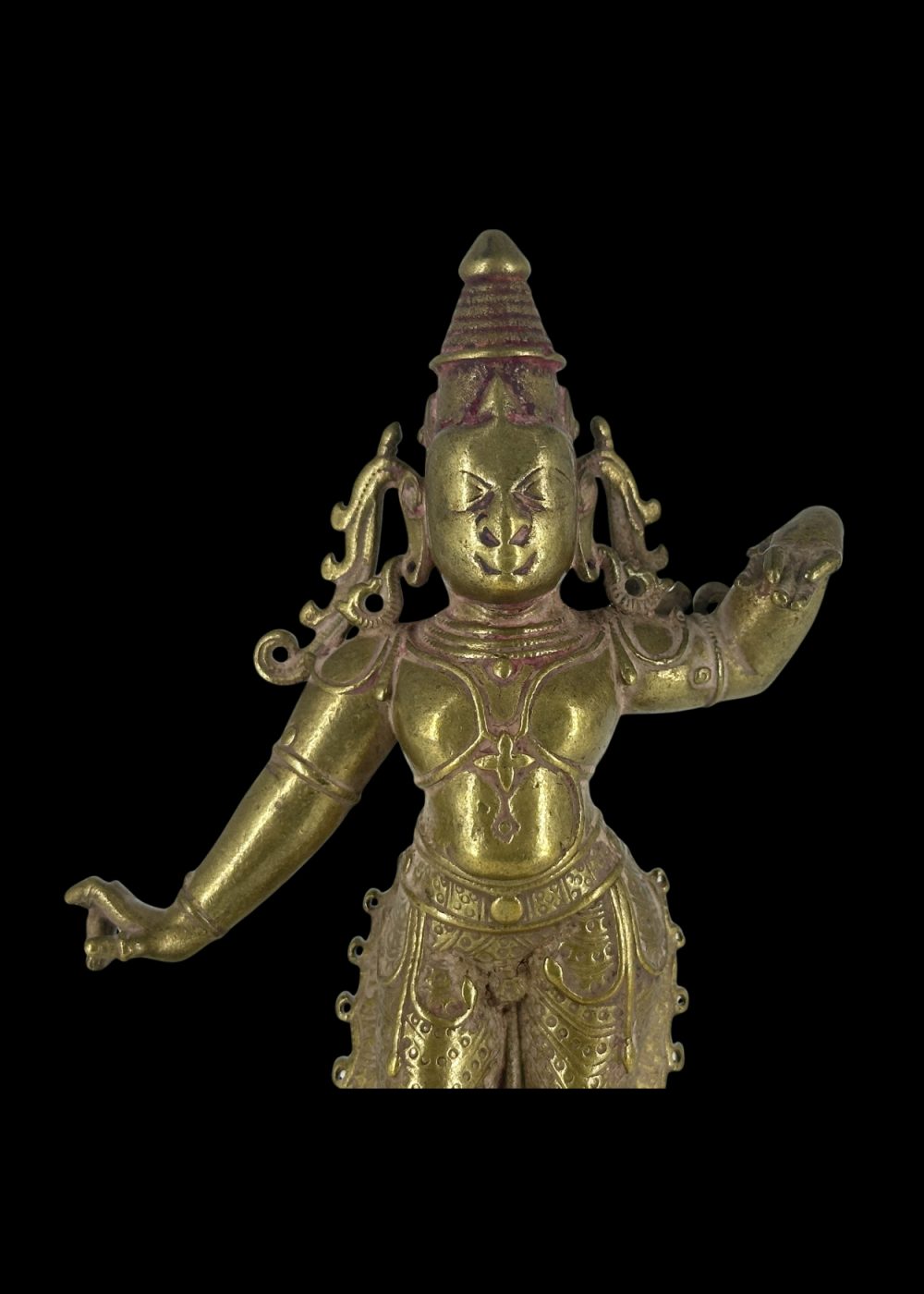 This exquisite bronze sculpture from Karnataka represents Lord Rama, the seventh avatar of Vishnu and hero of the Ramayana. Created during the Vijayanagara period, the figure stands gracefully on a lotus pedestal, embodying divine strength and serenity. Rama is depicted in a frontal stance with finely modeled limbs and a serene expression. His characteristic attributes include a high conical crown (kirita-mukuta), elaborate earrings, and a richly ornamented dhoti with intricate detailing, typical of South Indian bronze art. His right hand is shown in the abhaya mudra, symbolizing protection and reassurance, while the left hand, now partially damaged, would have originally held a bow, referencing his role as a warrior prince. The refined detailing of the ornamentation and balanced posture exemplify the devotional and artistic excellence of the Vijayanagara bronze tradition. This icon would have been used in ritual worship, processions, and temple festivals, where it served as a living embodiment of Rama’s divine presence.