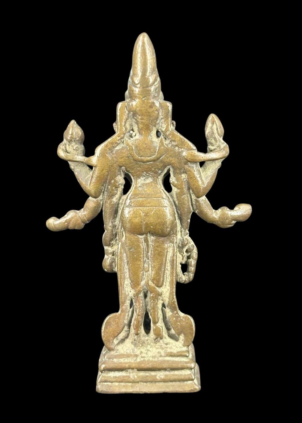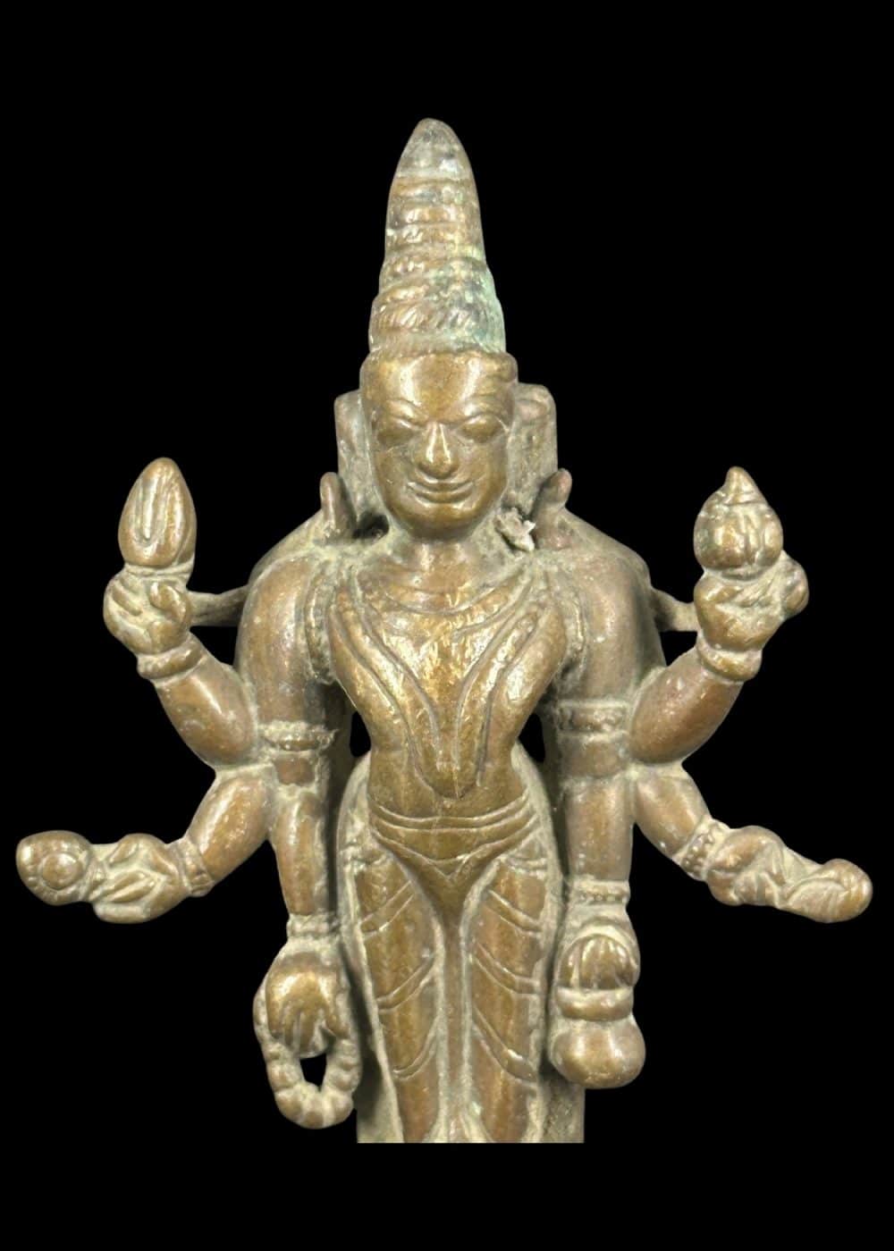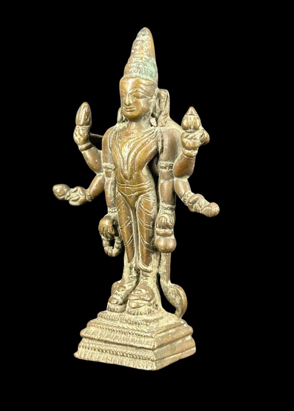 Bronze statue of Lord Vishnu, depicted standing with four arms holding his divine attributes — the conch (shankha), discus (chakra), mace (gada), and lotus (padma). Adorned with a tall crown and intricate ornaments, the deity stands gracefully on a decorated pedestal, symbolizing preservation and protection in Hindu tradition.