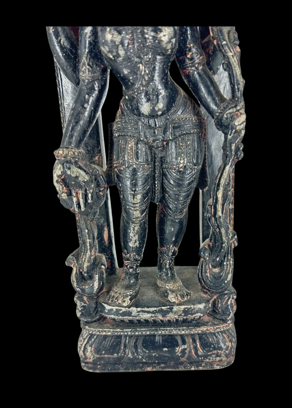 This 20th-century sculpture from Karnataka, South India, is carved from soft black stone and reflects the region’s rich tradition of refined stone craftsmanship. Depicting a standing Hindu deity adorned with intricate jewelry, a tall crown, and framed by an ornate arch (prabhavali), the piece exemplifies devotional artistry and detailed workmanship typical of South Indian temple sculpture.