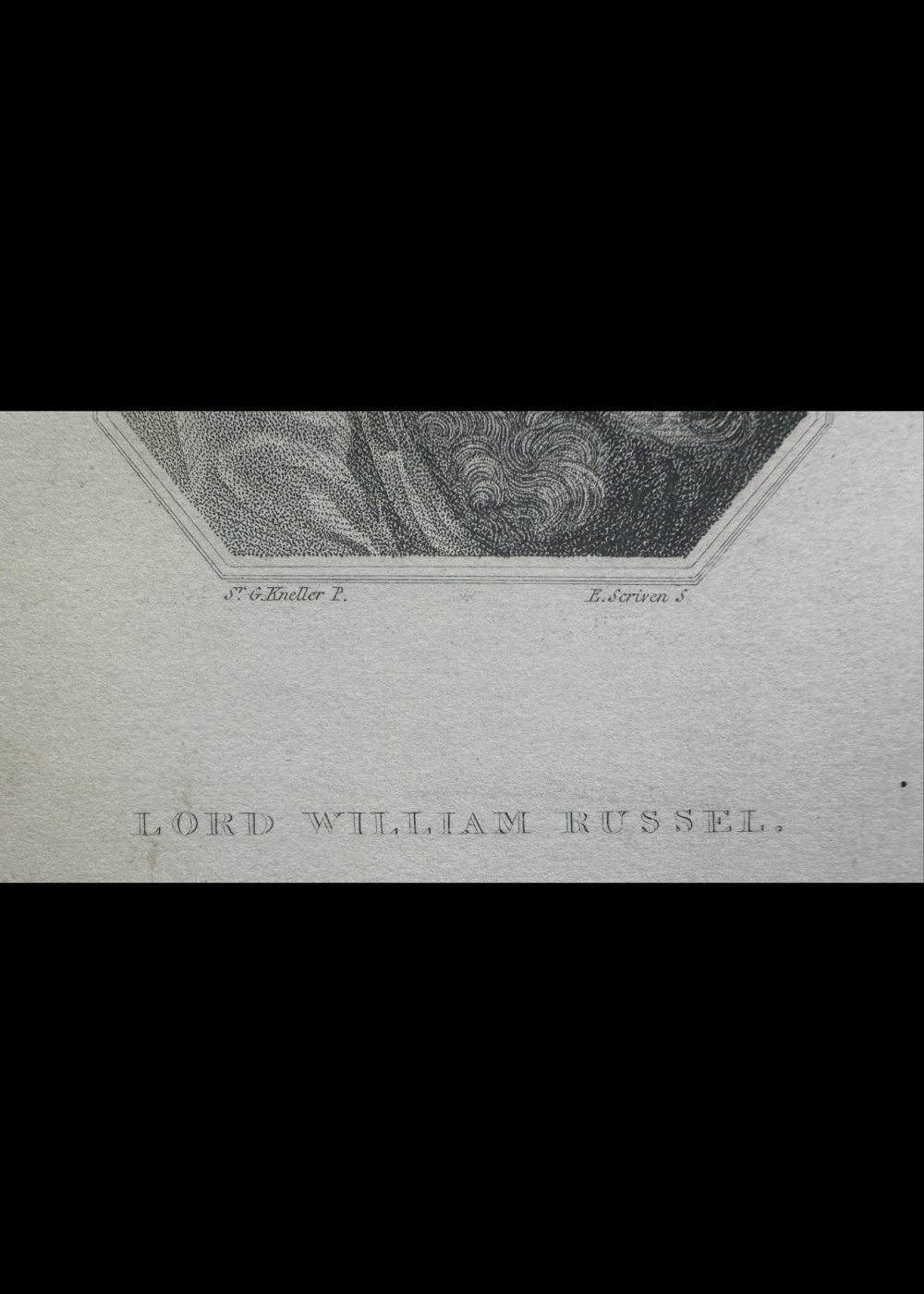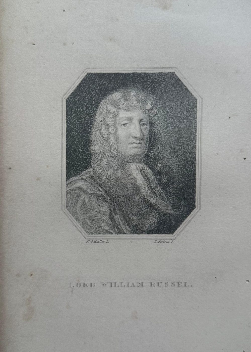 “LORD WILLIAM RUSSEL.” (29 SEP 1639-21 JULY 1683) Was an Engalish politician. He was a leading member of the country party. This commemorative portrait captures Lord William Russel, an English statesman and advocate for constitutional liberty, executed in 1683. Shown in voluminous robes and flowing hair, Russel’s expression is rendered with solemn dignity—echoing his legacy as a political martyr. The engraving’s fine tonal modulation and crisp delineation highlight Edward Scriven’s skill in translating Kneller’s original painted likeness into print. Inscribed below with “LORD WILLIAM RUSSEL,” and crediting “Sr. G. Kneller P.” and “E. Scriven S.,” the work reflects 19th-century Romantic fascination with historical figures of moral conviction.