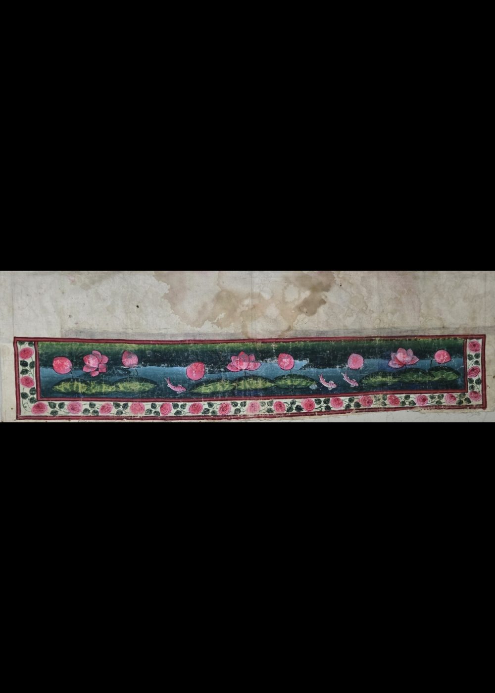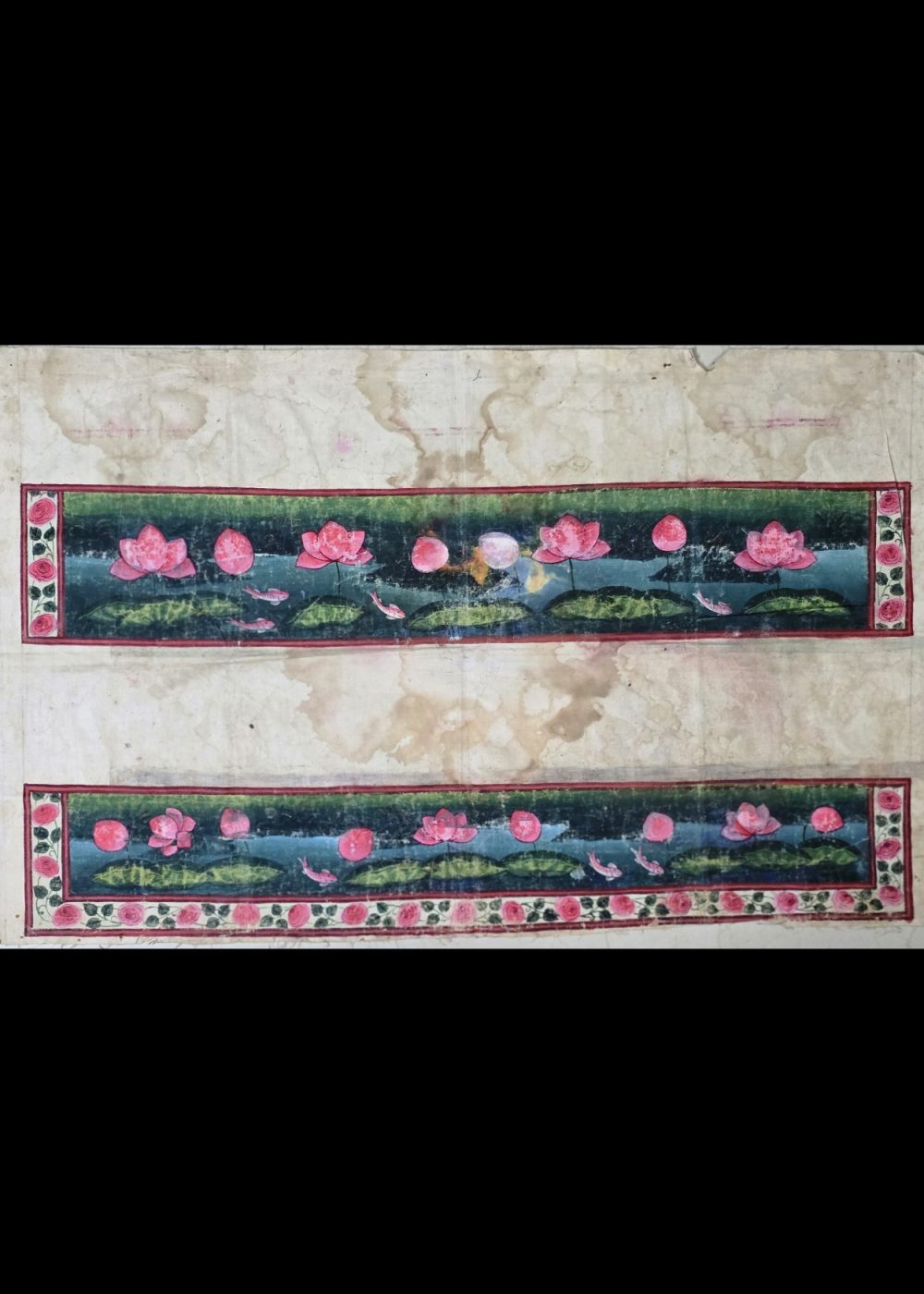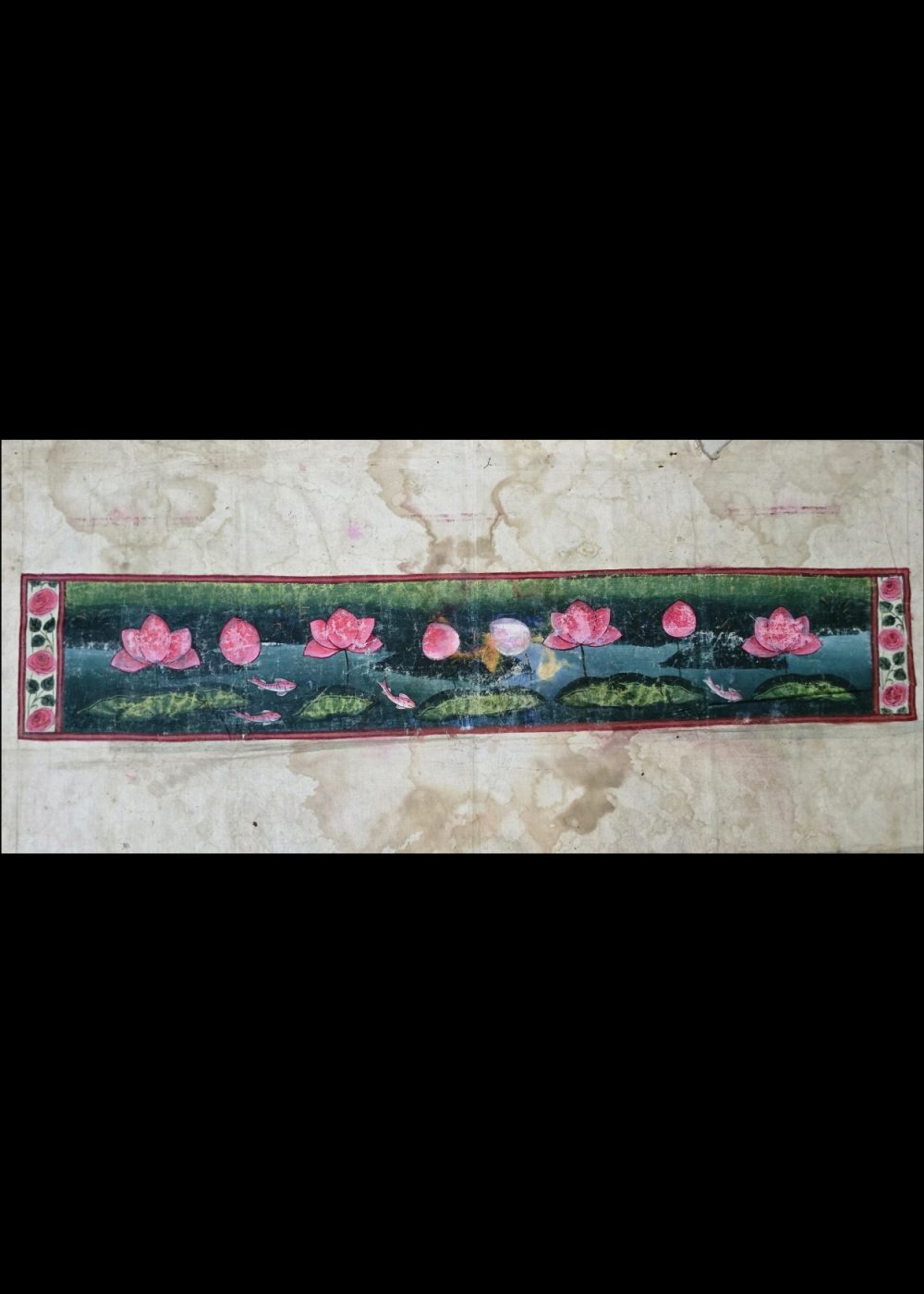 The painting is rendered on an aged, off-white paper that shows signs of wear and water stains, which adds to its vintage charm and authenticity. The soft yet vivid colors, coupled with the detailed floral motifs and aquatic life, evoke a sense of peace and natural harmony, typical of classical Indian art celebrating the beauty of nature and spirituality.