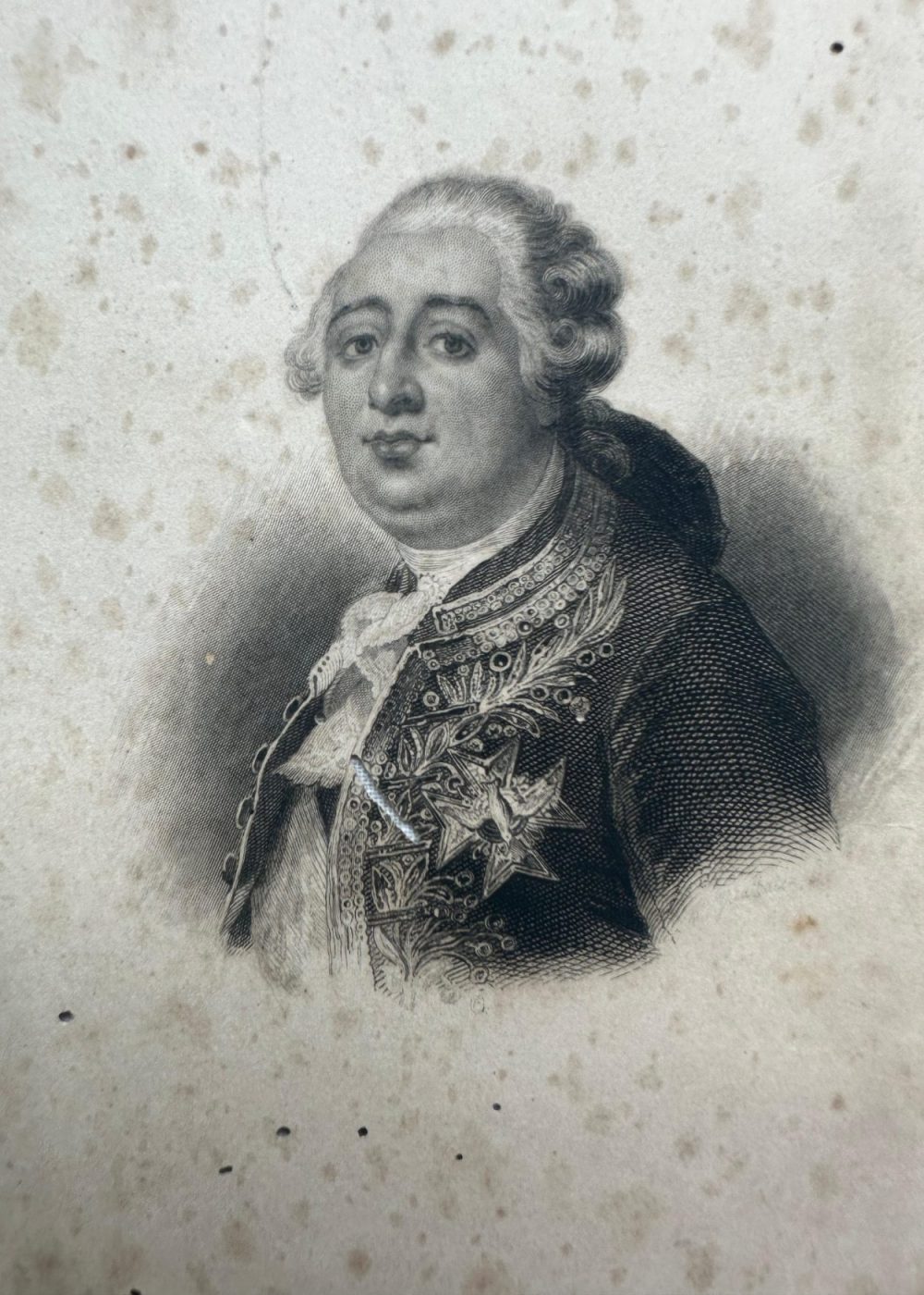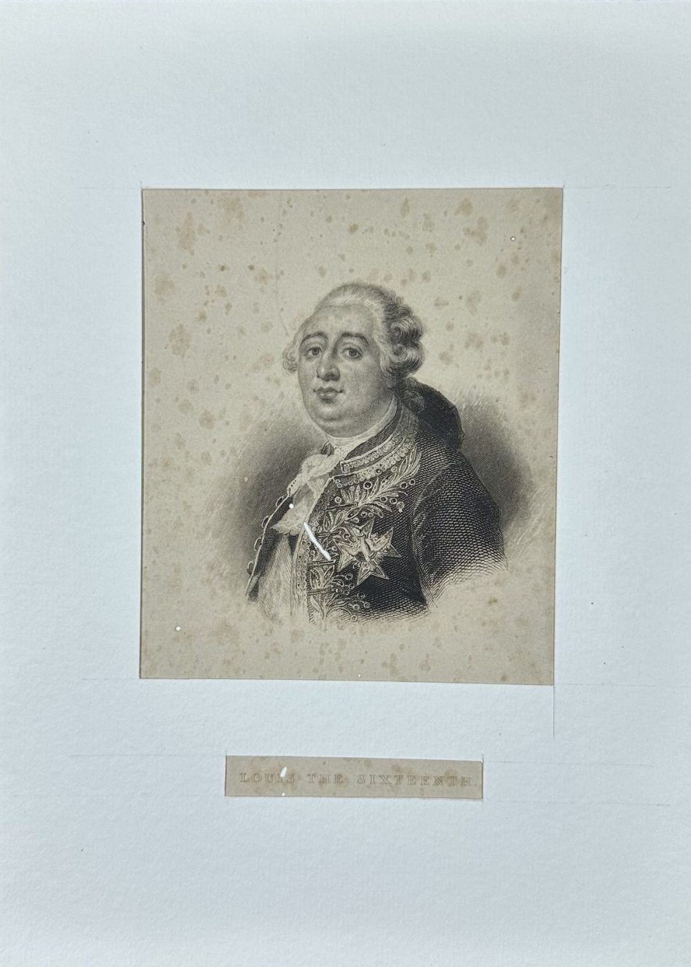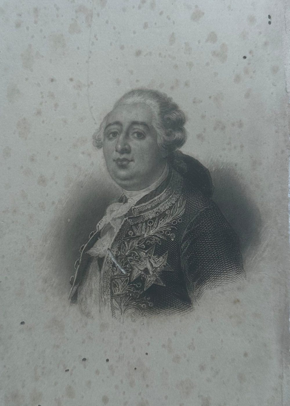 This finely executed engraving portrays Louis XVI, the last king of France before the fall of the monarchy during the French Revolution. Depicted in full regalia with the Order of the Holy Spirit prominently displayed on his chest, the king wears a richly embroidered coat and lace cravat, emblems of royal authority and courtly refinement. The portrait emphasizes the monarch’s solemn bearing and dignified poise, projecting an image of strength and stability. Yet, history would judge Louis XVI as a ruler caught between tradition and revolution. His reign was marked by mounting financial crises, political unrest, and ultimately the collapse of the ancien régime. In 1793, he was tried for treason and executed by guillotine, an event that profoundly reshaped the political landscape of Europe. Engravings such as this were widely circulated across Europe, serving as both royal iconography and historical documentation during an era of rapid change.