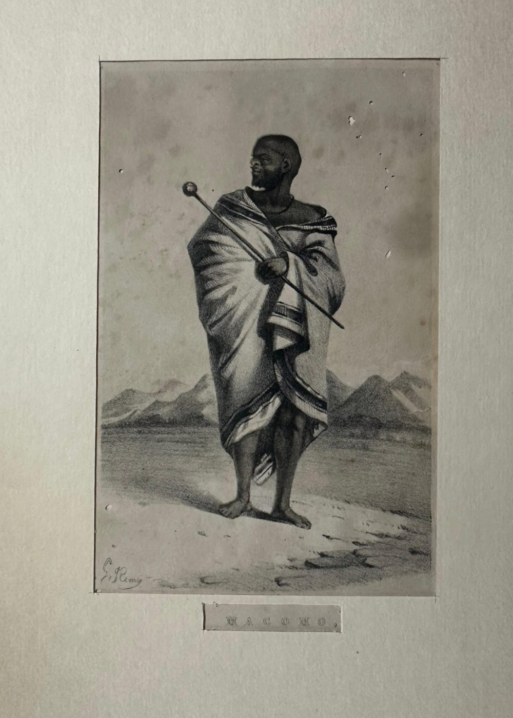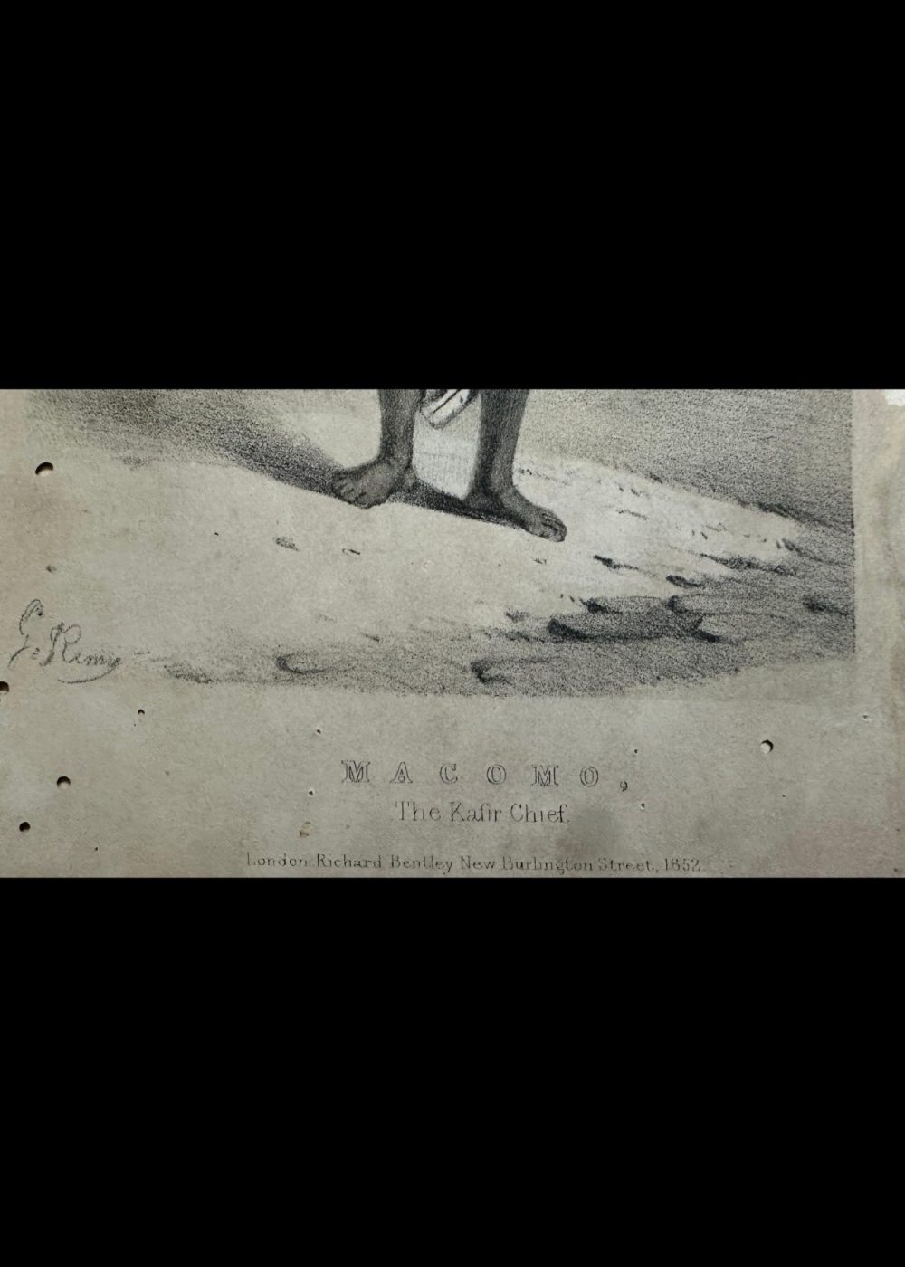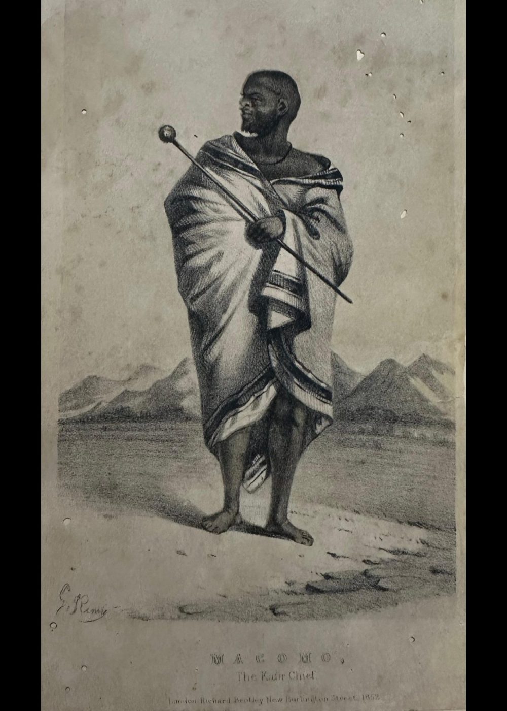 This 19th-century lithograph depicts Magomo, identified in the title as “The Kafir Chief”, a term historically used in colonial contexts to describe Xhosa people, though now considered outdated and offensive. The portrait presents Magomo standing barefoot against a mountainous backdrop, wrapped in a traditional cloak and holding a long staff or scepter, symbolizing leadership or authority. The artist, E. Ransome, captures a dignified and commanding presence. The print was published in 1852 by Richard Bentley in London, reflecting European interest in indigenous African leaders during the period of British colonial expansion in southern Africa.