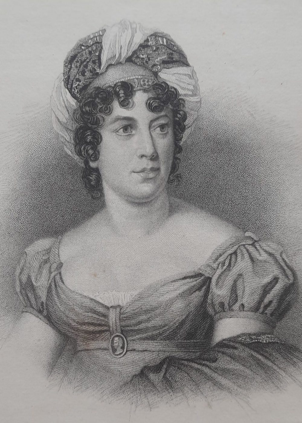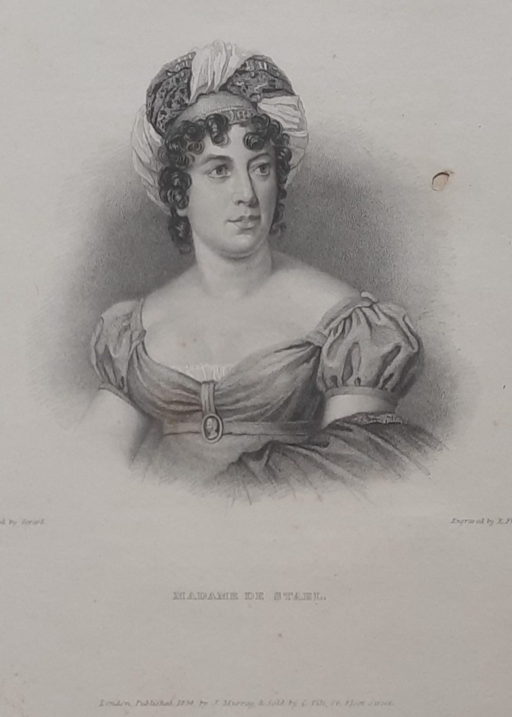 This finely detailed 19th-century engraving portrays Madame de Staël, a prominent French-Swiss woman of letters and political thinker. Renowned for her influential writings and salons during the Napoleonic era, she was a key figure in European intellectual life. The portrait, originally painted by Gérard and engraved by E. Finden, captures her with a composed expression, adorned in period attire with a cameo brooch and an elegant headwrap. Published in London in 1834 by J. Murray, this print exemplifies the era’s admiration for literary and cultural icons.
