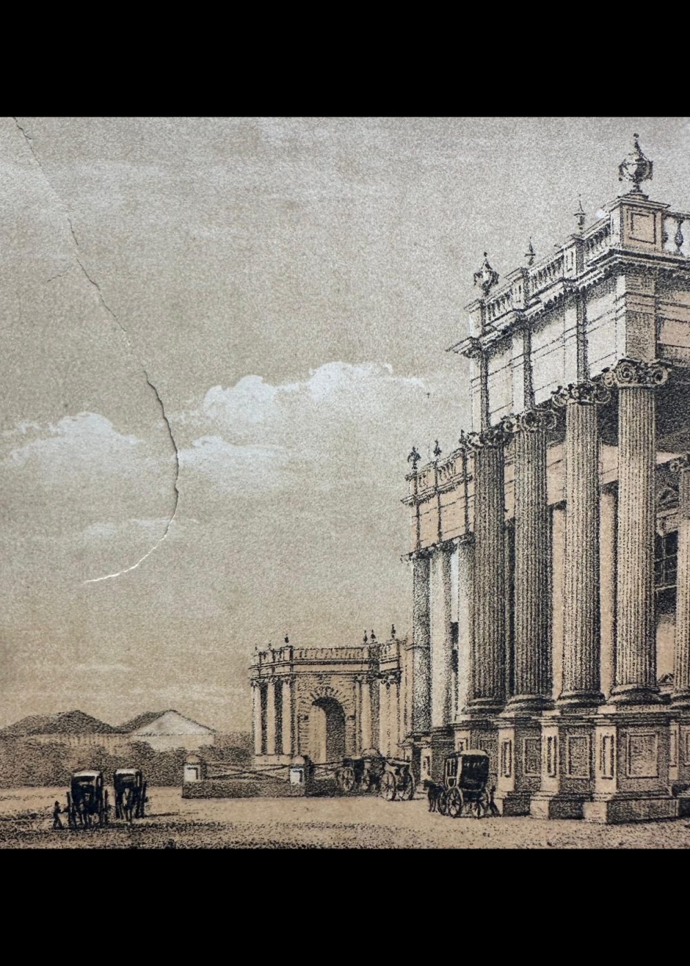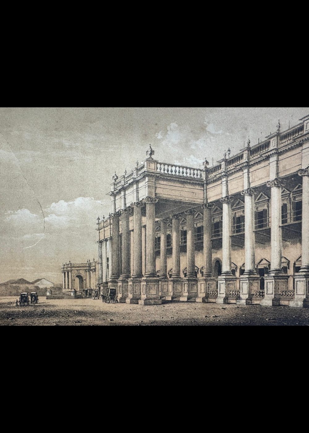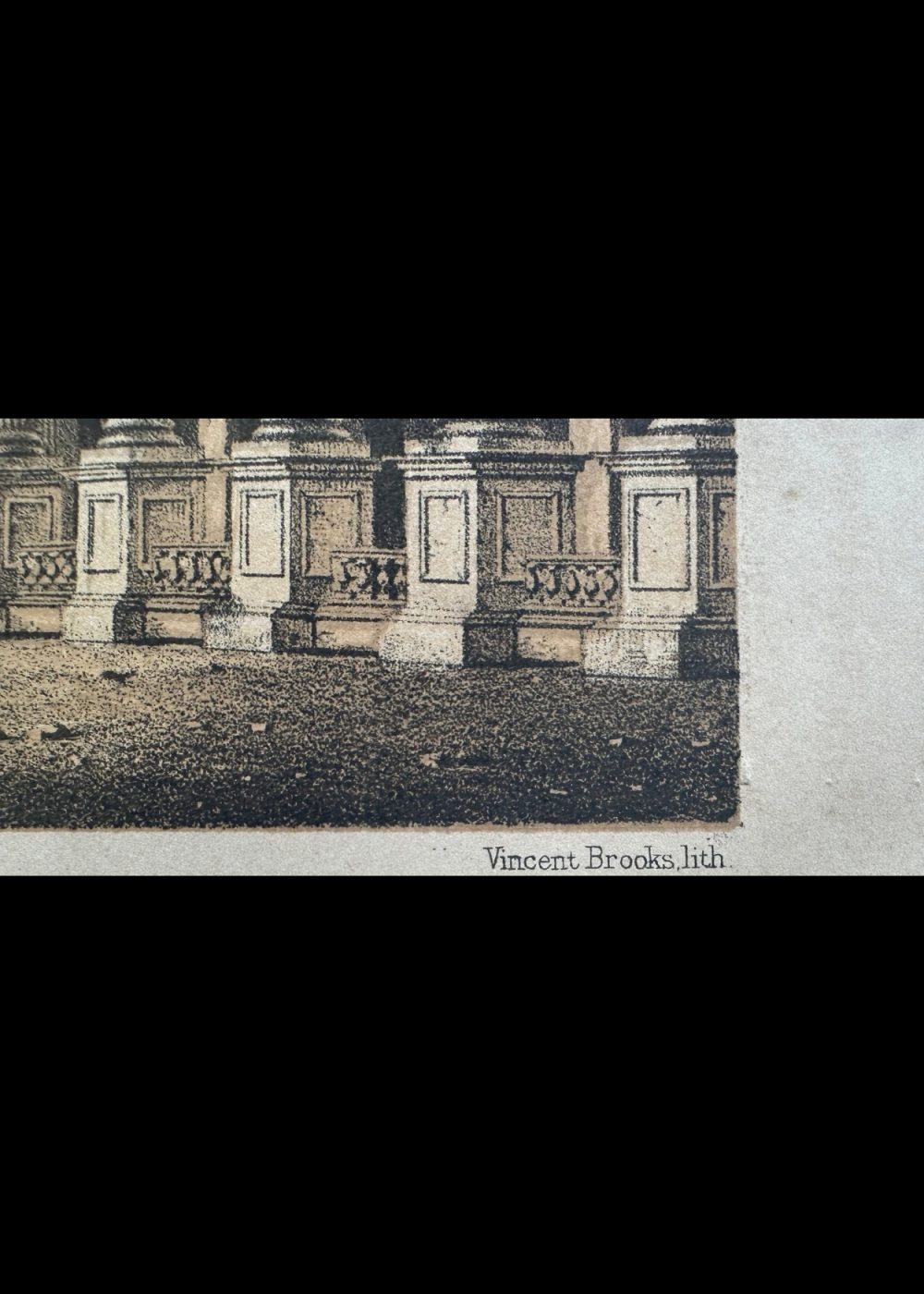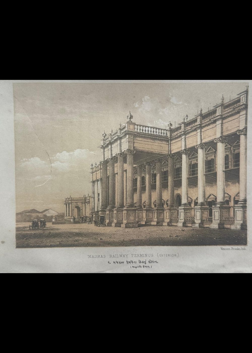 This is a cromo-lithograph of the Madras Railway Terminus, showcasing the exterior of the building in the 19th century. The artwork presents a grand architectural design with classical columns and a detailed façade. In the foreground, horse-drawn carriages are seen, reflecting the transportation methods of that era. The lithograph’s soft, sepia-toned palette adds a vintage charm to the scene, capturing the essence of colonial-era Madras (now Chennai), India. The piece is a part of the “Travel of India” book, emphasizing the rich heritage and infrastructure of British India during the period. The artist, Vincent Brooks, has signed the lithograph at the bottom.