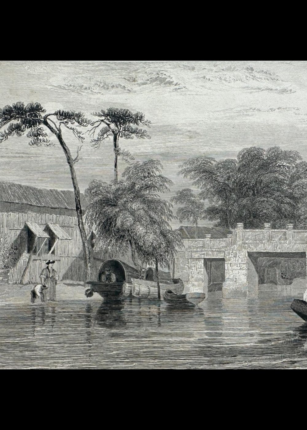 This engraving, titled Ruins About the Taj Mahal – Agra, showcases the architectural beauty of the Taj Mahal and its surrounding ruins in Agra, India. The detailed scene captures the crumbling structures and historical grandeur of the area, juxtaposing the iconic Taj Mahal’s majesty against the backdrop of time’s decay. The artwork was drawn by S. Austin, sketched by Captain R. Elliot of the Royal Navy, and engraved by T. Higham. It is part of the India and China book, offering a glimpse into the region’s rich history through the lens of 19th-century travel and exploration.