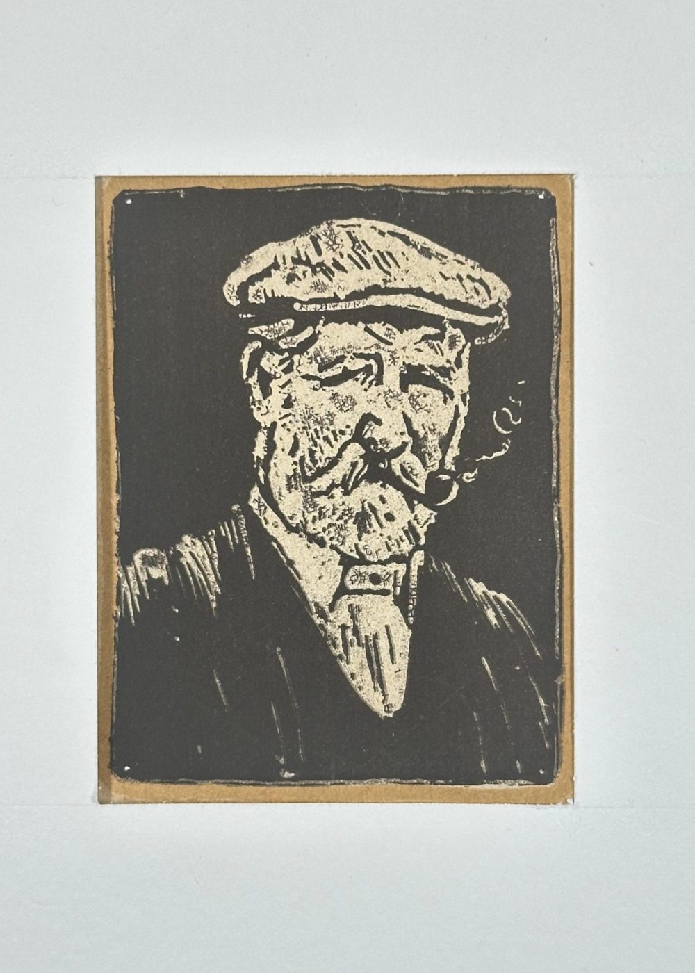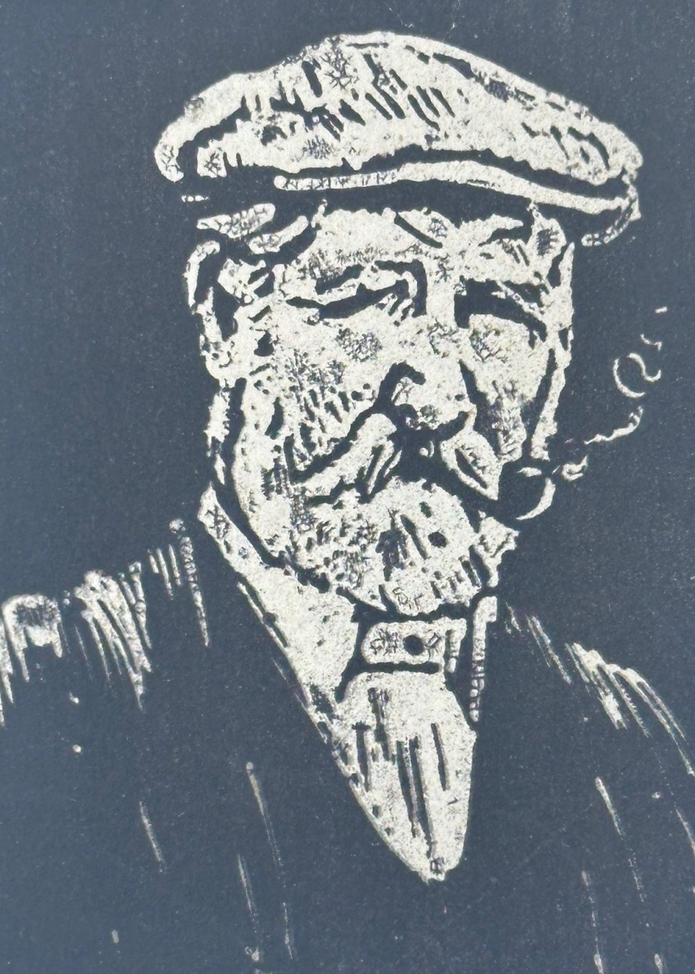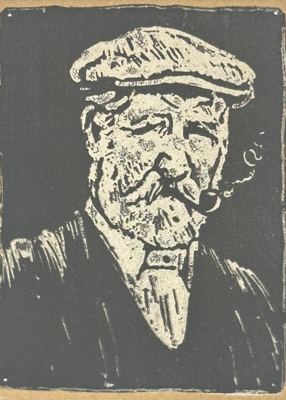 This striking monochrome lithograph presents a rugged male figure in a flat cap, rendered with bold, expressive lines and deep contrasts. The man’s weathered face, marked by a bushy beard and intense gaze, is partially obscured by the smoke of a pipe, evoking a sense of introspection and working-class resilience. The simplified, almost carved-out forms emphasize texture and character over fine detail, reflecting stylistic influences from early modernist printmaking. Set against a stark black background, the figure appears timeless—an archetype of rural or industrial masculinity. This work stands as a testament to the dignity of ordinary life, likely created during a period when artists turned their focus toward laborers and everyday subjects with reverence and bold visual economy.
