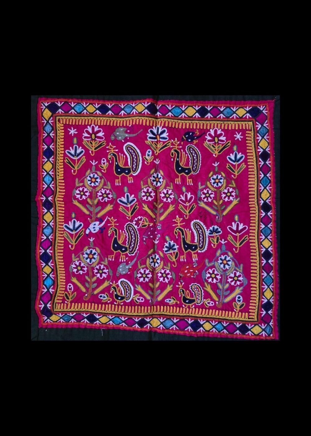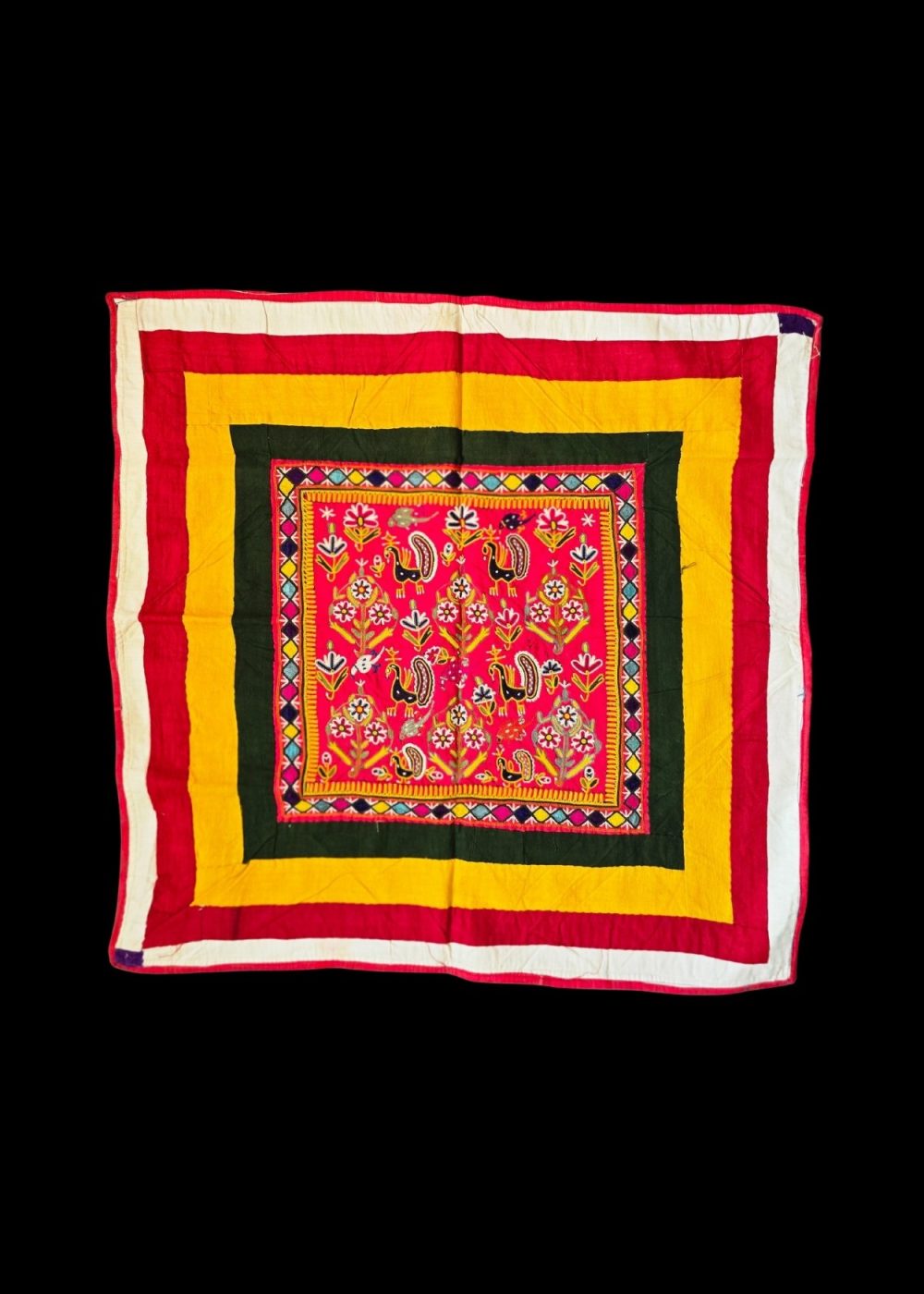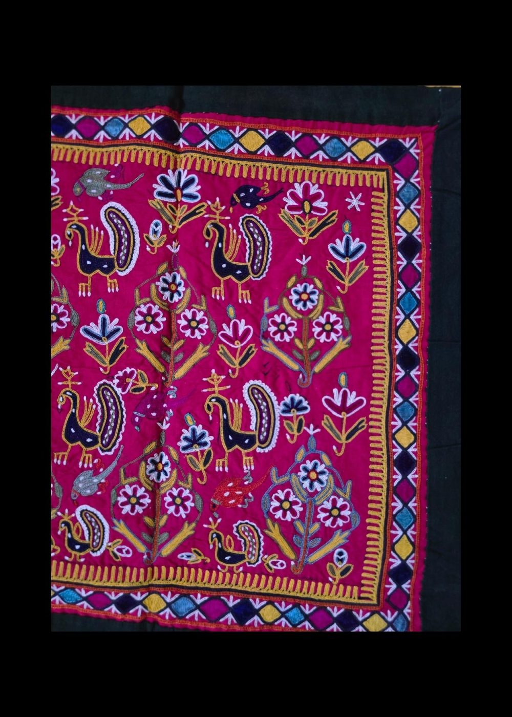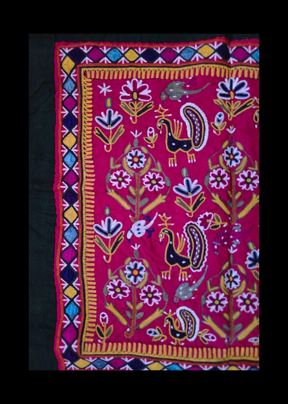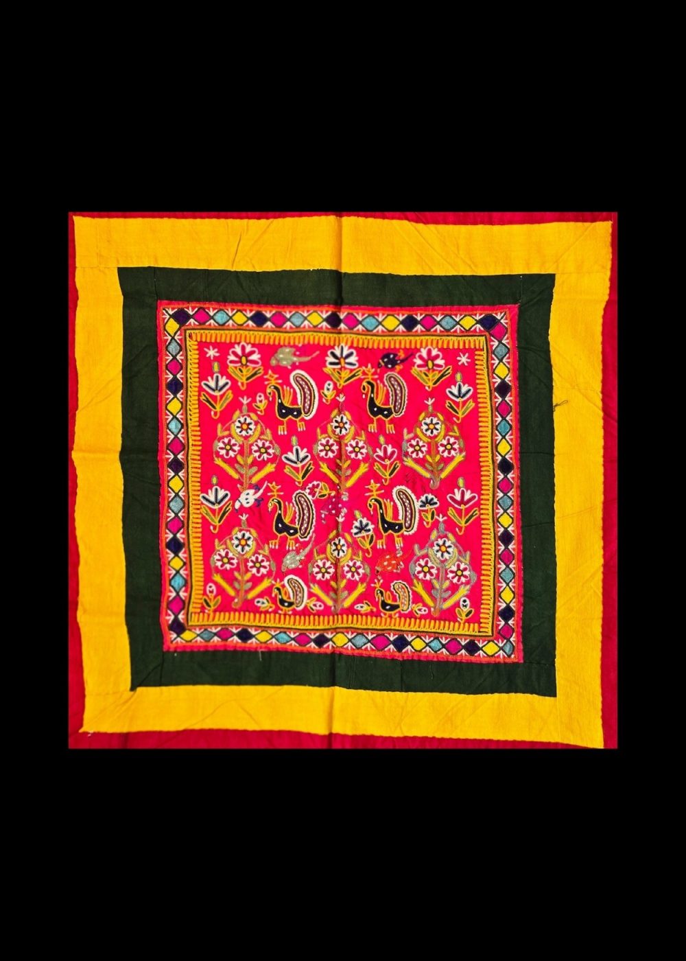 This vibrant Chakla (traditional Kutch embroidery) showcases intricate Mochi work with bold, colorful motifs. The central design features beautifully detailed peacocks and floral patterns in bright hues of pink, yellow, green, and white, framed by a series of geometric borders. The use of contrasting colors and detailed stitching exemplifies the artistry of Kutch, with its distinctive, lively style. Often used as a decorative textile, this piece highlights the rich cultural heritage of the Kutch region, blending traditional craftsmanship with striking visual appeal.
