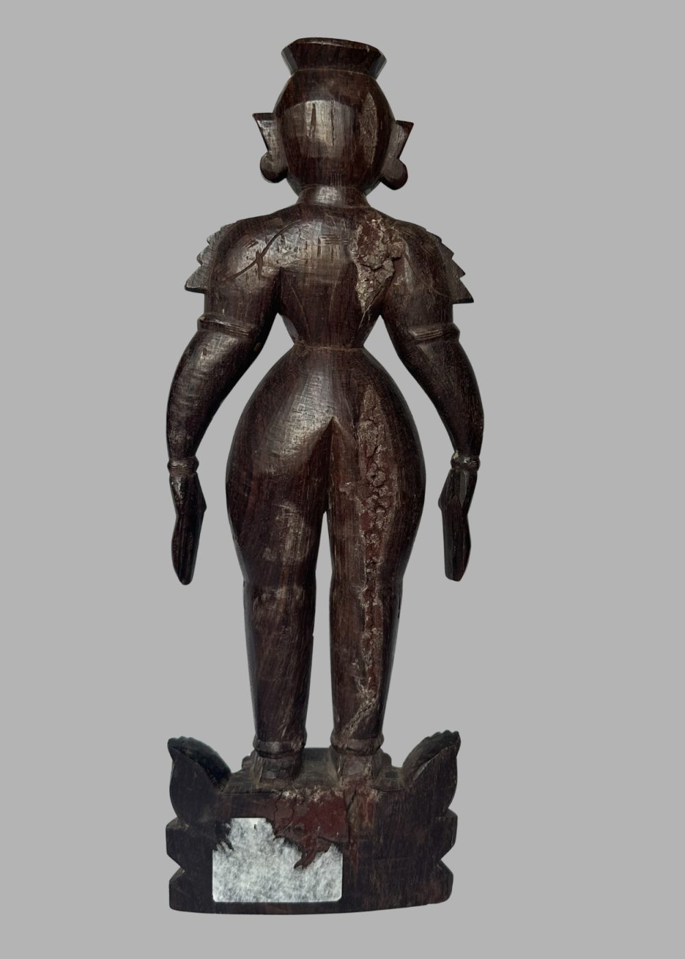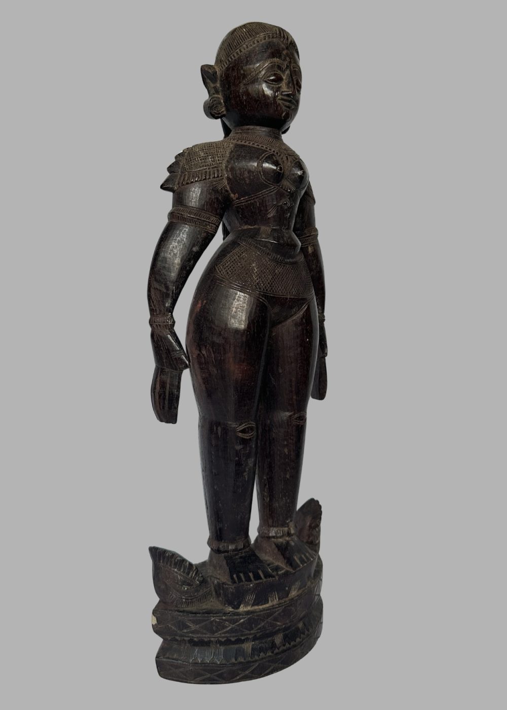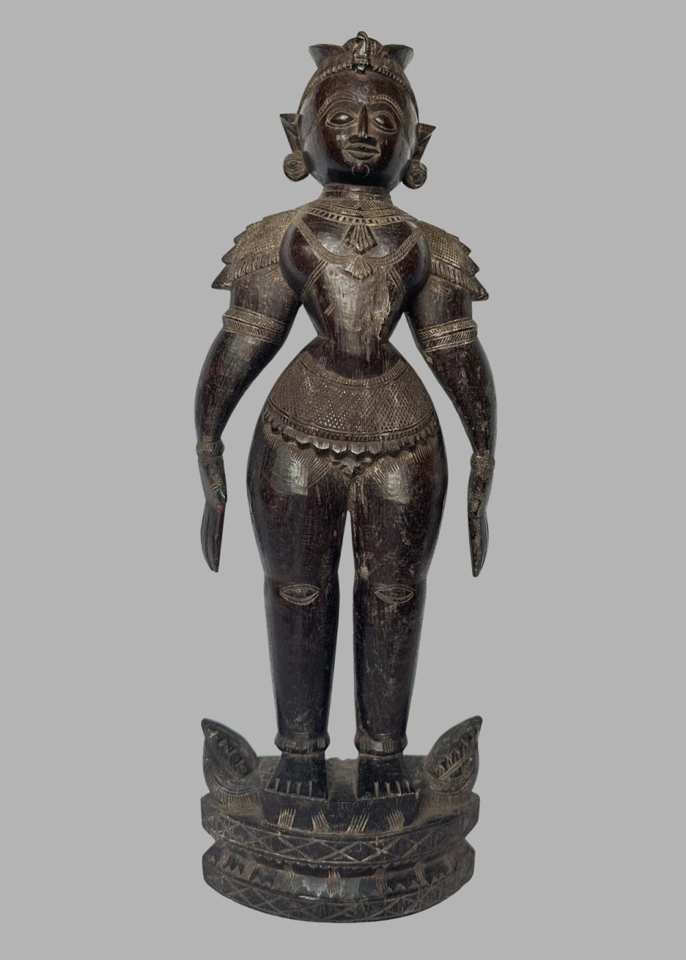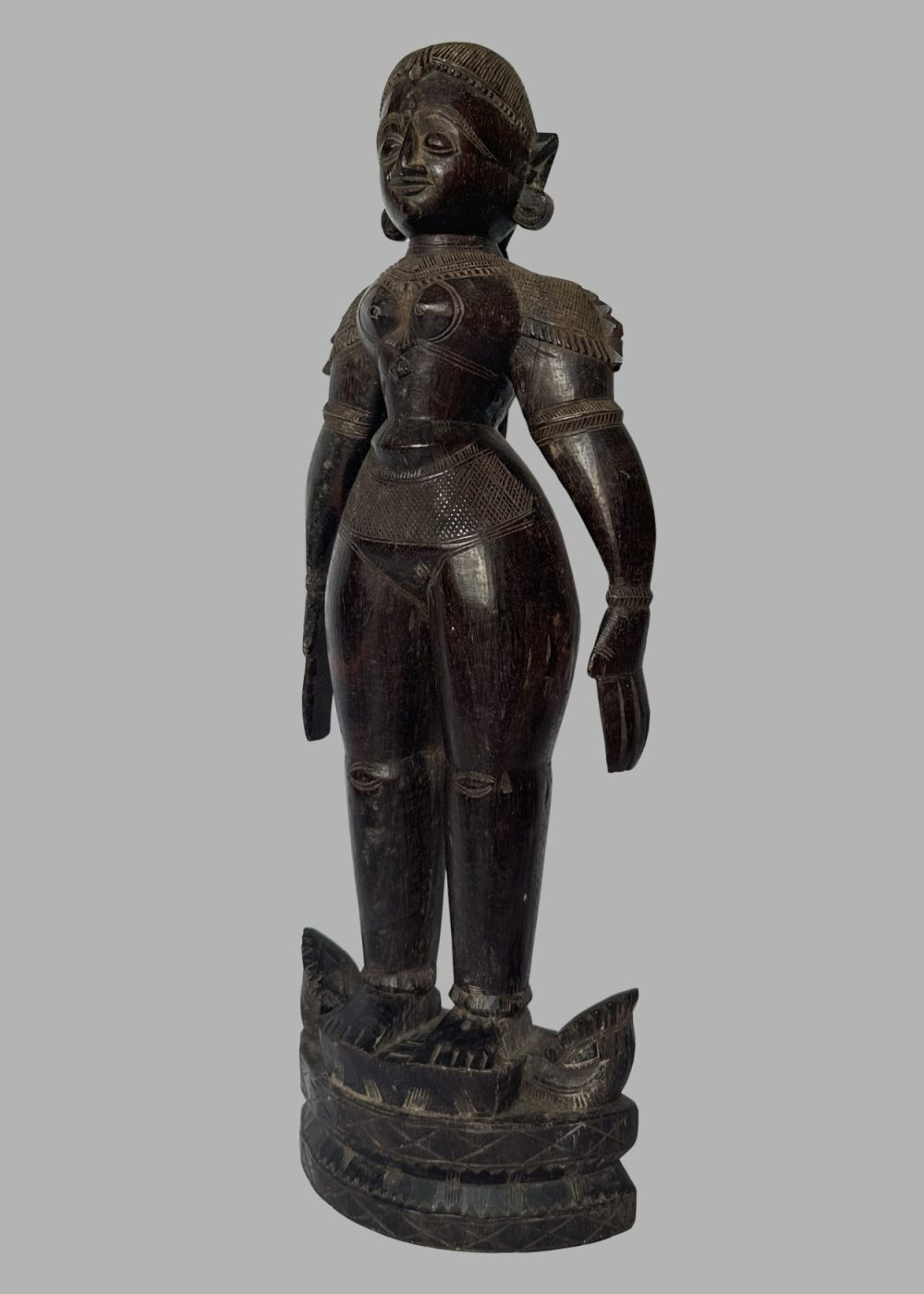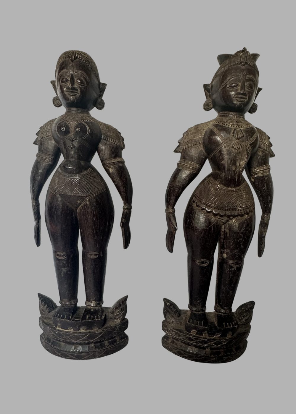 This pair of wooden sculptures, likely from South India, features two elaborately adorned female figures standing on stylized lotus bases. Crafted with precision and symmetry, the figures are depicted with traditional jewelry, ornate hairstyles, and detailed garments, reflecting classical Indian aesthetics. These sculptures may represent celestial beings or royal women, symbolizing beauty, grace, and cultural heritage through the region’s distinctive folk or temple art style.