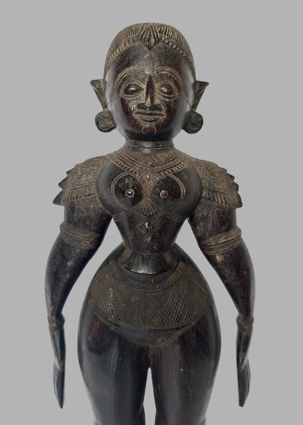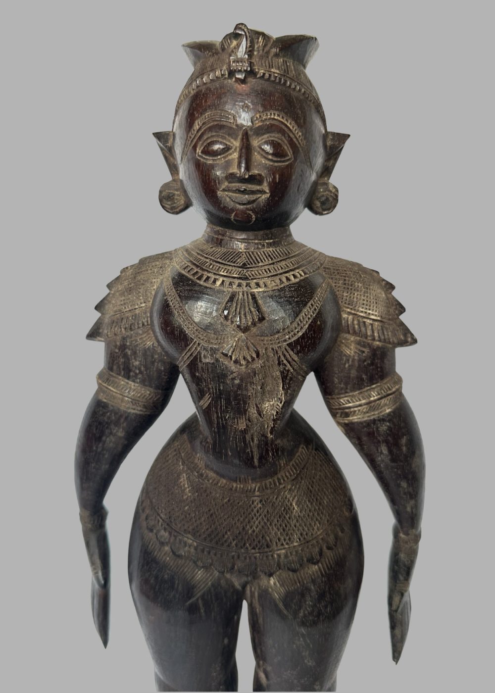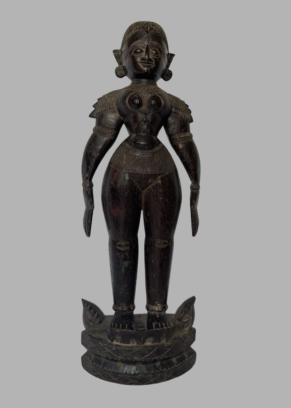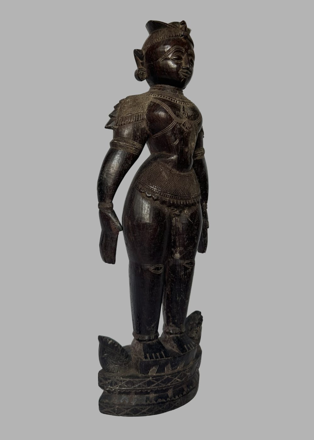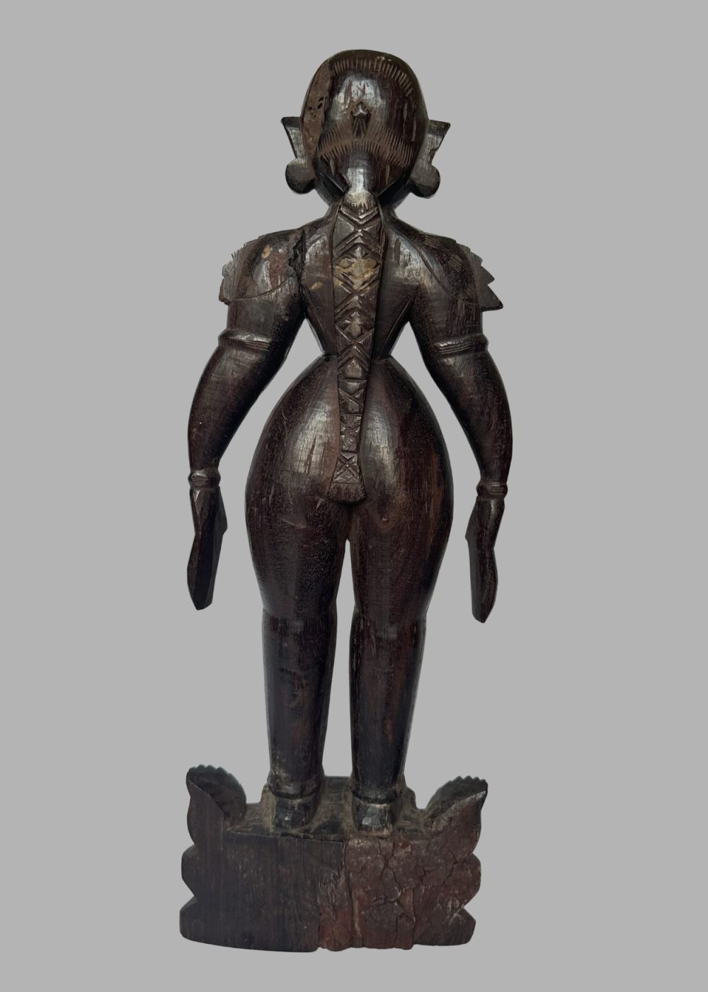 This pair of wooden sculptures, likely from South India, features two elaborately adorned female figures standing on stylized lotus bases. Crafted with precision and symmetry, the figures are depicted with traditional jewelry, ornate hairstyles, and detailed garments, reflecting classical Indian aesthetics. These sculptures may represent celestial beings or royal women, symbolizing beauty, grace, and cultural heritage through the region’s distinctive folk or temple art style.