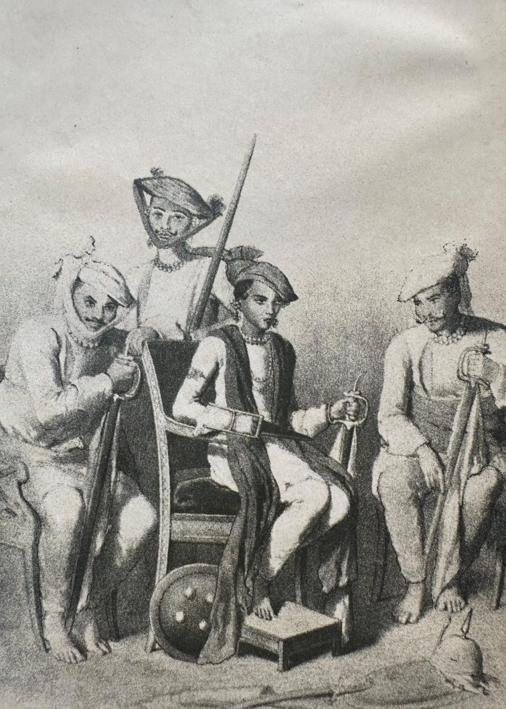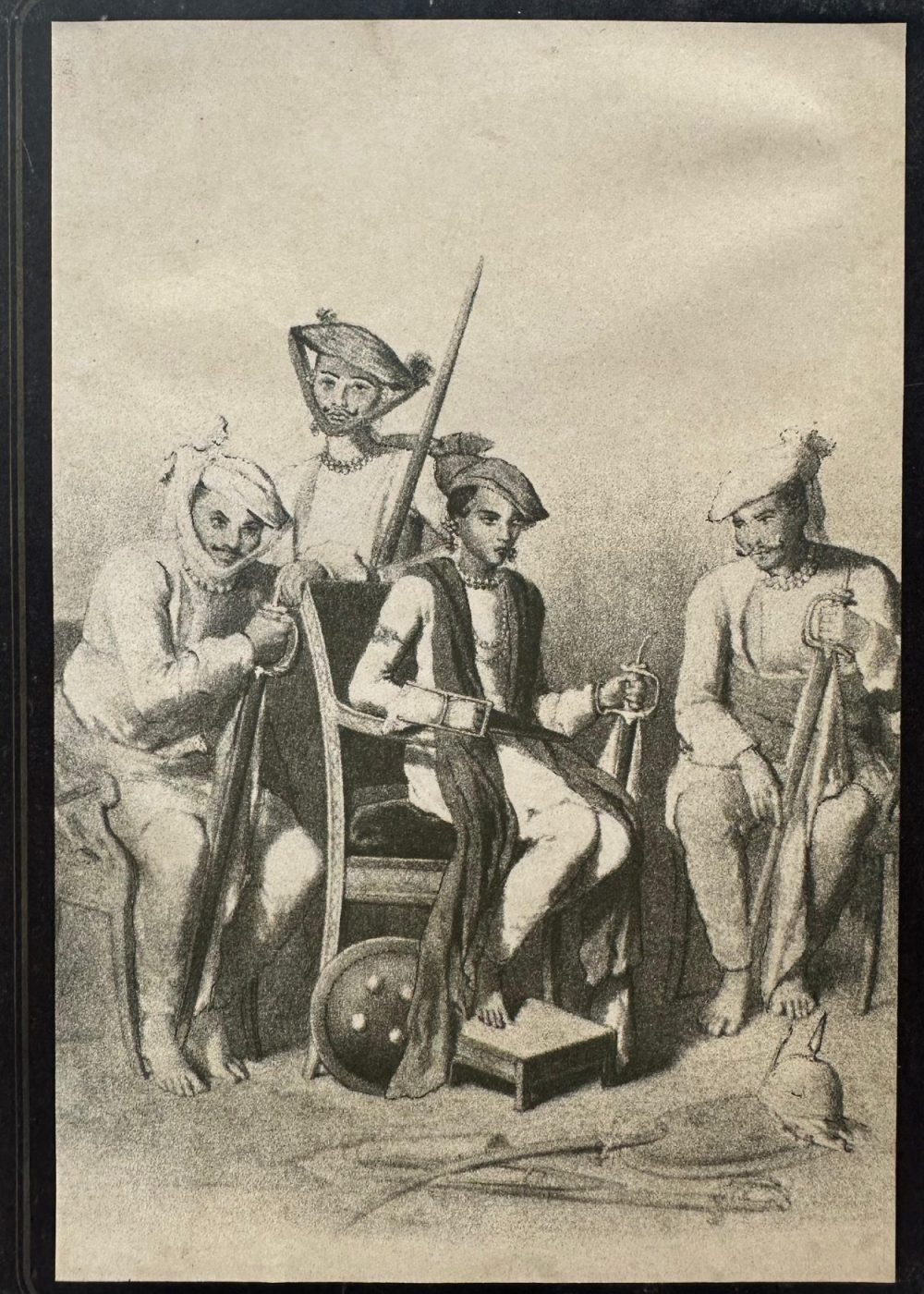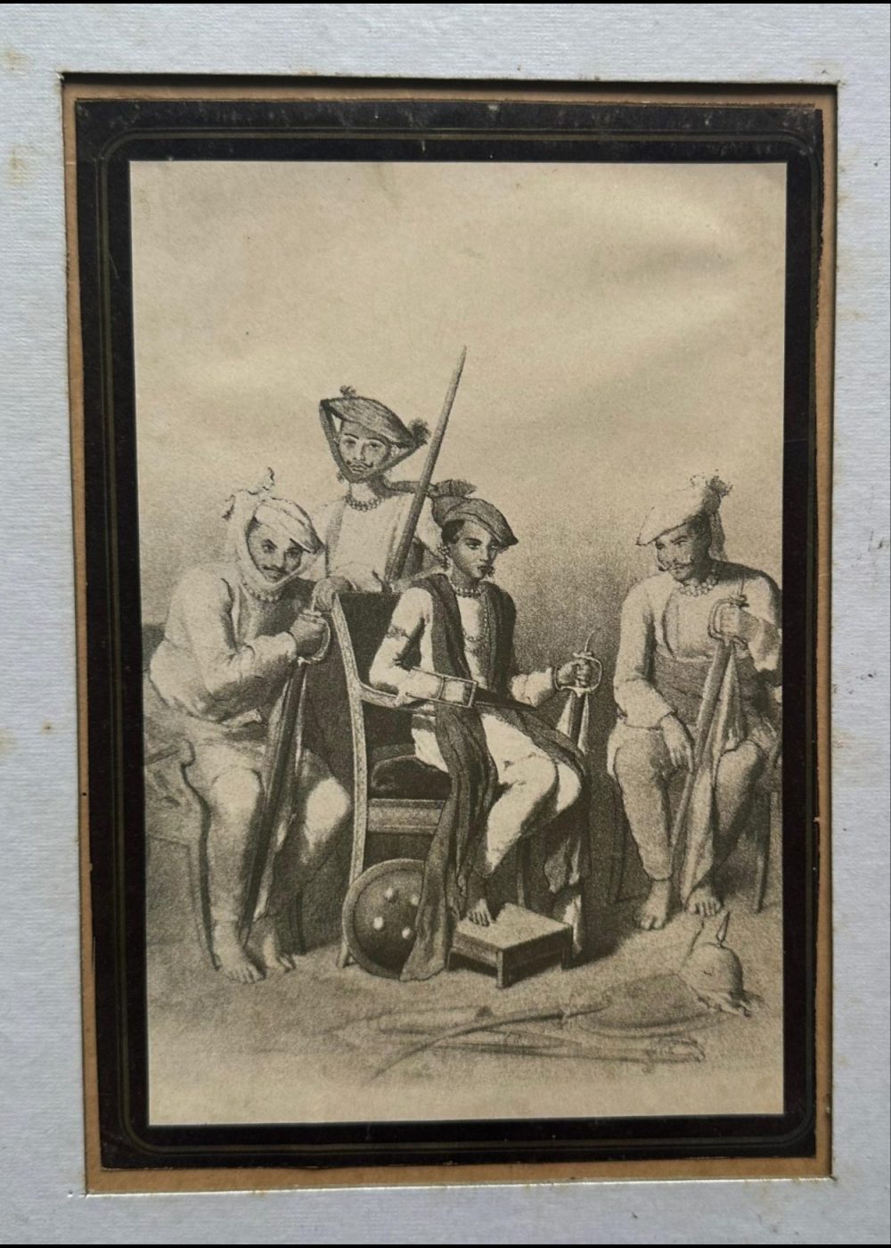 his evocative 19th-century lithographic print portrays a group of Indian nobles or warriors in a moment of discussion or strategic planning. Seated in a semicircle, the central figure occupies an elevated chair, indicating his seniority or leadership, while the others sit closely, engaged and attentive. All figures are dressed in traditional attire, including turbans, jewelry, and flowing garments, and are equipped with swords and daggers — emblematic of their martial role and noble lineage.Objects like the shield, helmet, and laid-out weaponry in the foreground further underscore the martial theme, suggesting a prelude to battle or ceremonial preparation. The careful composition, rich in ethnographic and costume details, reflects colonial-era interest in documenting Indian aristocracy and military traditions with both artistic finesse and documentary intent.