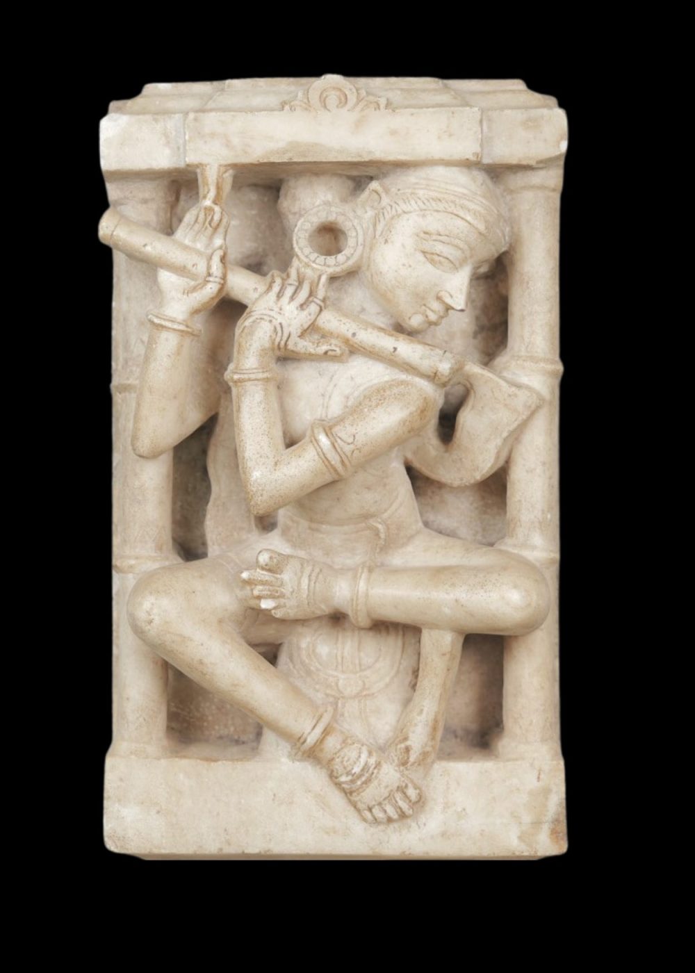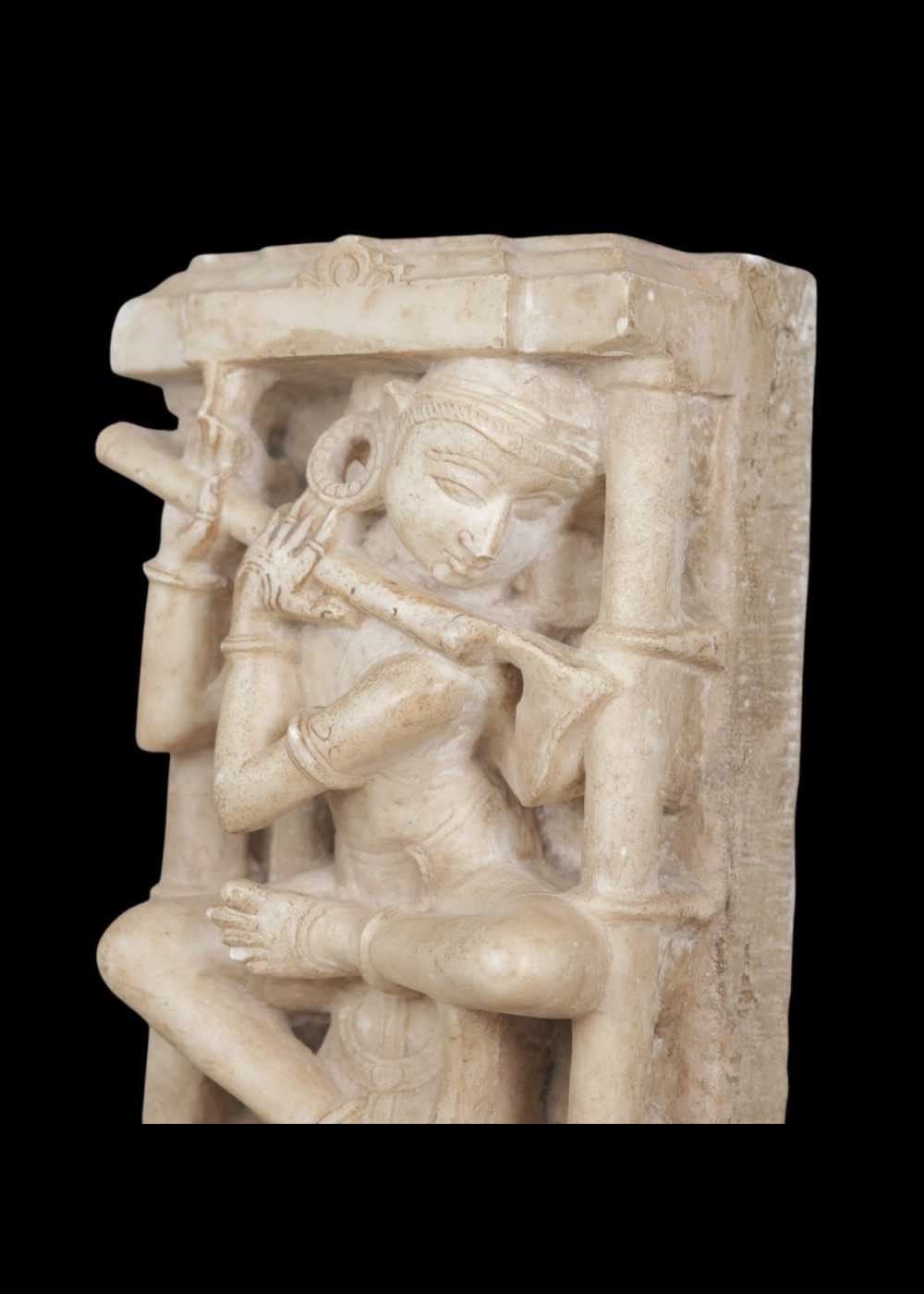 Carved in fine marble, this seated figure depicts a flute player framed within a rectangular niche that echoes temple architecture. The musician sits cross-legged, holding a delicately rendered flute, with expressive detail in the fingers, ornaments, and facial features. Graceful drapery and finely etched jewelry—anklets, bracelets, and earrings—enhance the sculpture’s tactile depth. This piece exemplifies the celebratory role of music in devotional and cultural art, evoking harmony through its balanced composition and serene posture.