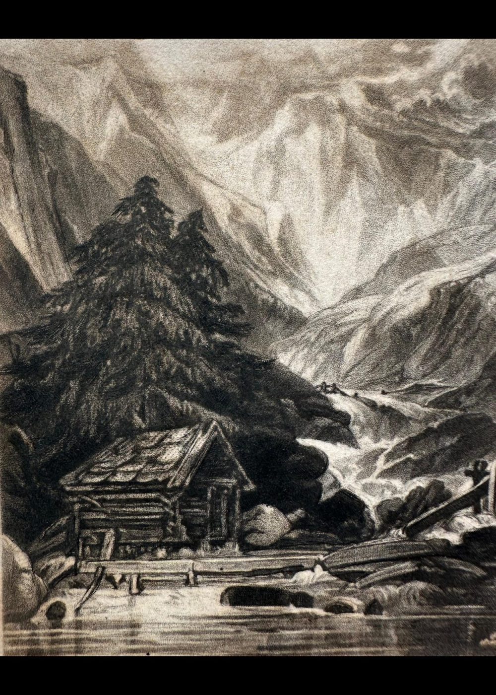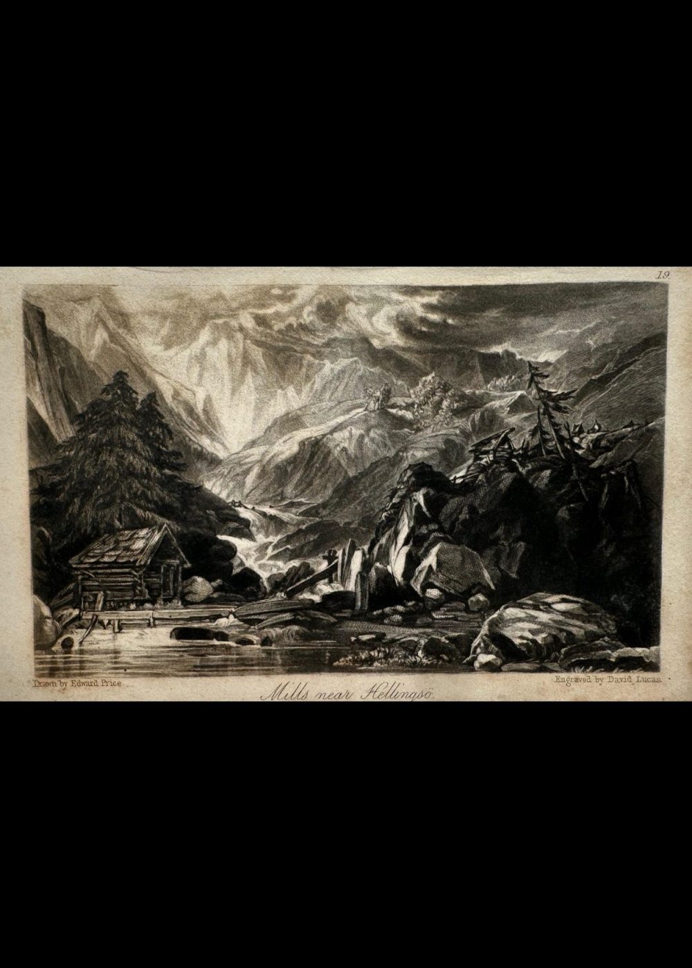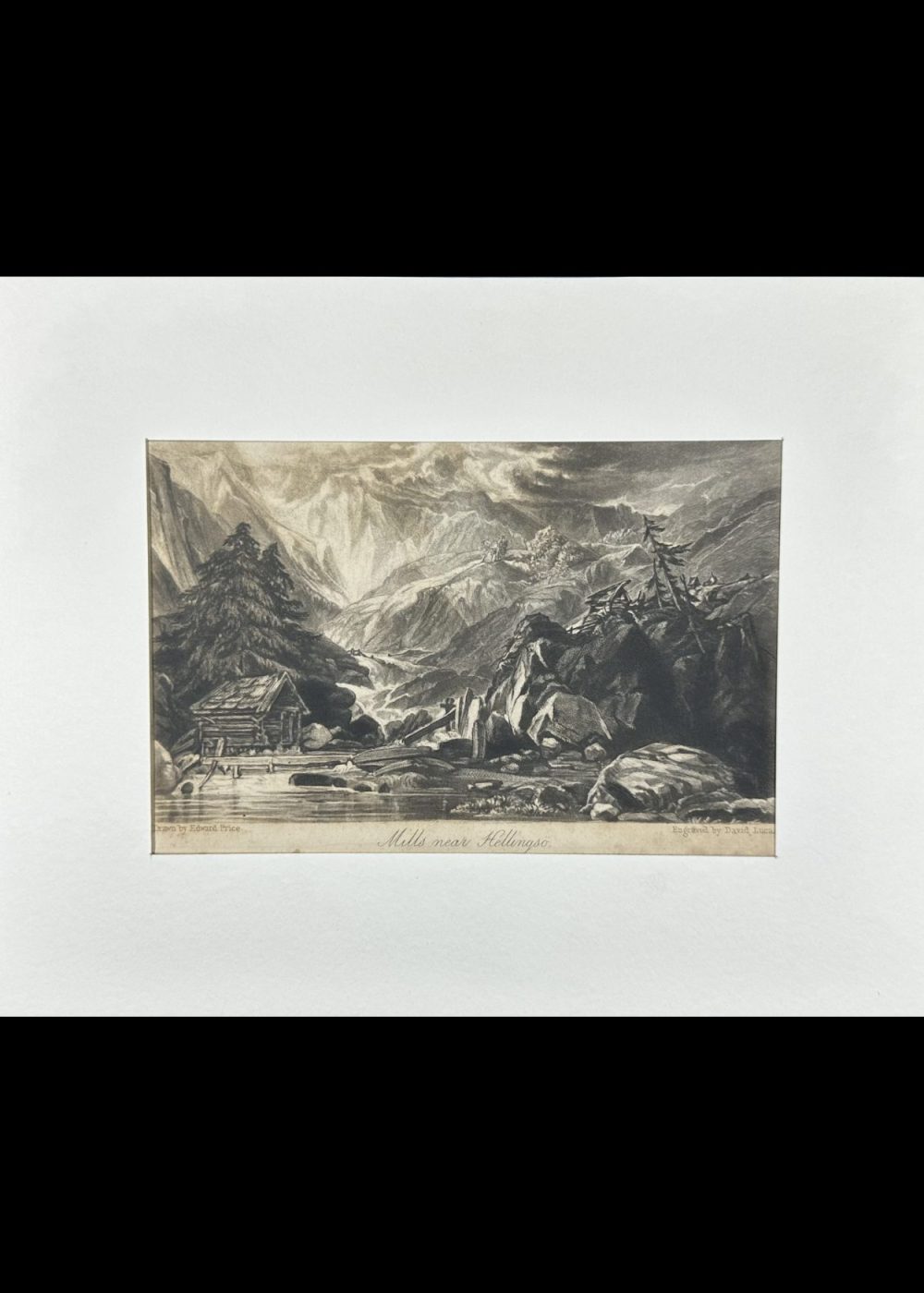 This detailed engraving presents a tranquil rural scene set in a mountainous landscape. A small wooden mill stands beside a flowing stream, surrounded by large rocks and tall trees. Rugged peaks rise in the background, adding depth and drama to the composition. The artwork captures the serene beauty of nature and the quiet presence of human craftsmanship, characteristic of Romantic-era landscape engravings.