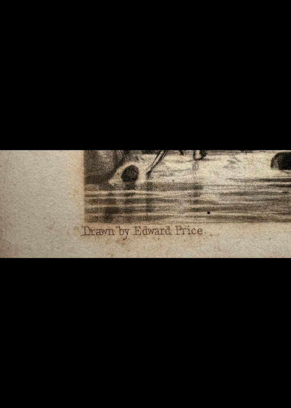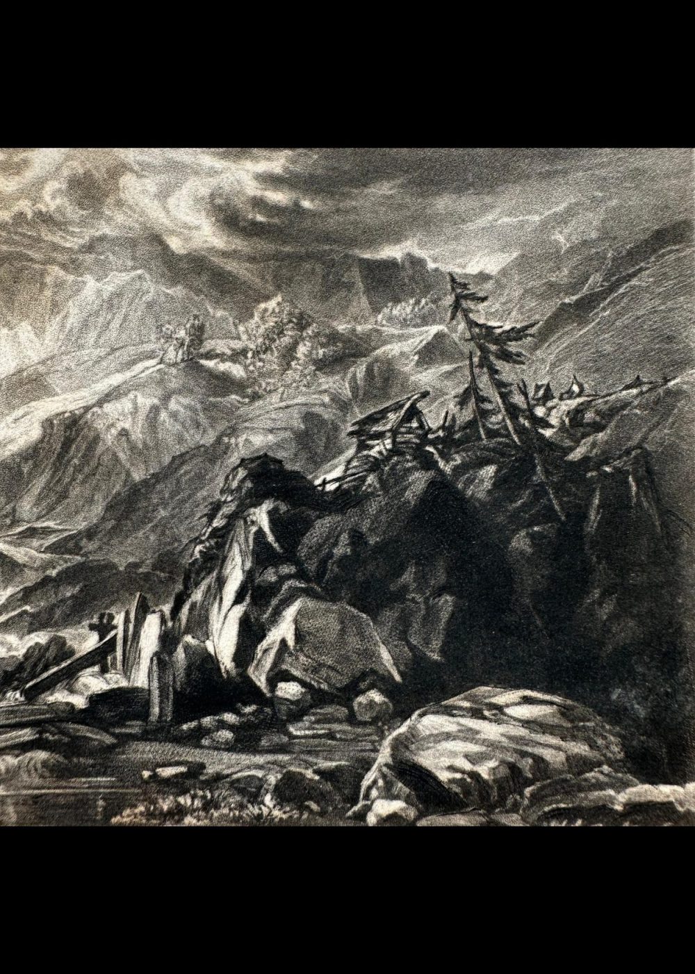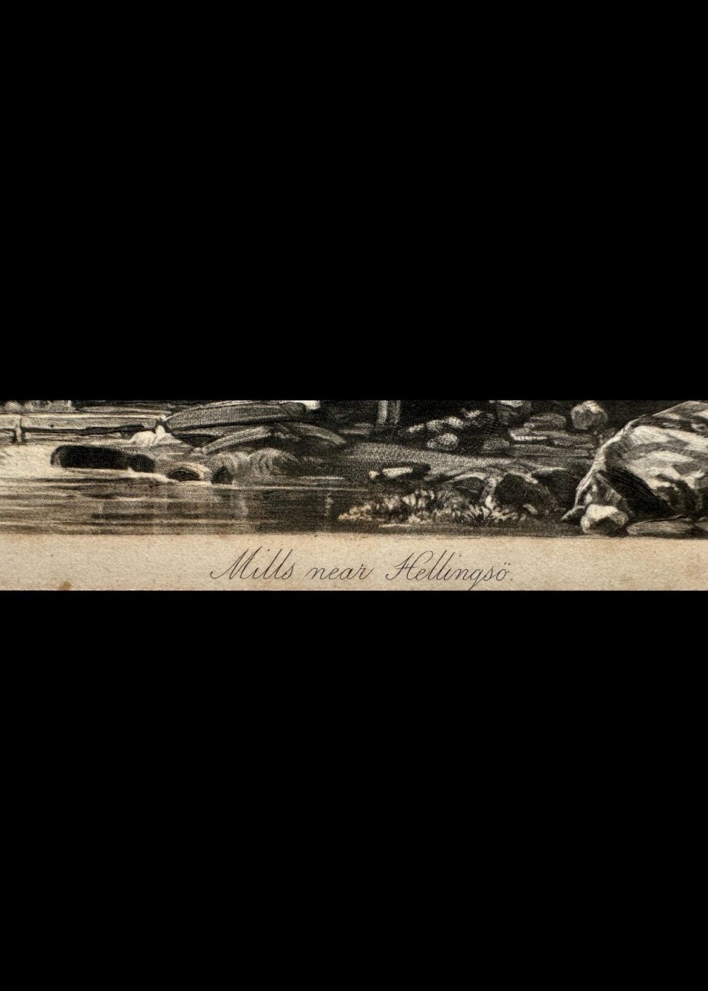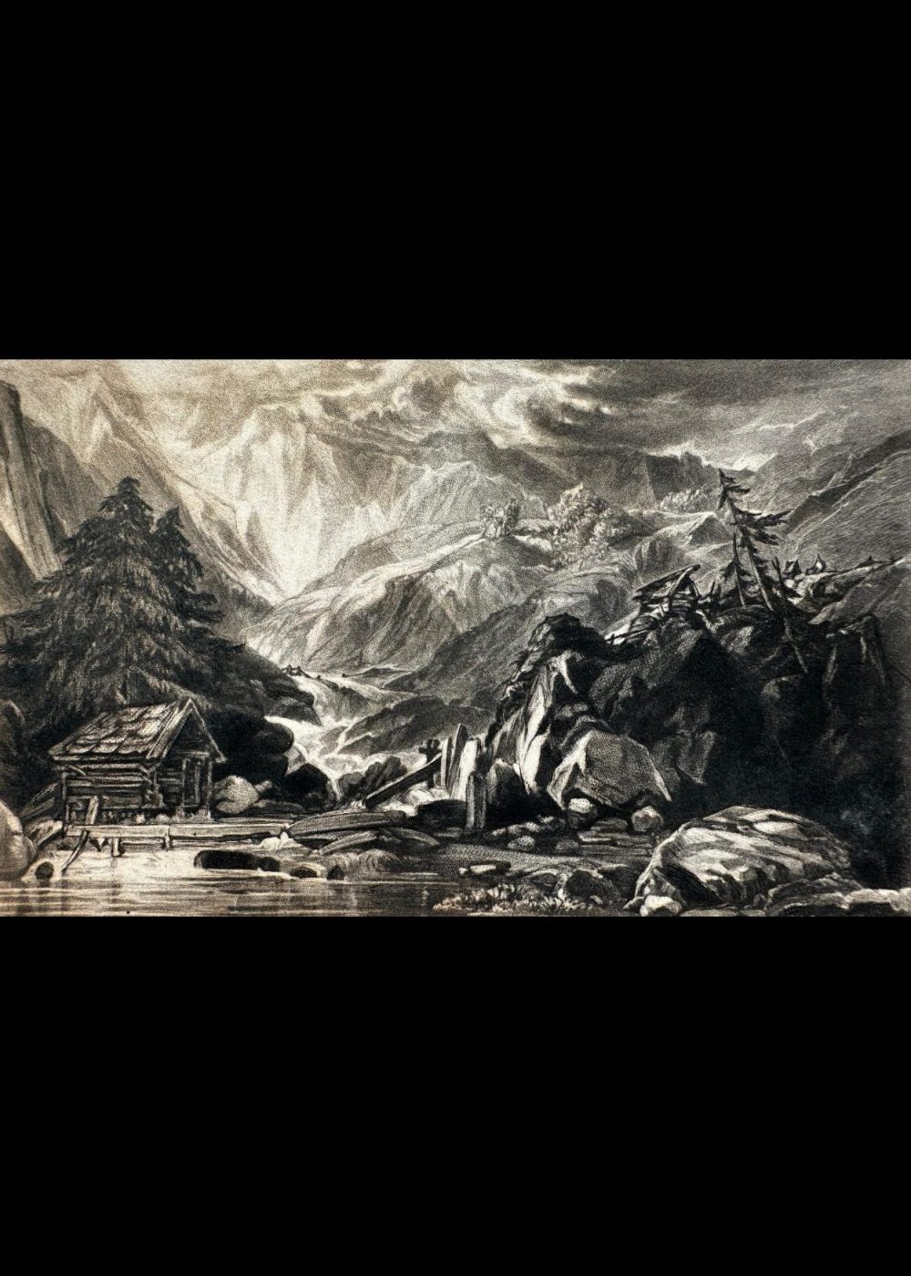 This detailed engraving presents a tranquil rural scene set in a mountainous landscape. A small wooden mill stands beside a flowing stream, surrounded by large rocks and tall trees. Rugged peaks rise in the background, adding depth and drama to the composition. The artwork captures the serene beauty of nature and the quiet presence of human craftsmanship, characteristic of Romantic-era landscape engravings.