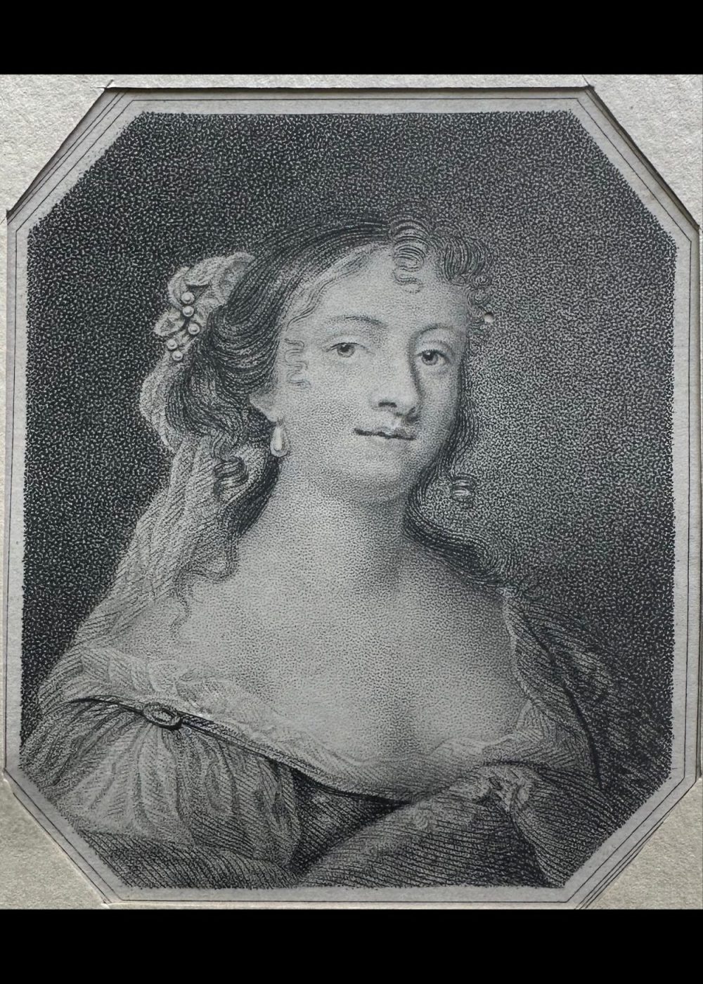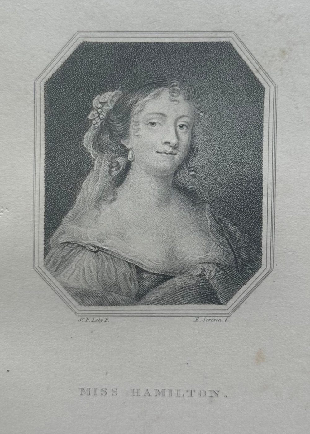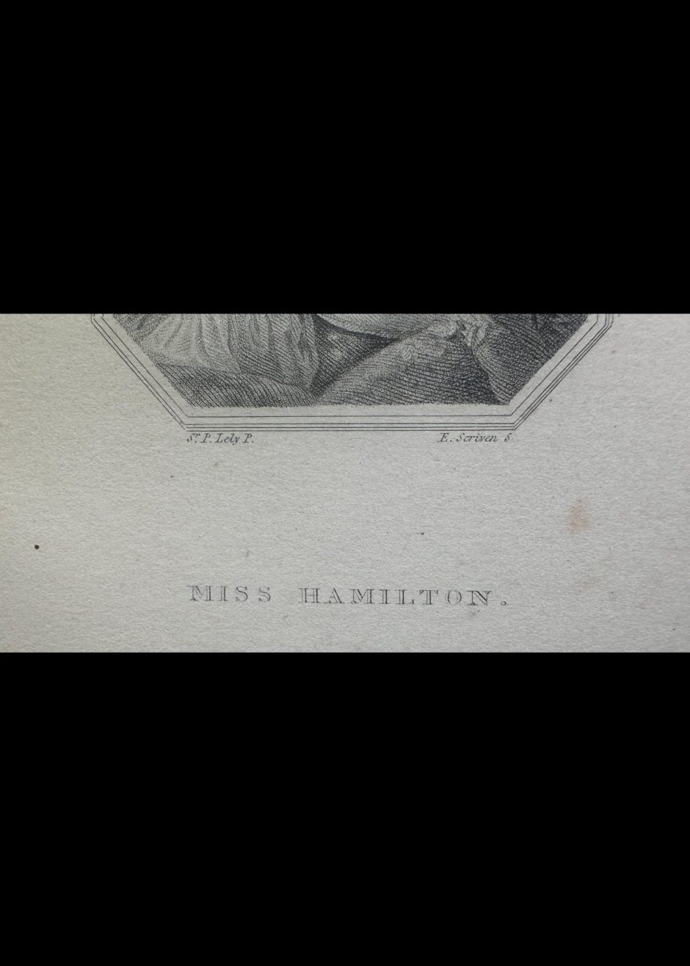 This refined stipple engraving presents “Miss Hamilton,” based on an original painting by Sir Peter Lely (noted as “Sr P. Lely P.”) and engraved by E. Scriven. The sitter is elegantly posed, gazing confidently at the viewer with soft facial features and a composed demeanor. Her flowing hair is adorned with pearls and flowers, complementing the graceful drapery of her gown. This portrait reflects the idealized feminine beauty of the Restoration period, rendered with meticulous detail and delicate shading characteristic of Lely’s courtly style.