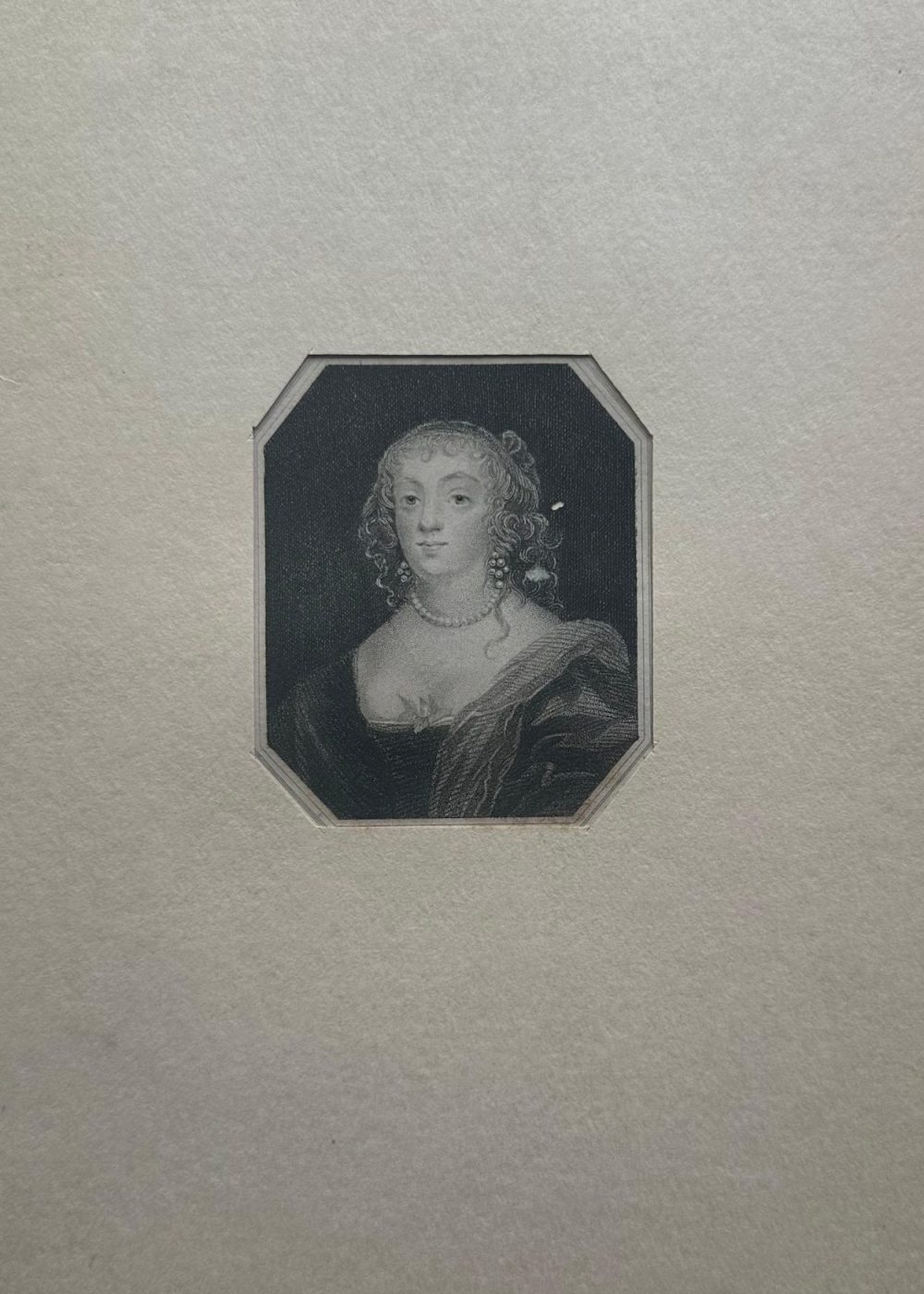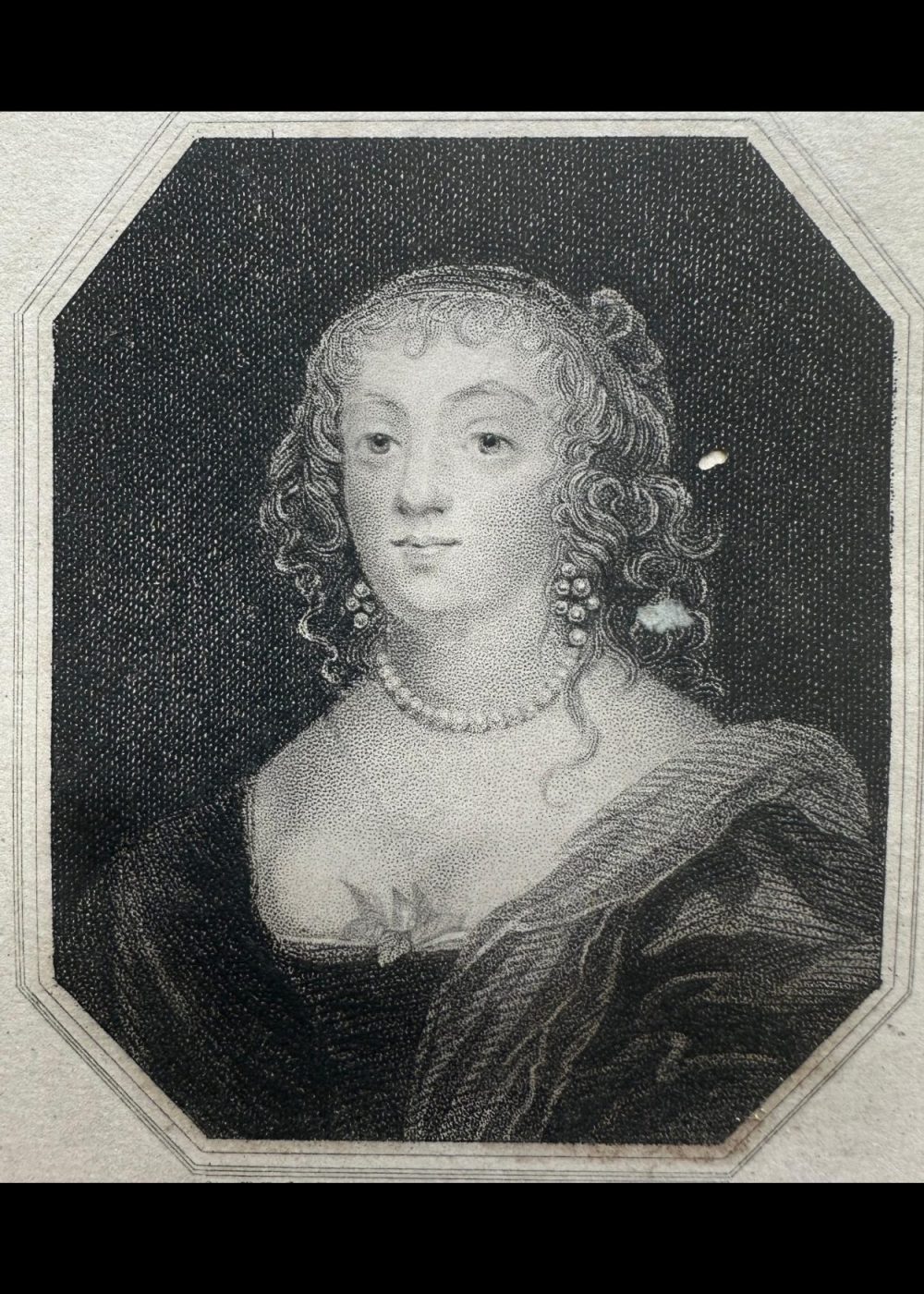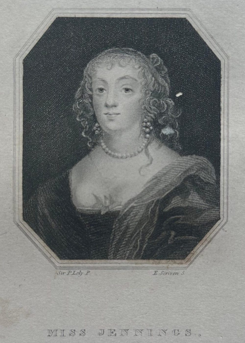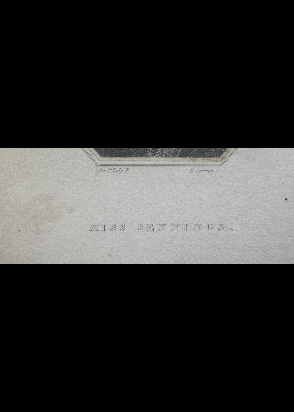 Miss Jennings France Talbot [Nee Jenyns (Jennings)] Duchess of Tryconnel (formerly Lady Hamilton) (Circa 1648 – 1731), famous beauty. Former Wife of Sir George Hamilton, and Later Wife of 1st Duke of Tryconnel. Publish 1810. This finely detailed engraving depicts Miss Jennings, a historical figure from the 17th century, portrayed with elegance and poise. She is shown wearing a richly textured garment, adorned with pearl jewelry including earrings and a necklace. Her curled hair is styled in the fashion of the period. The engraving, executed by E. Scriven after an original by Sir Peter Lely, reflects the refined portraiture style typical of Lely’s courtly representations.