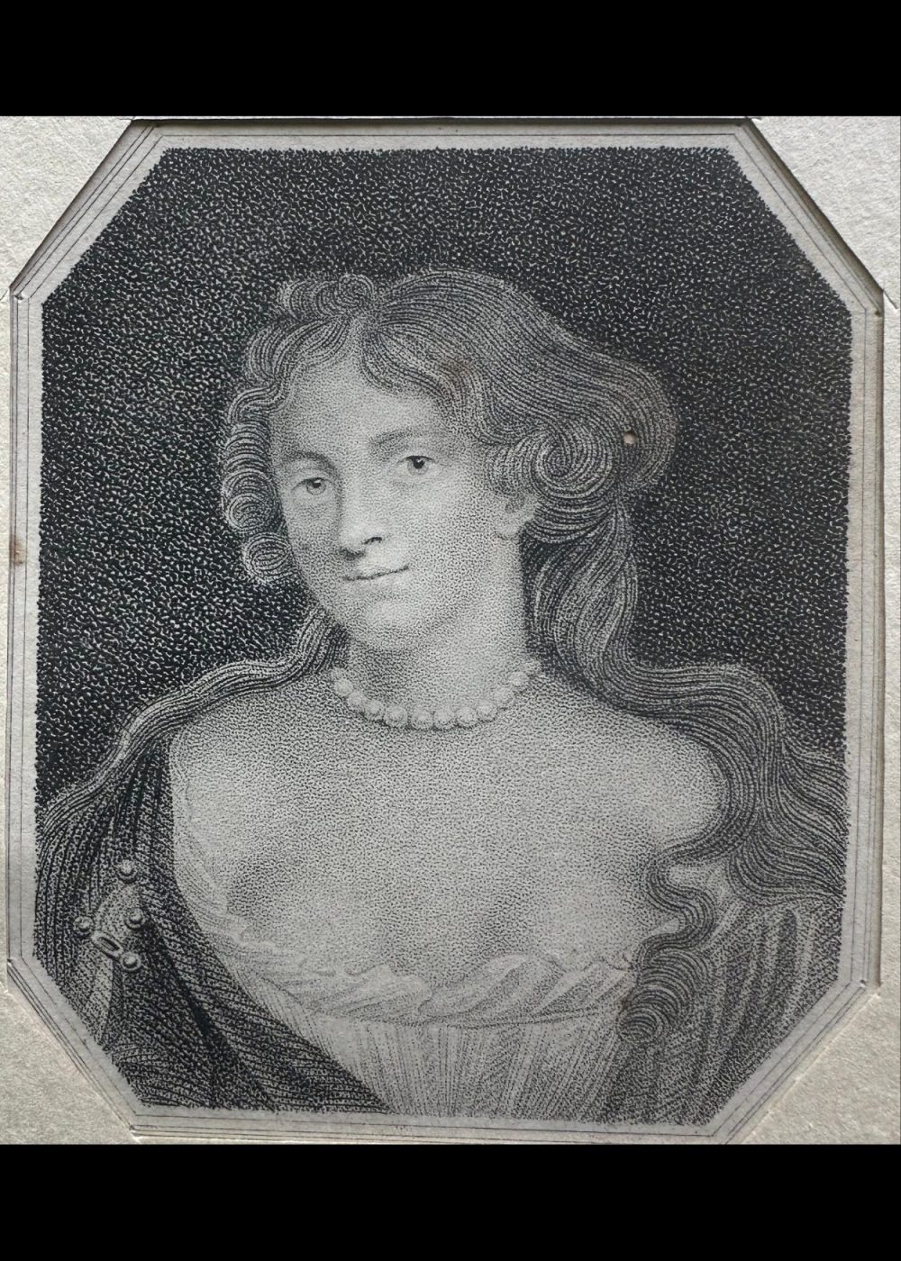 Miss Price Earlier this engraving was Published in London October, 6th 1792. This elegant stipple engraving features “Miss Price,” after a painting by Sir Peter Lely (noted as “P. Lely P.”) and engraved by B. Scriven. The sitter is portrayed with soft curls framing her face, wearing a pearl necklace and a loosely draped gown, typical of Restoration portraiture. Her calm, poised expression and modest adornment emphasize grace and refined femininity. The detailed stippling technique enhances the texture and depth, capturing the delicate charm of the subject with classical restraint.