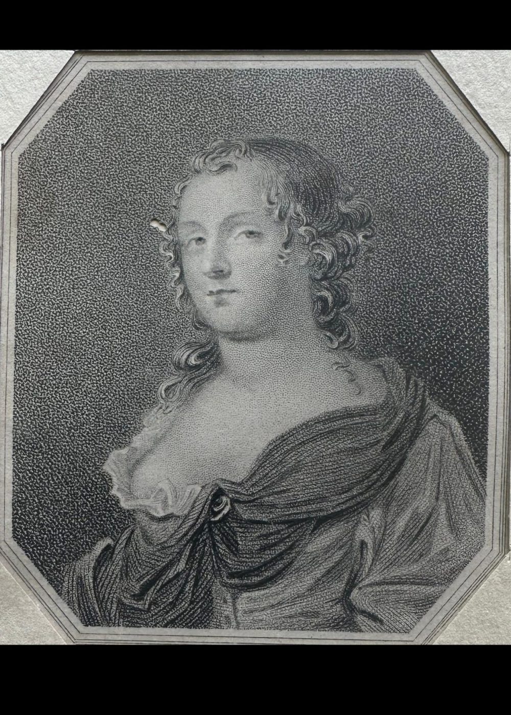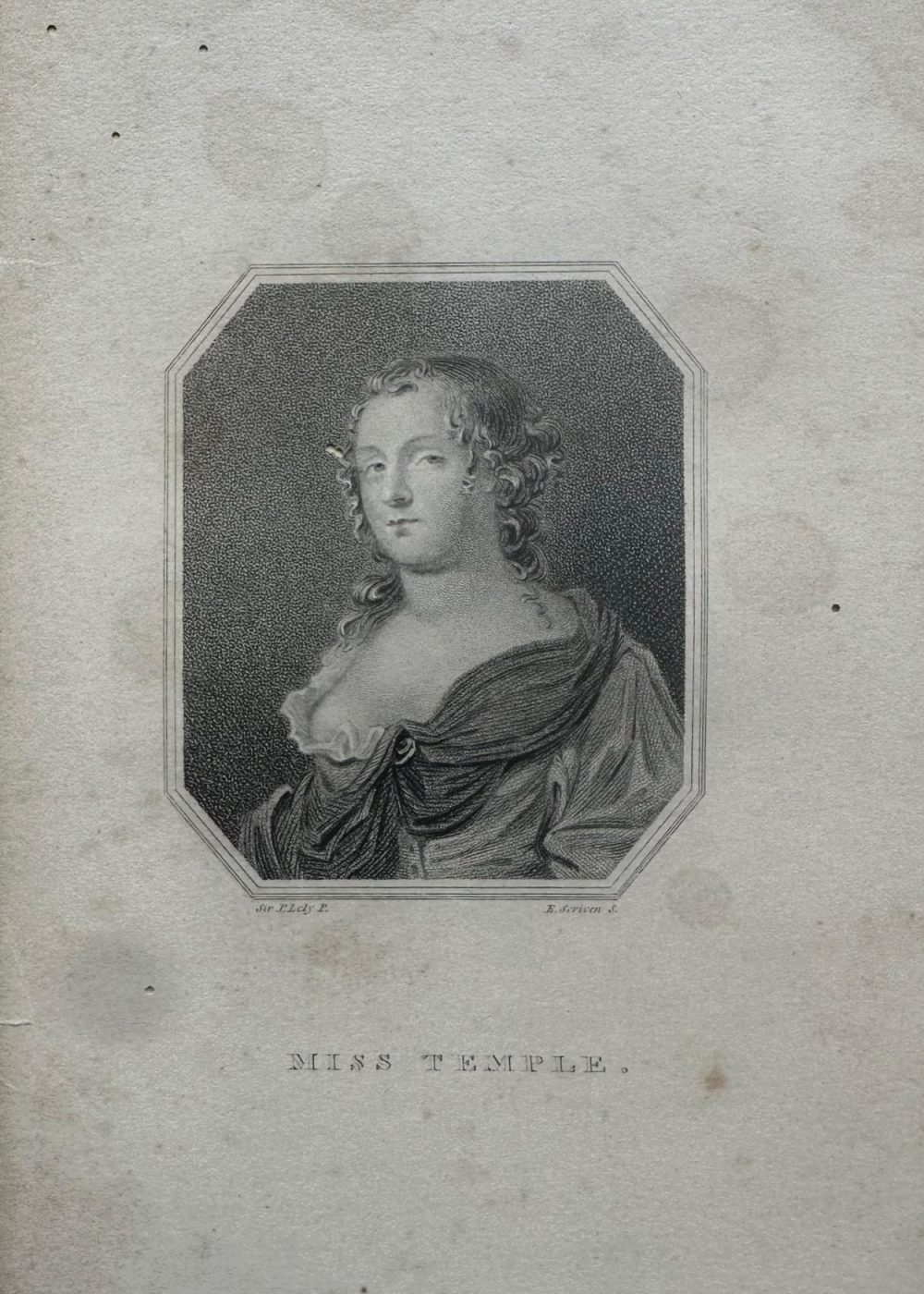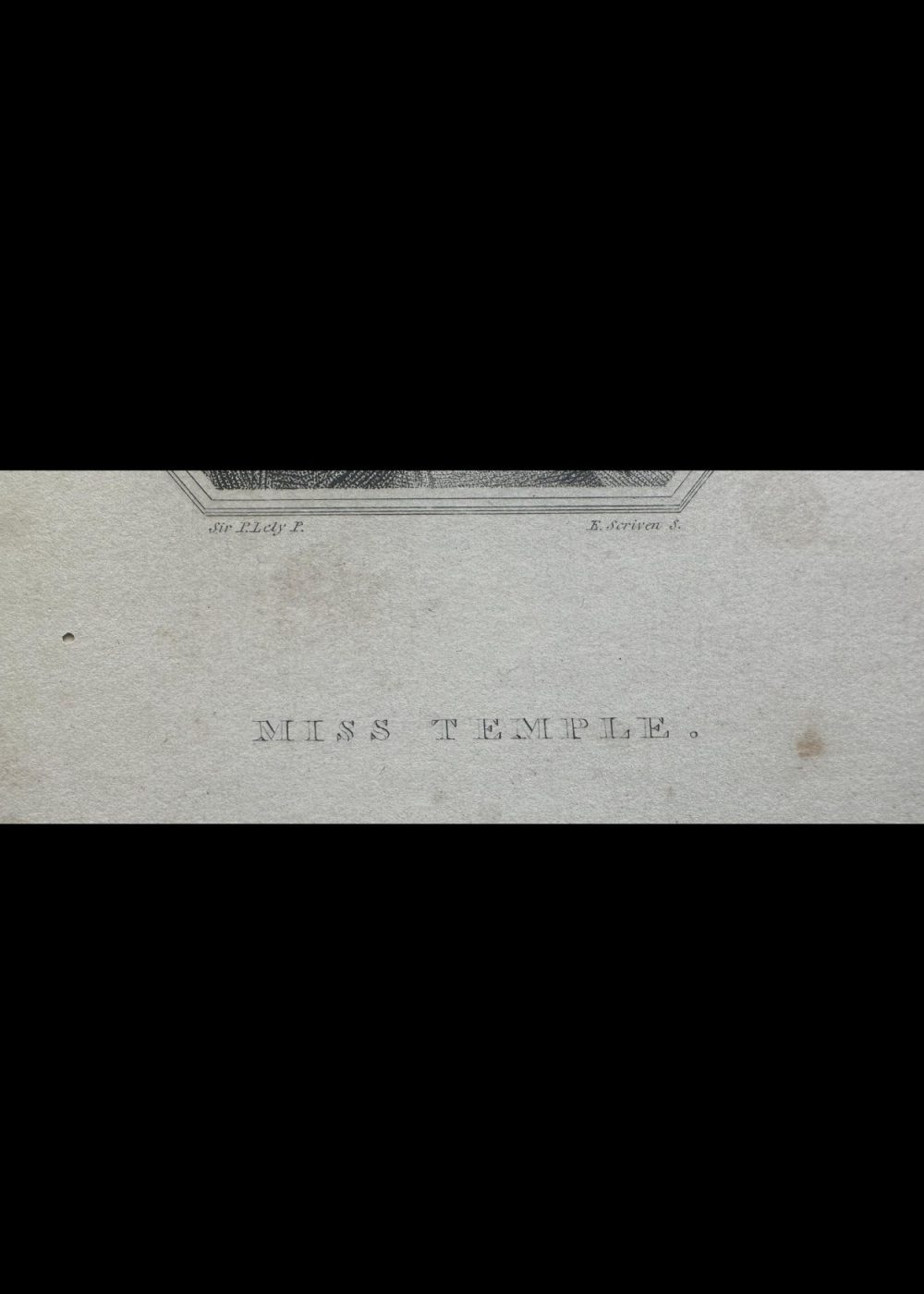 She died in England 1848 (Publish 1810). This refined portrait engraving presents Miss Temple, elegantly posed with softly curled hair and draped in classical attire. Her calm expression and flowing garments reflect the style and grace of 17th-century portraiture. The image is based on a painting by Sir Peter Lely, a prominent court painter, and was engraved by E. Scriven with delicate stippling and fine line work.