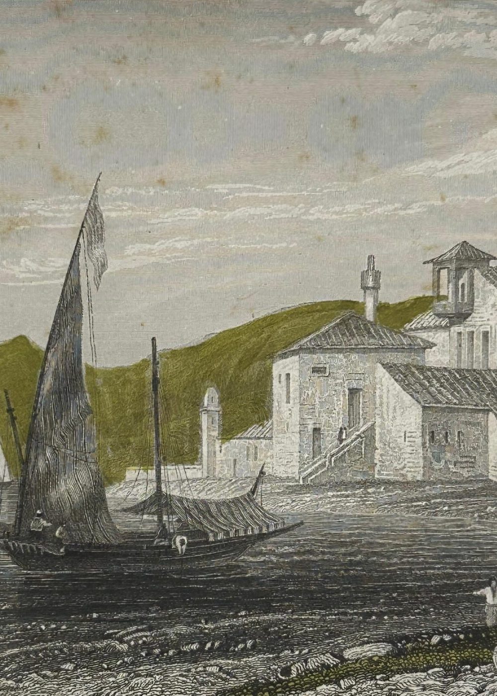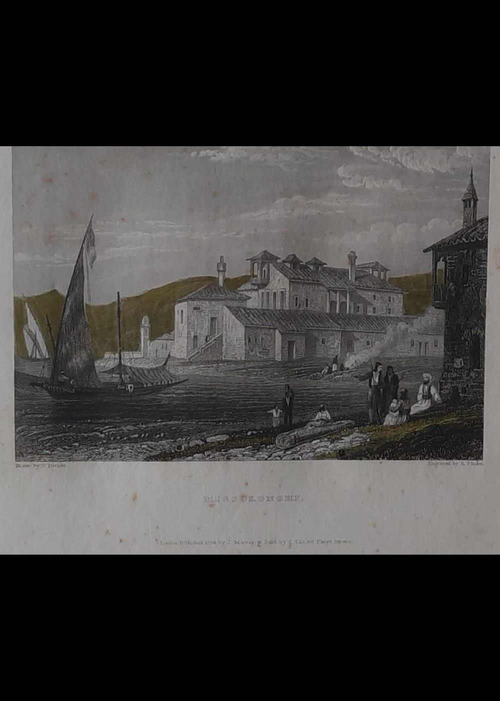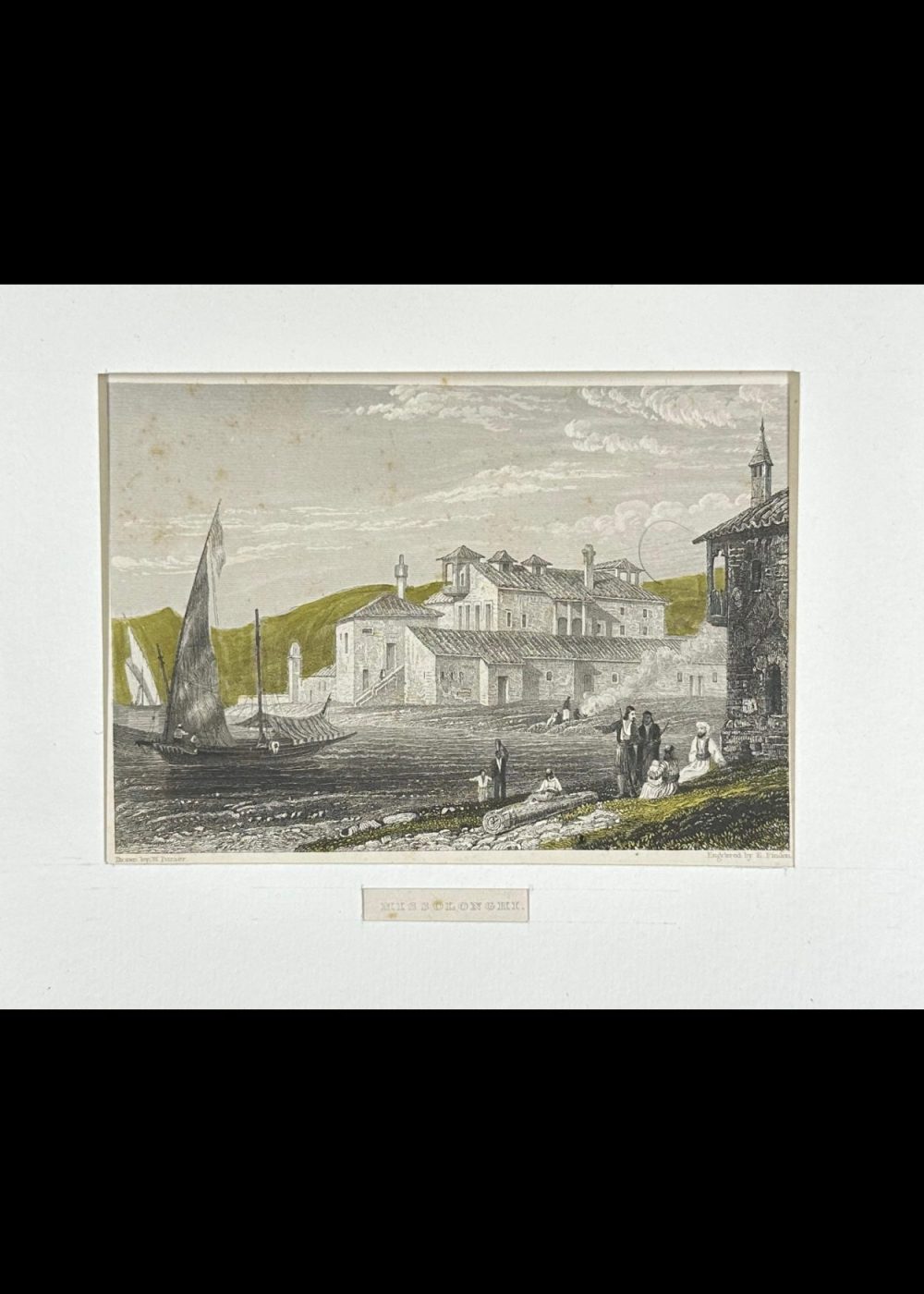 This detailed engraving captures a waterfront view of Missolonghi, a historic Greek town known for its role in the Greek War of Independence. Stone buildings with tiled roofs line the shore, while smoke rises from chimneys, suggesting daily village life. In the foreground, figures in traditional Greek attire converse and relax near the water’s edge. A small sailboat glides across the calm bay, enhancing the tranquil coastal atmosphere. Drawn by J. Hardwick and engraved by E. Finden, the print was published in 1834 by J. Murray. It offers a peaceful yet poignant glimpse of a town deeply linked to Greece’s struggle for freedom.