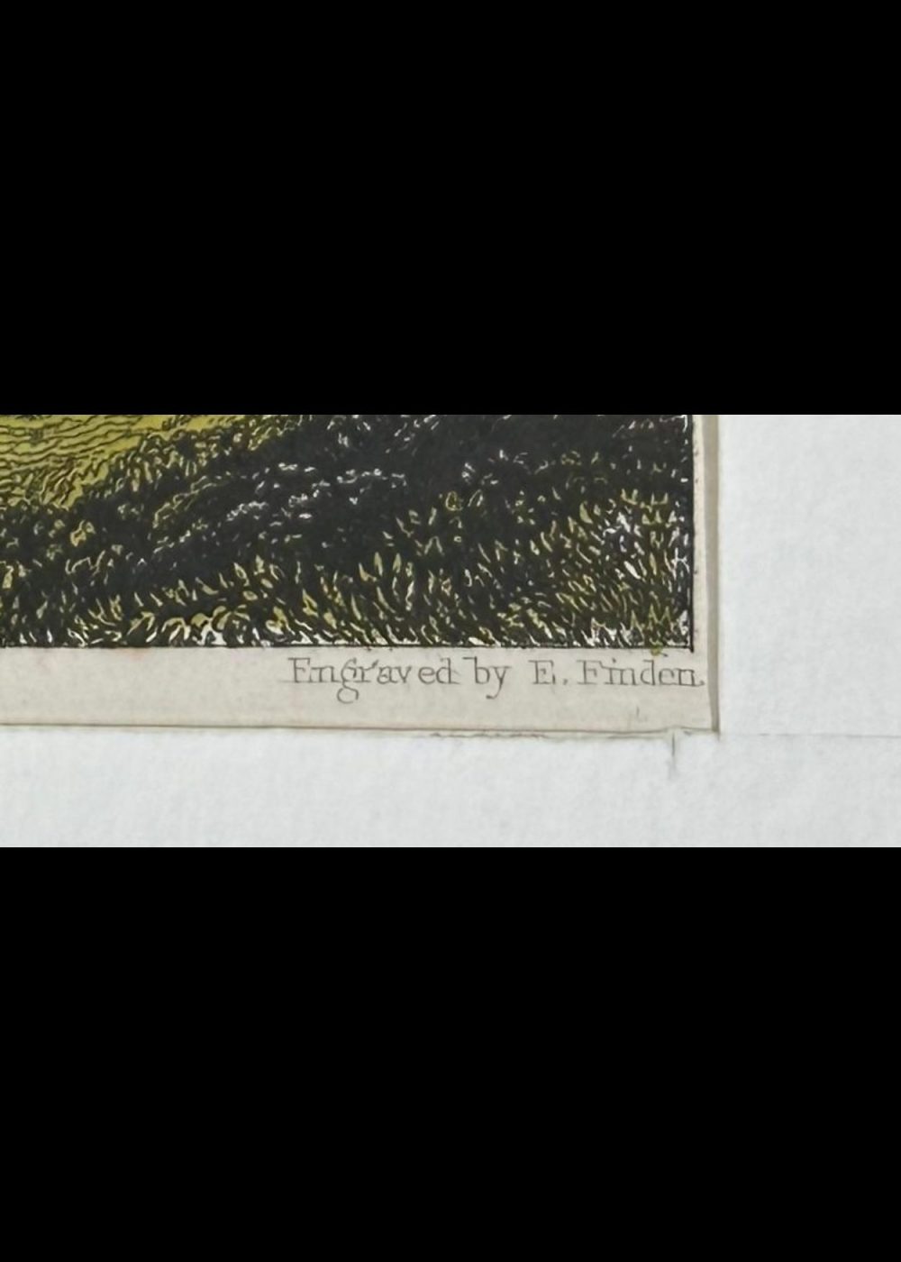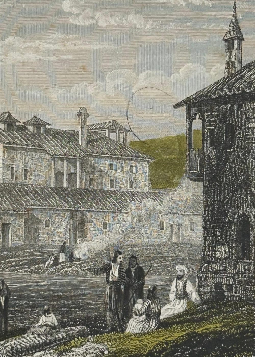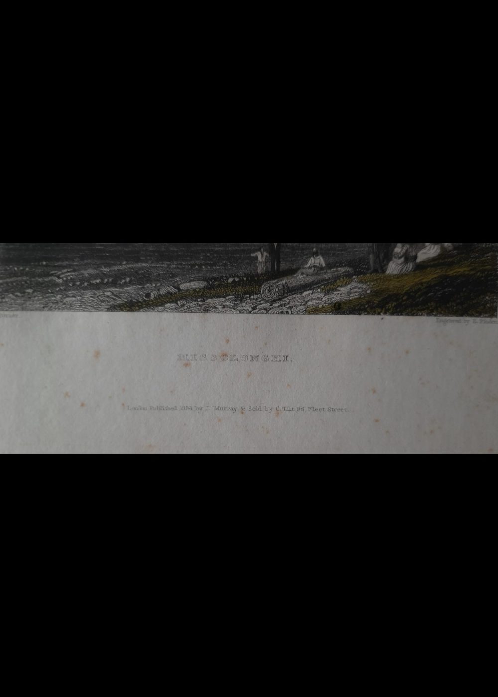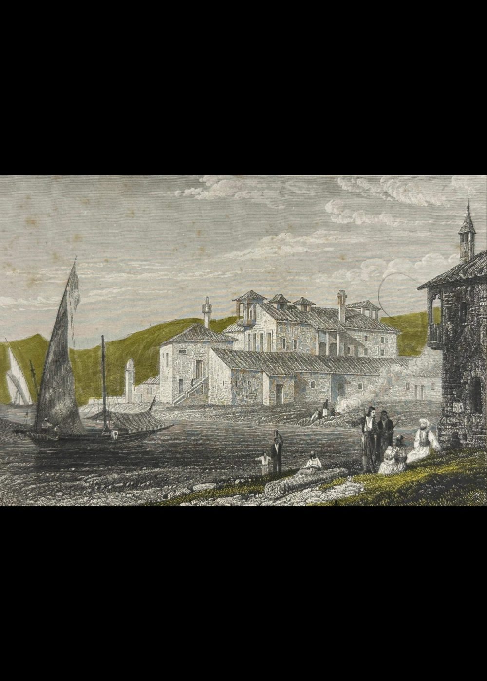 This detailed engraving captures a waterfront view of Missolonghi, a historic Greek town known for its role in the Greek War of Independence. Stone buildings with tiled roofs line the shore, while smoke rises from chimneys, suggesting daily village life. In the foreground, figures in traditional Greek attire converse and relax near the water’s edge. A small sailboat glides across the calm bay, enhancing the tranquil coastal atmosphere. Drawn by J. Hardwick and engraved by E. Finden, the print was published in 1834 by J. Murray. It offers a peaceful yet poignant glimpse of a town deeply linked to Greece’s struggle for freedom.