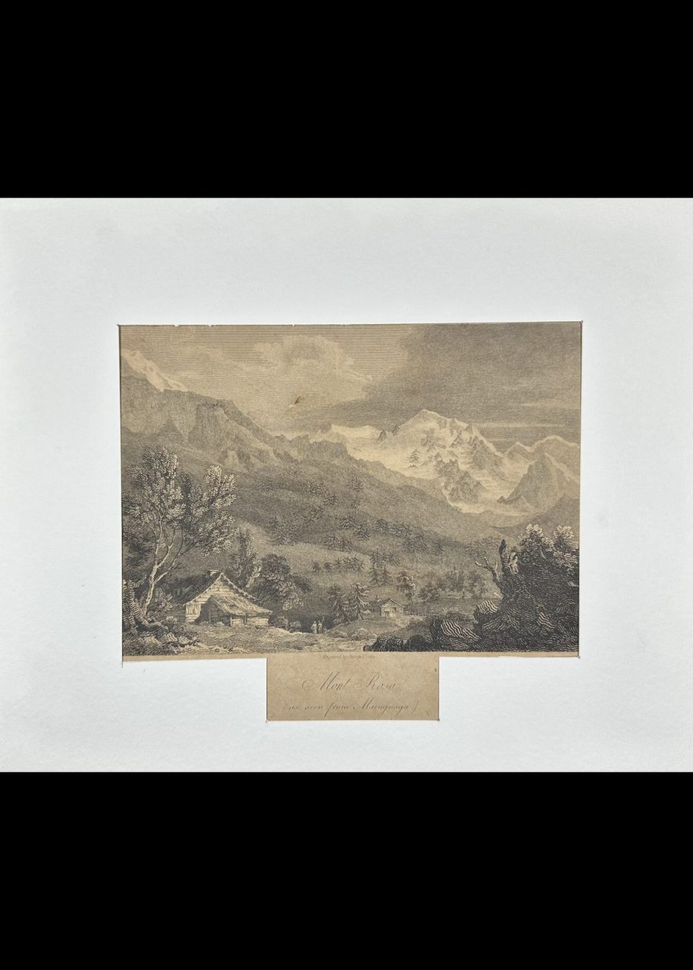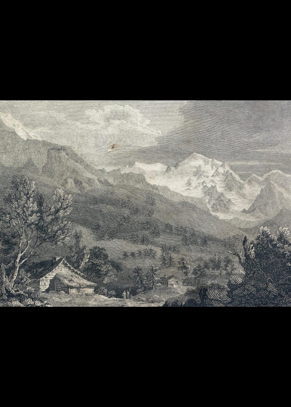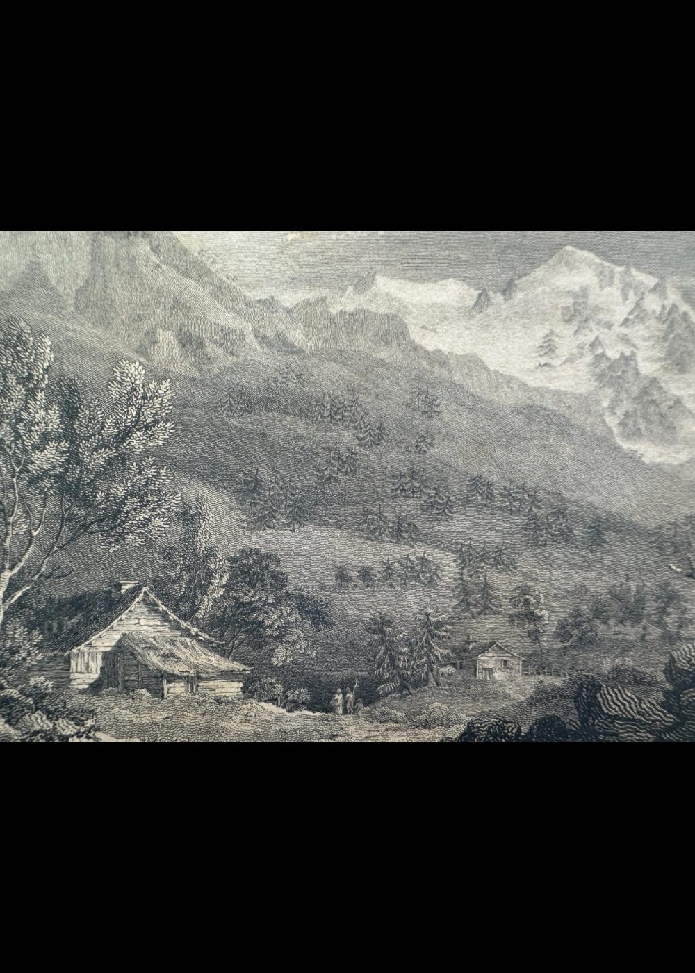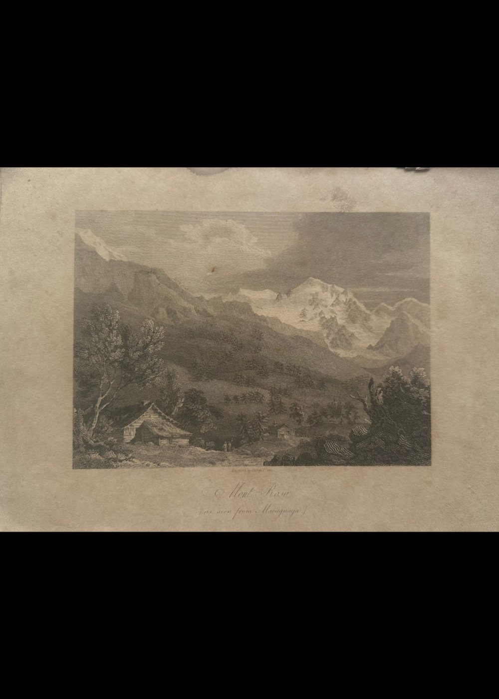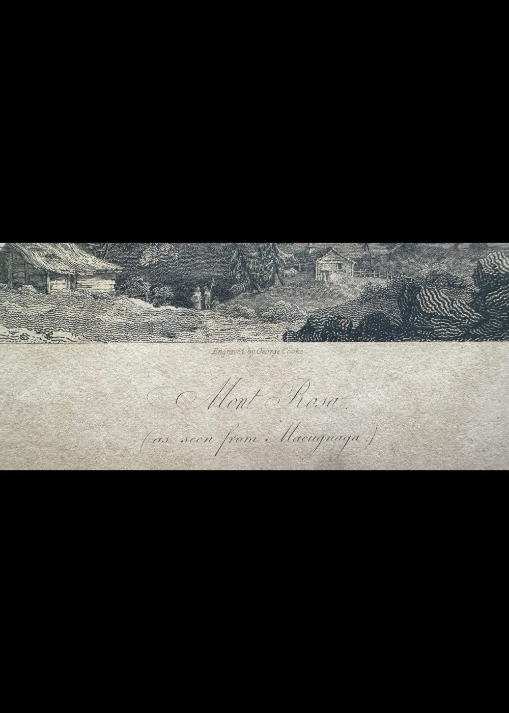 This is a finely detailed vintage engraving titled “Mont Rosa (as seen from Macugnaga)”, engraved by George Cooke. The scene presents a sweeping view of the Monte Rosa massif—the second highest mountain in the Alps—rising majestically in the background. The towering, snow-covered peaks are rendered with dramatic texture, giving a strong sense of their scale and ruggedness. In the foreground, the engraving depicts a tranquil rural setting near the village of Macugnaga, located in the Italian Alps. A rustic chalet is nestled among tall trees and gently rolling terrain, with figures visible near the house, adding a sense of everyday alpine life. The forested midground leads the viewer’s eye toward the majestic mountains beyond, with layers of ridges and slopes receding into the distance. The scene captures both the sublime power of the alpine landscape and the peaceful charm of the human presence within it, a hallmark of Romantic-era landscape art. The fine linework and soft shading emphasize both natural grandeur and intimate detail.